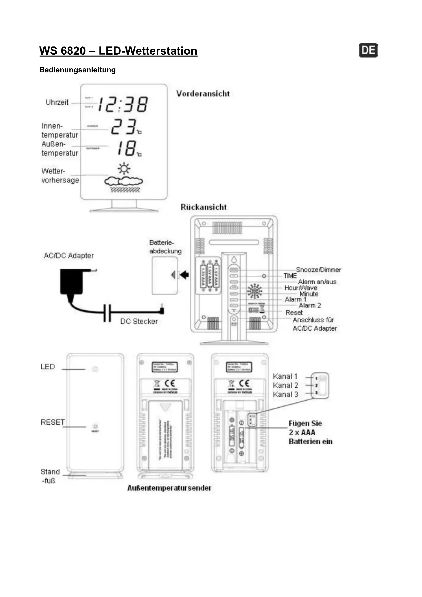 - Nahe metallischer Gegenstände Platzieren Sie die Station an einem Ort mit optimalem Empfang, z.B. in der Nähe von Fenstern und entfernt zu metallischen oder elektrischen Gegenständen. INBETRIEBNAHME Schritt 1 Stecken Sie den AC/DC-Adapter in eine Steckdose und stecken Sie den DC-Netzteilstecker in den entsprechenden Anschluss an der Rückseite der Wetterstation. Schritt 2 Öffnen Sie die Batterieabdeckung an der Rückseite der Wetterstation und legen Sie 3 x AAA Batterien (nicht enthalten) in das Batteriefach in der Rückseite der Wetterstation unter Berücksichtigung der korrekten Polarität (+/-). Legen Sie die Batterieabdeckung wieder auf das Batteriefach. Schritt 3 Stellen Sie die Wetterstation und dem Außensender dicht nebeneinander. Öffnen Sie die Batterieabdeckung an der Rückseite des Außensenders. Stellen Sie sicher, dass die Auswahl des Kanals auf Position eins steht (oberste Position) , legen Sie 2 x AAA Batterien (nicht enthalten) unter Berücksichtigung der korrekten Polarität (+/-) in das Batteriefach und legen Sie die Batterieabdeckung wieder auf das Batteriefach. Ihre Wetterstation empfängt in wenigen Sekunden ein Signal von Ihren Außensendern. Notiz: Nur ein Außensender kann von dieser Wetterstation empfangen werden. Beachten Sie, dass der Außensender nur im absoluten Freifeld (ohne Störquellen) seine maximale Reichweite von 100m nutzen kann. Jede Störquelle, die sich zwischen Außensender und Station befindet (Dächer, Mauern, Böden, Decken, dicke Bäume, etc.), verringert die Reichweite des Senders. Stecken Sie den Halteaufsatz entweder für eine Tischaufstellung unten in den Außensender oder stecken Sie den Halteaufsatz für eine Wandmontage hinten in den Außensender. Platzieren Sie den Außensender an eine trockene und schattige Stelle. Schritt 4 Entfernen Sie den Schutzaufkleber von der Vorderseite. Die Wetterstation ist nun einsatzbereit. Die Wetterstation beginnt das DCF-Zeitsignal zu suchen, nachdem die Wetterstation die Außentemperatur durch den Außensender empfängt . Dieser Vorgang könnte die ganze Nacht über dauern. Stellen Sie die Uhrzeit manuell ein, wenn kein DCF-Zeitsignal empfangen wurde. Während dem Empfang des DCF-Zeitsignals wird Ihr Thermometer keine Temperaturmessung durchführen. Der LCD-Display wird dunkel und erst wieder hell nach dem automatischen Empfang. Nach der ersten Inbetriebnahme benötigen die Temperaturwerte bis zu 30 Minuten um sich zu stabilisieren.Back-up Batterien Die Back-up Batterien versorgen die Wetterstation mit Strom, wenn die Verbindung zu anderen Stromquellen unterbrochen ist. Der LED-Display wird im Back-up Modus ausgeschaltet. Die Uhrzeit und die Alarmzeit bleiben gespeichert, auch während eines Stromausfalls. Die Alarmfunktion funktioniert wie im normalen Betrieb.