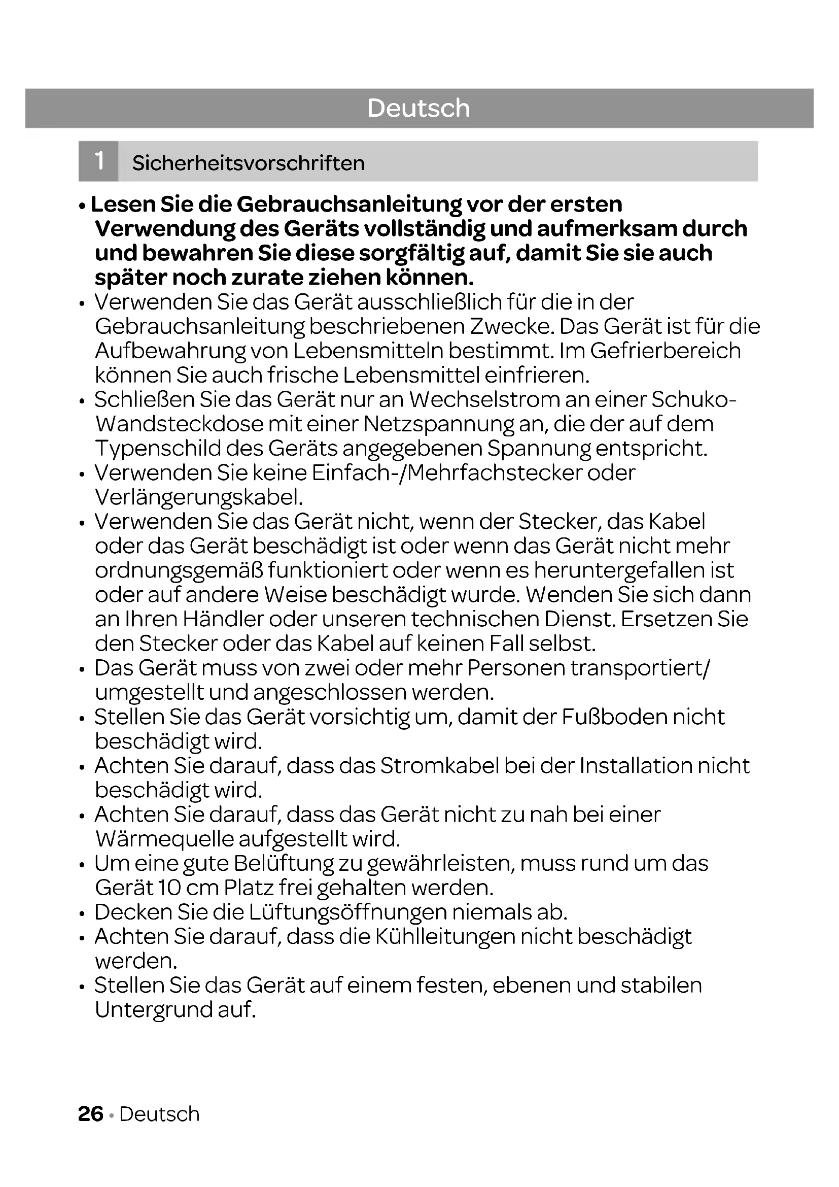 Technical specifications Dimensions (wxdxh) in cm 50 x 54 x 141,8 Nett weight in kg 37,5 kg Gross weight in kg 42 kg Power consumption [W] 70 w Rated voltage [V] / frequency [Hz] 220-240V/ 50Hz Lenght of power cord [m] 1,7 Type of plug VDE plug 90° Note: On the rating label - which you can find on the left inside the appliance - you can also find the technical specifications. English • 25• Lesen Sie die Gebrauchsanleitung vor der ersten Verwendung des Geräts vollständig und aufmerksam durch und bewahren Sie diese sorgfältig auf, damit Sie sie auch später noch zurate ziehen können.