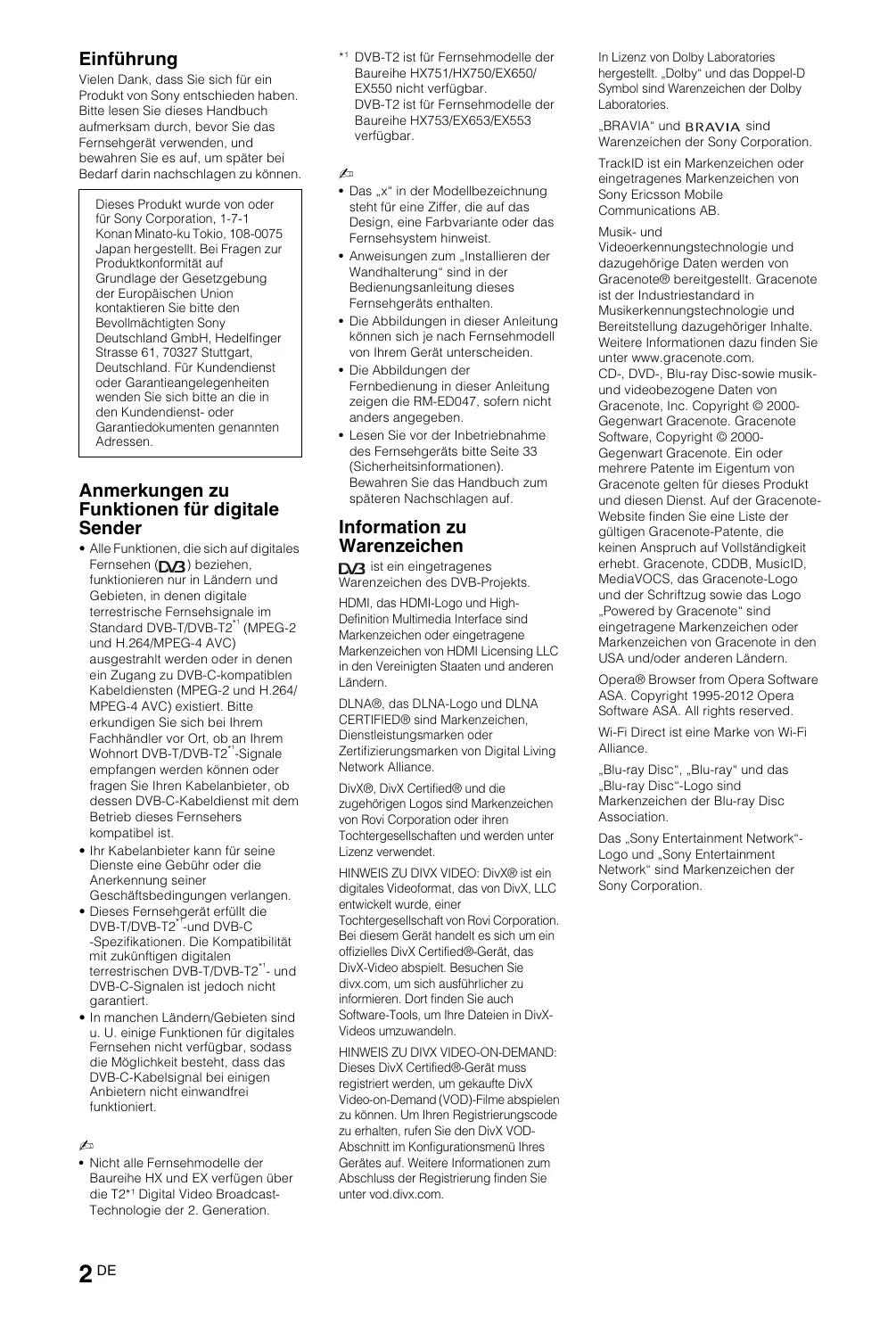 - Nicht alle Fernsehmodelle der Baureihe HX und EX verfügen über die T2*¹ Digital Video BroadcastTechnologie der 2. Generation. 2 DE *¹ DVB-T2 ist für Fernsehmodelle der Baureihe HX751/HX750/EX650/ EX550 nicht verfügbar. DVB-T2 ist für Fernsehmodelle der Baureihe HX753/EX653/EX553 verfügbar.
