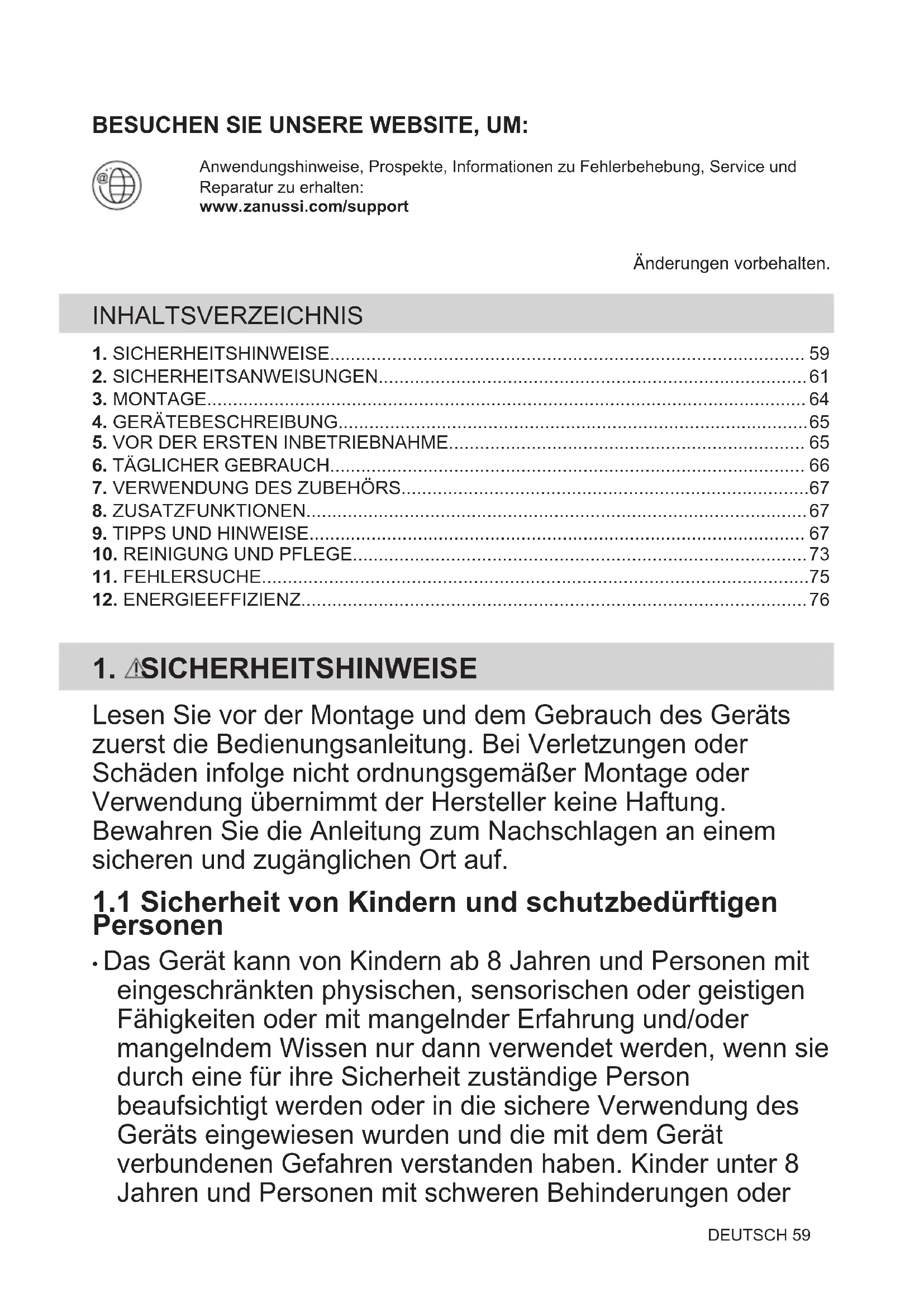 Recyceln Sie Materialien mit dem Symbol . Entsorgen Sie die Verpackung in den entsprechenden Recyclingbehältern. Recyceln Sie zum Umwelt- und Gesundheitsschutz elektrische und elektronische Geräte. Entsorgen Sie Geräte mit diesem Symbol nicht mit dem Hausmüll. Bringen Sie das Gerät zu Ihrer örtlichen Sammelstelle oder wenden Sie sich an Ihr Gemeindeamt. DEUTSCH 77VISITE O NOSSO WEBSITE PARA: Resolver problemas e obter conselhos de utilização, catálogos e informações sobreassistência e reparações:www.zanussi.com/supportSujeito a alterações sem aviso prévio. ÍNDICE