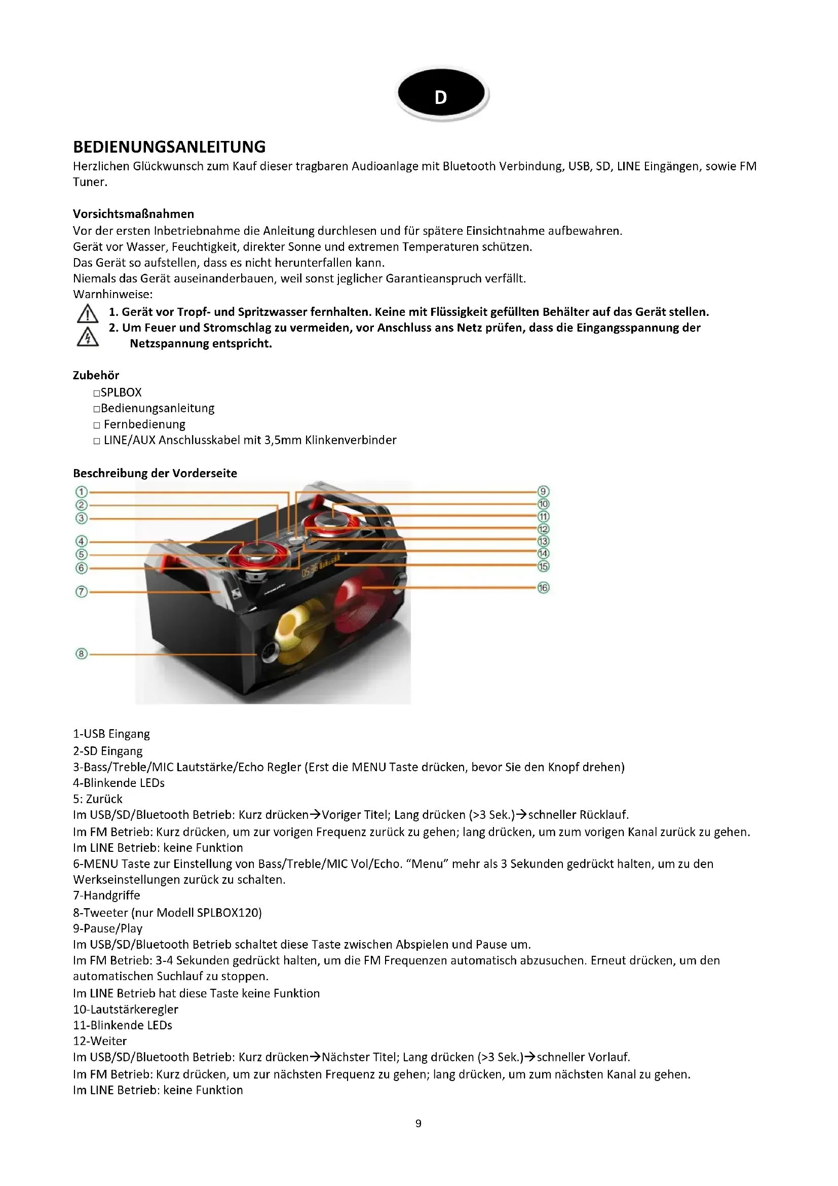 1-USB Eingang 2-SD Eingang 3-Bass/Treble/MIC Lautstärke/Echo Regler (Erst die MENU Taste drücken, bevor Sie den Knopf drehen) 4-Blinkende LEDs 5: Zurück Im USB/SD/Bluetooth Betrieb: Kurz drückenVoriger Titel; Lang drücken (>3 Sek.)schneller Rücklauf. Im FM Betrieb: Kurz drücken, um zur vorigen Frequenz zurück zu gehen; lang drücken, um zum vorigen Kanal zurück zu gehen. Im LINE Betrieb: keine Funktion 6-MENU Taste zur Einstellung von Bass/Treble/MIC Vol/Echo. “Menu” mehr als 3 Sekunden gedrückt halten, um zu den Werkseinstellungen zurück zu schalten. 7-Handgriffe 8-Tweeter (nur Modell SPLBOX120) 9-Pause/Play Im USB/SD/Bluetooth Betrieb schaltet diese Taste zwischen Abspielen und Pause um. Im FM Betrieb: 3-4 Sekunden gedrückt halten, um die FM Frequenzen automatisch abzusuchen. Erneut drücken, um den automatischen Suchlauf zu stoppen. Im LINE Betrieb hat diese Taste keine Funktion 10-Lautstärkeregler 11-Blinkende LEDs 12-Weiter Im USB/SD/Bluetooth Betrieb: Kurz drückenNächster Titel; Lang drücken (>3 Sek.)schneller Vorlauf. Im FM Betrieb: Kurz drücken, um zur nächsten Frequenz zu gehen; lang drücken, um zum nächsten Kanal zu gehen. Im LINE Betrieb: keine Funktion D10 13-Mode: Kurz drücken, um durch die Betriebsarten FM/Bluetooth/LINE IN/USB/SD zu laufen 14-REC (Aufnahme): Ein USB/SD Medium und das Mikrofon anschließen, bevor Sie mit der Aufnahme starten können. Sie können das Mikrofon, das an den LINE IN Buchsen angeschlossene Gerät und FM Radio aufnehmen und auf dem USB/SD Medium speichern. Die REC Taste über 3 Sekunden lang gedrückt halten, um mit der Aufnahme zu beginnen. Kurz drücken, um die Aufnahme abzuspielen. 15-LED Display 16-Breitbandlautsprecher Beschreibung der Rückseite