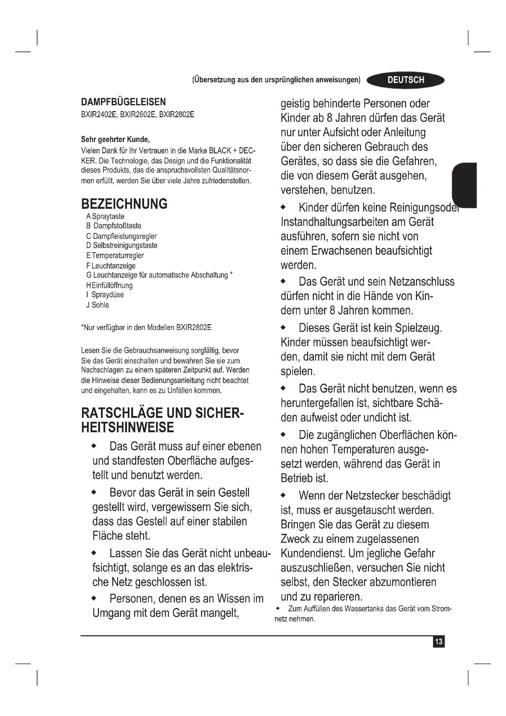 Sehr geehrter Kunde, Vielen Dank für Ihr Vertrauen in die Marke BLACK + DEC- KER. Die Technologie, das Design und die Funktionalität dieses Produkts, das die anspruchsvollsten Qualitätsnor- men erfüllt, werden Sie über viele Jahre zufriedenstellen. BEZEICHNUNG A Spraytaste B Dampfstoßtaste C Dampeistungsregler D Selbstreinigungstaste E Temperaturregler F Leuchtanzeige G Leuchtanzeige für automatische Abschaltung * H Einfüllöffnung I Spraydüse J Sohle *Nur verfügbar in den Modellen BXIR2802E Lesen Sie die Gebrauchsanweisung sorgfältig, bevor Sie das Gerät einschalten und bewahren Sie sie zum Nachschlagen zu einem späteren Zeitpunkt auf. Werden die Hinweise dieser Bedienungsanleitung nicht beachtet und eingehalten, kann es zu Unfällen kommen.