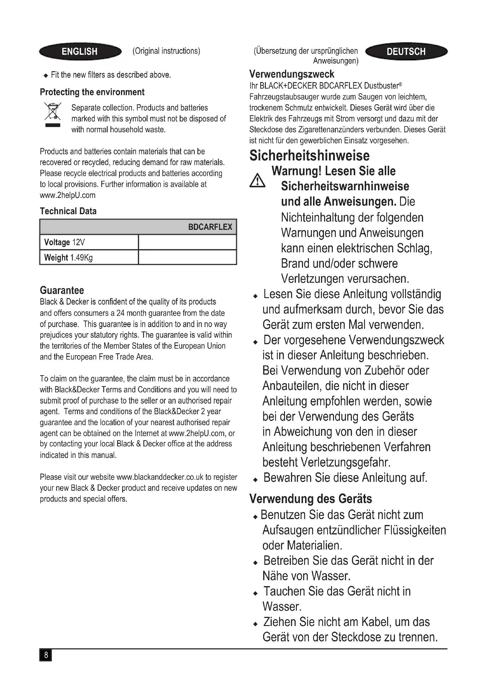 Warnung! Lesen Sie alle Sicherheitswarnhinweise und alle Anweisungen. Die Nichteinhaltung der folgenden Warnungen und Anweisungen kann einen elektrischen Schlag, Brand und/oder schwere Verletzungen verursachen. uLesen Sie diese Anleitung vollständig und aufmerksam durch, bevor Sie das Gerät zum ersten Mal verwenden. uDer vorgesehene Verwendungszweck ist in dieser Anleitung beschrieben. Bei Verwendung von Zubehör oder Anbauteilen, die nicht in dieser Anleitung empfohlen werden, sowie bei der Verwendung des Geräts in Abweichung von den in dieser Anleitung beschriebenen Verfahren besteht Verletzungsgefahr. uBewahren Sie diese Anleitung auf. Verwendung des Geräts u Benutzen Sie das Gerät nicht zum Aufsaugen entzündlicher Flüssigkeiten oder Materialien. uBetreiben Sie das Gerät nicht in der Nähe von Wasser. uTauchen Sie das Gerät nicht in Wasser. uZiehen Sie nicht am Kabel, um das Gerät von der Steckdose zu trennen.9 (Übersetzung der ursprünglichen Anweisungen) DEUTSCH Halten Sie das Kabel fern von starker Hitze, Öl und scharfen Gegenständen. uDieses Gerät darf von Kindern ab 8 Jahren und von Personen mit eingeschränkter körperlicher, sensorischer oder geistiger Leistungsfähigkeit oder fehlenden Erfahrungen und Kenntnissen benutzt werden. Dies gilt nur, wenn sie über die sichere Verwendung des Geräts informiert wurden, die damit verbundenen Gefahren verstehen und bei der Verwendung beaufsichtigt werden. Kinder dürfen nicht mit dem Gerät spielen. Reinigung und Wartungsarbeiten dürfen von Kindern nur unter Aufsicht durchgeführt werden. uDas Gerät darf nur mit dem im Lieferumfang enthaltenen Netzteil betrieben werden. uDas Gerät darf nur mit der auf dem Gerät angegebenen Sicherheitskleinspannung (Safety Extra Low Voltage, SELV) betrieben werden. Inspektion und Reparaturen u Prüfen Sie das Gerät vor der Verwendung auf beschädigte oder defekte Teile. Prüfen Sie, ob Teile gebrochen sind, Schalter beschädigt sind oder andere Bedingungen vorliegen, welche die Funktion beeinträchtigen könnten. uBetreiben Sie das Gerät nicht, wenn ein Teil beschädigt oder defekt ist. uLassen Sie beschädigte oder defekte Teile in einer Vertragswerkstatt reparieren oder austauschen. uÜberprüfen Sie das Kabel in regelmäßigen Abständen auf Beschädigungen. Wechseln Sie beschädigte oder fehlerhafte Kabel aus. uErsetzen oder entfernen Sie keine Teile, für die in dieser Anleitung keine entsprechende Beschreibung enthalten ist. Restrisiken Beim Gebrauch dieses Geräts verbleiben zusätzliche Restrisiken, die möglicherweise nicht in den Sicherheitswarnungen genannt werden. Diese Risiken bestehen beispielsweise bei Missbrauch oder längerem Gebrauch. Auch bei der Einhaltung der entsprechenden Sicherheitsvorschriften und der Verwendung aller Sicherheitsgeräte bestehen weiterhin bestimmte Restrisiken. Diese sind: u Verletzungen, die durch das Berühren von sich bewegenden Teilen verursacht werden. uVerletzungen, die durch das Berühren von erhitzten Teilen verursacht werden. uVerletzungen, die durch das Austauschen von Teilen oder Zubehör verursacht werden. uVerletzungen, die durch längeren Gebrauch des Geräts verursacht werden.10 (Übersetzung der ursprünglichen Anweisungen) DEUTSCH Legen Sie bei längerem Gebrauch regelmäßige Pausen ein. Elektrische Sicherheit Das Gerät ist nur für den Gebrauch mit einer negativ geerdeten 12V-Fahrzeugbatterie geeignet. Warnung! Der Anschluss für den Zigarettenanzünder ist mit einer nicht wartungsfähigen Schutzsicherung ausgestattet. Die Sicherung wird bei einer Fehlfunktion möglicherweise ausgelöst. In diesem Fall müssen sowohl die Sicherung als auch der Netzstecker und das Kabel durch den Hersteller oder eine Black & Decker-Vertragswerkstatt ausgetauscht werden, um eine mögliche Gefährdung zu vermeiden. Warnung! Das Gerät darf nicht an positiv geerdete Systeme oder an Systeme mit anderen elektrischen Spannungen angeschlossen werden. Merkmale Dieses Gerät verfügt über einige oder alle der folgenden Merkmale.