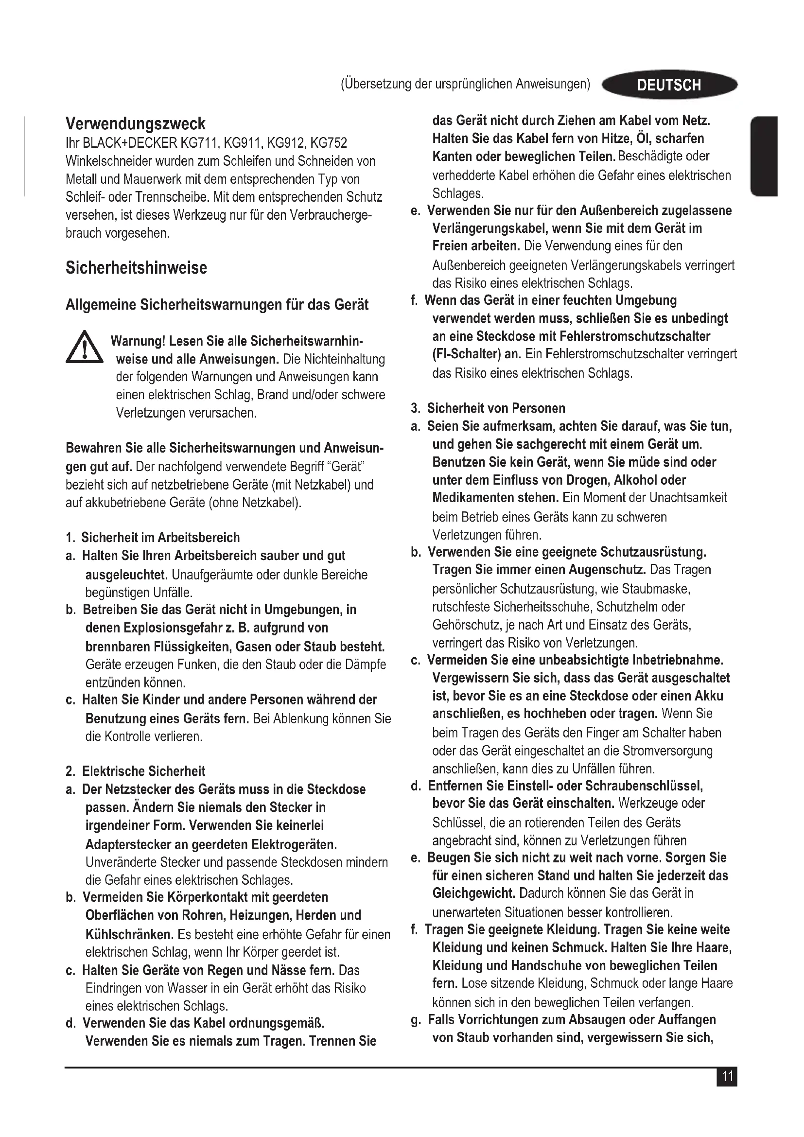 Garantie Black & Decker ist überzeugt von der Qualität seiner Produkte und bietet Verbrauchern eine 24-monatige Garantie ab dem Kaufdatum. Diese Garantie versteht sich unbeschadet der gesetzlichen Gewährleistungsansprüche und schränkt diese keinesfalls ein. Diese Garantie gilt innerhalb der Staatsgebiete der Mitgliedstaaten der Europäischen Union und der Eu- ropäischen Freihandelszone. Um die Garantie in Anspruch zu nehmen, muss der Anspruch den Geschäftsbedingungen von Black&Decker entsprechen und Sie müssen dem Verkäufer oder der zugelassenen Reparaturwerkstatt den Kaufbeleg vorlegen. Die Geschäftsbedingungen der 2-jährigen Garantie von Black&Decker sowie der Standort Ihrer zugelassenen Reparaturwerkstatt in Ihrer Nähe können über das Internet unter www.2helpU.com abgefragt werden oder durch Kontak- taufnahme mit Ihrem lokalen Black & Decker Büro unter der in diesem Handbuch angegebenen Adresse. Ihr neues Black & Decker Produkt können Sie auf unserer Website unter www.blackanddecker.de registrieren. Dort erhalten Sie auch Updates zu neuen Produkten und Son- derangeboten.19 (Traduction des instructions initiales) FRANÇAIS Utilisation prévue Vos meuleuses d’angle BLACK+DECKER KG711, KG911, KG912 et KG752 ont été conçues pour le meulage et le tronçonnage de métal et matériaux de maçonnerie à l’aide de disques à tronçonner et à meuler adaptés. Équipés des dispositifs de protection appropriés, ces outils ne sont prévus que pour un usage grand public. Consignes de sécurité Consignes de sécurité concernant les outils électriques