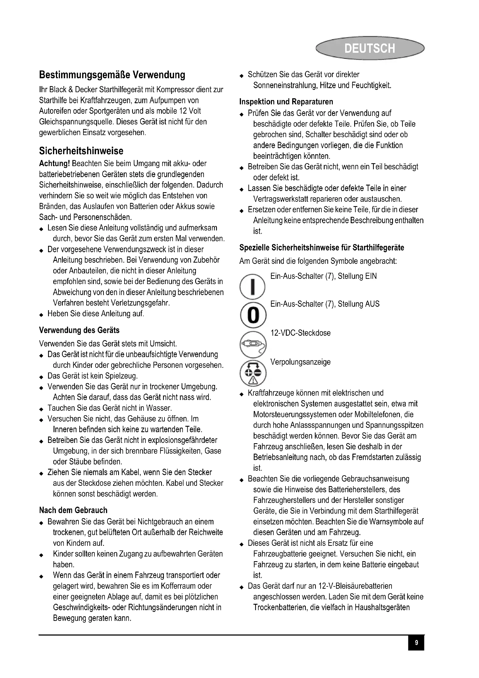 Use Charging the unit (fig. A) This unit is shipped in a partially charged state. X Charge the unit before first use using the mains charging adaptor (11) for 48 hours. Lead-acid batteries require routine maintenance to ensure a full charge and a long battery life. All batteries lose energy from self-discharge over time and more rapidly at higher temperatures. When the unit is not in use, Black & Decker recommend that the battery is charged at least every 60 days. X Check the battery charge level by pressing the battery status pushbutton (4). The LED charge status display (6) will indicate the level of battery charge. When only one red LED lights, charge the unit. Note: Charging the battery after each use will prolong the battery life; frequent heavy discharges between charges and/or overcharging will reduce battery life. The battery can be charged using the mains charging adaptor (11) or the 12 Vdc vehicle adaptor (12). Charging the unit with the mains charger (fig. A) Make sure that the ON/OFF switch (7) and the LED area light (10) are turned off while the unit is being charged. As charging progresses, the red LEDs will light one by one. X Charge the unit until the green FULL LED lights. X Continue to charge for one to two more hours. Note: The mains charger should not be connected for more than 60 hours. X When charging is complete, disconnect the mains charging adaptor (11) and store it in a safe place. Charging the unit with the 12 Vdc vehicle adaptor (fig. A) Make sure that the ON/OFF switch (7) and the LED area light (10) are turned off while the unit is being charged. The 12 Vdc vehicle adaptor (12) does not provide a taper charge. Warning! While charging with the 12 Vdc vehicle adaptor (12): X Do not charge for more than 4 hours maximum. X Do not leave unattended. To charge the unit with the 12 Vdc vehicle adaptor (12): X Insert one end of the 12 Vdc vehicle adaptor (12) into a 12 Vdc accessory outlet on the vehicle or boat. X Insert the other end of the 12 Vdc vehicle adaptor (12) into the 12 Vdc charging socket (3) on the front of the unit. X To check the charge status of the battery during dc charging, disconnect the 12 Vdc vehicle adapter from the accessory outlet and push the battery status pushbutton. Observe the battery status LEDs. Do not charge for more than 3 to 4 hours maximum. X When charging is completed, remove the 12 Vdc vehicle adaptor (12) and store it in a safe place. Warning! You must remove the 12 Vdc vehicle adaptor from the 12 Vdc accessory outlet on the vehicle before attempting to drive the vehicle. Failure to do so could result in some cases of the engine continuing to run even when the ignition key is removed which could result in personal injury or property damage. Using the unit as a jump-starter (fig. A & B) Warning! Make sure the vehicle is in neutral with the parking brake applied. X Turn off the vehicles ignition and all accessories before making any connections. X Make sure that the units ON/OFF switch (7) is turned OFF. X The following procedure is for a negative earth system ie the negative battery terminal is connected to the chassis. X Connect the positive (+) red clamp to the vehicle's positive battery terminal. X Connect the negative (-) black clamp to the vehicle's chassis or a solid, non-moving, metal vehicle component or chassis part. Note: If you connections are incorrectly made the unit will beep continuously and the red Reverse Polarity Indicator (9) will illuminate, even if the ON/OFF switch (7) is in the OFF position. Rectify the connections immediatley. Warning! Make sure that the cables are not in the path of moving belts or the fan. X Turn the unit's ON/OFF switch (7) to the ON position. X Start the vehicle and crank the engine in 3 to 6 second bursts. If the engine doesn't start within 6 seconds let the unit's internal battery cool for 3 minutes before making another attempt. X When the vehicle starts, turn the unit's ON/OFF switch (7) to the OFF position.6 ENGLISH X Leave the vehicle's engine running. X Disconnect the (-) black clamp connected to the engine or chassis first, followed by the (+) red clamp that is connected to the battery positive (+) terminal. X Carefully press the negative (black) jumper cable wire into the storage channel starting at the end furthest from the clamp. X Clamp the negative (black) clamp onto the clamp holder (14). X Carefully press the positive (red) jumper cable wire into the storage channel starting at the end furthest from the clamp. X Clamp the positive (red) clamp onto the clamp holder(14). X Charge the unit as soon as possible. Using the inflator (fig. C) Warning! When using the inflator: X Do not direct the nozzle at animals or bystanders. X Never leave the compressor unattended when running. X Only use the adaptors supplied. X Should the unit run over an extended period of time it may overheat and cause the thermal trip to activate. When this occurs switch the compressor off and allow to cool for 30 minutes. X Keep the compressor stored out of reach of small children. X The gauge is intended as a guide only. Tyre pressures should be regularly checked with a certified gauge. X Do not over inflate any object as this may cause a risk of injury. This inflator can be used to inflate car tyres and sports equipment. X Remove the inflator hose from the storage compartment. X If an adaptor is required, choose the correct adaptor (18) for the product you are inflating and fit it into the nozzle (15). X Fit the nozzle (15) of the inflator or the adaptor (18), if fitted, to the valve of the item to be inflated. Make sure that the nozzle (15) is locked in place. X Move the inflator switch (16) to the on position (I). X Monitor the pressure gauge (17) until the required pressure is reached. X Move the inflator switch (16) to the off position (0). X Remove the adaptor (18), if fitted, or the nozzle (15) from the inflated item. X Remove the adaptor (18), if fitted, and store it in a safe place and return