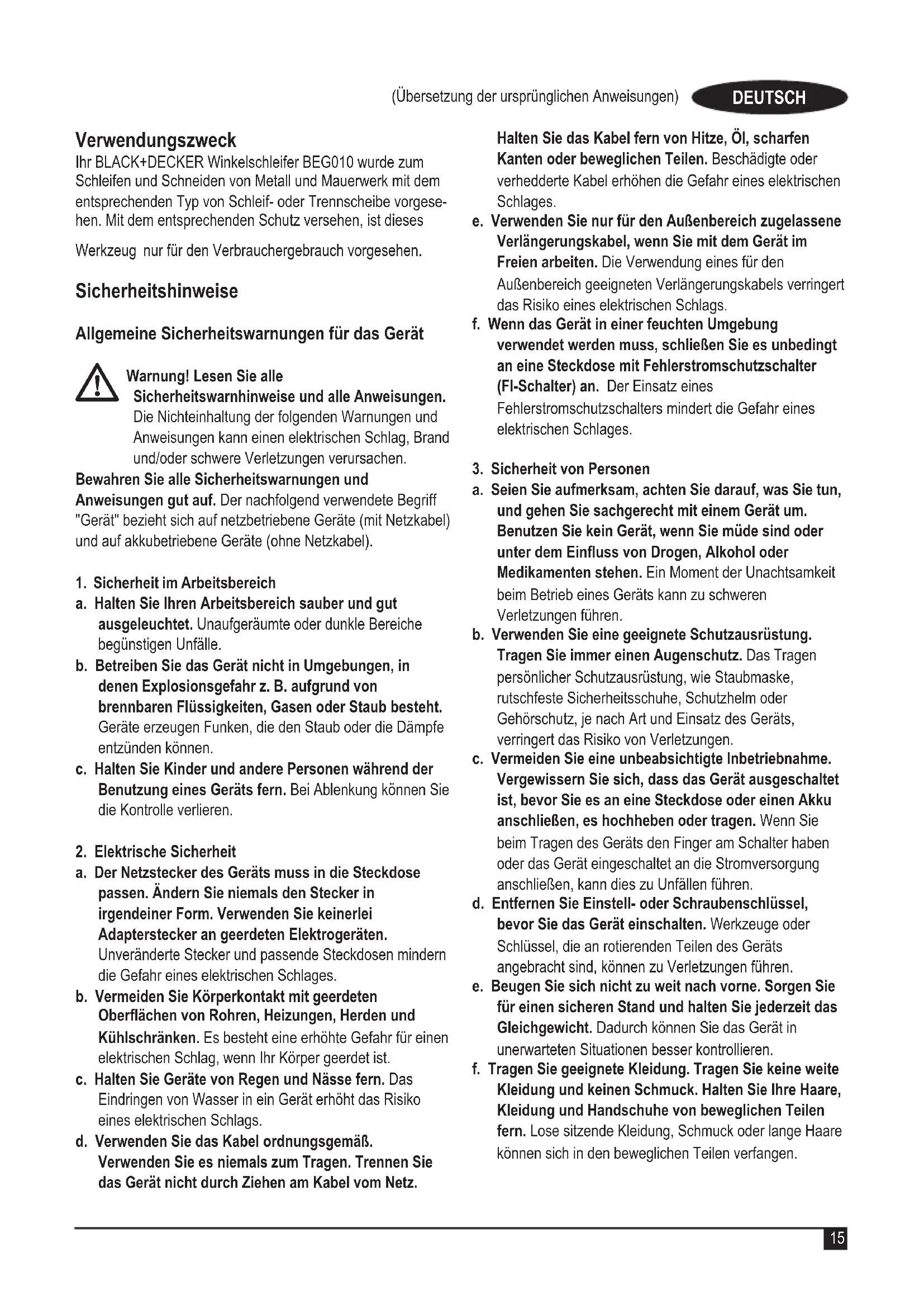 BEG010 Winkelschleifer Black & Decker erklärt, dass die in den technischen Daten beschriebenen Geräte übereinstimmen mit: 2006/42/EC, EN 60745-1:2009 + A11:2010; EN 60745-2-3:2011 + A2:2013 + A11:2014 + A12:2014 + A13:2015 Diese Produkte entsprechen außerdem den Richtlinien 2014/30/EU und 2011/65/EU. Weitere Informationen erhalten Sie von Black & Decker unter der folgenden Adresse. Diese bendet sich auch auf der Rückseite dieser Anleitung. Der Unterzeichnete ist verantwortlich für die Zusammen- stellung der technischen Daten und gibt diese Erklärung im Namen von Black & Decker ab. Patrick Diepenbach General Manager, Benelux Black and Decker, Egide Walschaertsstraat 14-18 2800 Mechelen, Belgium 23/04/2021 Garantie Black & Decker vertraut auf die Qualität der eigenen Geräte und bietet dem Käufer eine außergewöhnliche Garantie von 24 Monaten ab Kaufdatum. Diese Garantie versteht sich unbeschadet der gesetzlichen Gewährleistungsansprüche und schränkt diese keinesfalls ein.26 (Übersetzung der ursprünglichen Anweisungen) DEUTSCH (Traduction des instructions initiales) FRANÇAIS Diese Garantie gilt innerhalb der Staatsgebiete der Mitgliedstaaten der Europäischen Union und der Europäischen Freihandelszone. Zur Inanspruchnahme dieser Garantie muss sie den allgemeinen Geschäftsbedingungen von Black & Decker entsprechen und dem Verkäufer bzw. der Vertragswerkstatt ist ein Kaufnachweis vorzulegen. Die Bedingungen für die 2-jährige Garantie von Black & Decker und den Standort Ihrer nächstgelegenen Vertragswerkstatt nden Sie im Internet unter www.2helpU.com oder indem Sie sich an die lokale Black & Decker-Niederlassung wenden, deren Adresse Sie in dieser Anleitung nden. Ihr neues Black & Decker-Produkt können Sie auf unserer Website unter www.blackanddecker.de registrieren. Dort erhalten Sie auch Informationen über neue Produkte und Sonderangebote. (Traduction des instructions initiales) FRANÇAIS Utilisation prévue Votre meuleuse d'angle BLACK+DECKER BEG010 a été conçue pour le meulage et le tronçonnage du métal et des matériaux de maçonnerie à l'aide de disques à tronçonner et à meuler adaptés. Équipé des dispositifs de protection appro- priés, cet outil n'est prévu que pour un usage grand public. Consignes de sécurité Avertissements de sécurité générale liés aux outils électriques
