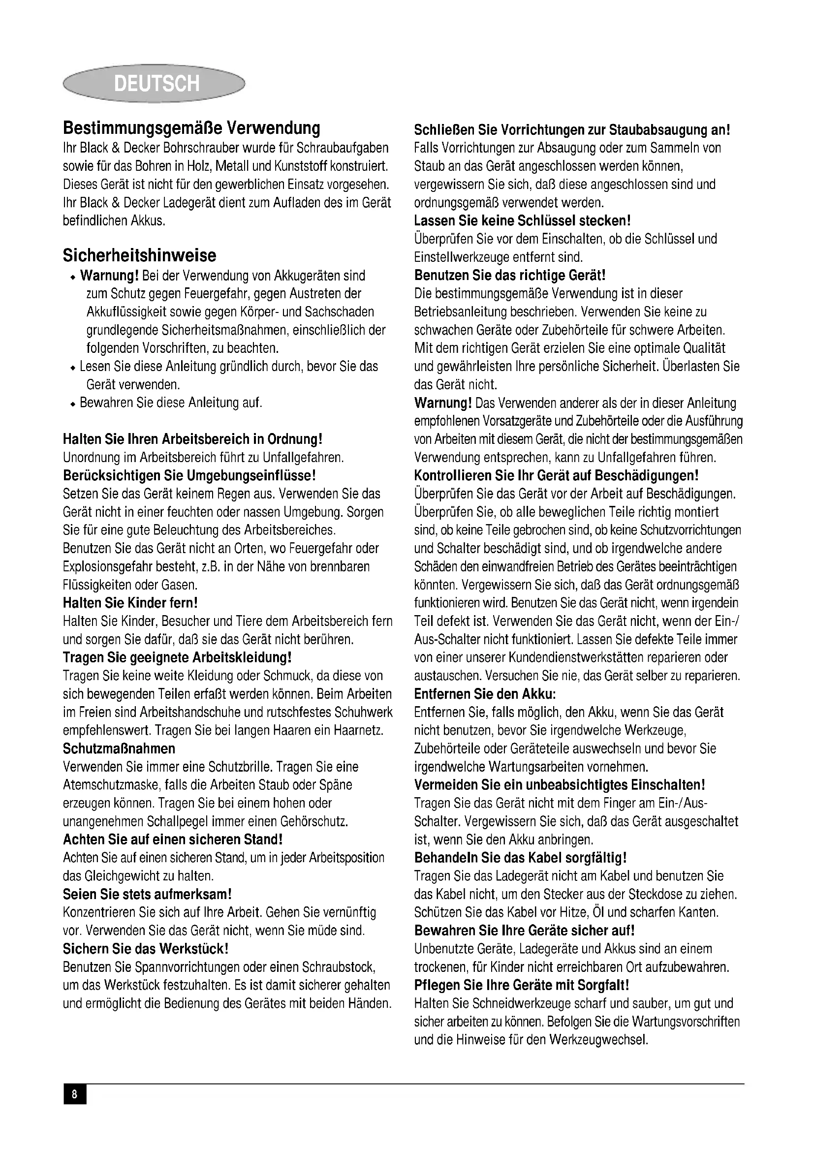 Colin Wills, Director of Engineering BDCI, 4/F, 2 Dai Wang Street Tai Po Industrial Estate Tai Po NT, Hong Kong Guarantee Black & Decker is confident of the quality of its products and offers an outstanding guarantee. This guarantee statement is in addition to and in no way prejudices your statutory rights. The guarantee is valid within the territories of the Member States of the European Union and the European Free Trade Area. If a Black & Decker product becomes defective due to faulty materials, workmanship or lack of conformity, within 24 months from the date of purchase, Black & Decker guarantees to replace defective parts, repair products subjected to fair wear and tear or replace such products to ensure minimum inconvenience to the customer unless: ◆ The product has been used for trade, professional or hire purposes; ◆ The product has been subjected to misuse or neglect; ◆ The product has sustained damage through foreign objects, substances or accidents; ◆ Repairs have been attempted by persons other than authorised repair agents or Black & Decker service staff. To claim on the guarantee, you will need to submit proof of purchase to the seller or an authorised repair agent. You can check the location of your nearest authorised repair agent by contacting your local Black & Decker office at the address indicated in this manual. Alternatively, a list of authorised Black & Decker repair agents and full details of our after-sales service and contacts are available on the Internet at: www.2helpU.com.8 DEUTSCH Bestimmungsgemäße Verwendung Ihr Black & Decker Bohrschrauber wurde für Schraubaufgaben sowie für das Bohren in Holz, Metall und Kunststoff konstruiert. Dieses Gerät ist nicht für den gewerblichen Einsatz vorgesehen. Ihr Black & Decker Ladegerät dient zum Aufladen des im Gerät befindlichen Akkus. Sicherheitshinweise ◆ Warnung! Bei der Verwendung von Akkugeräten sind zum Schutz gegen Feuergefahr, gegen Austreten der Akkuflüssigkeit sowie gegen Körper- und Sachschaden grundlegende Sicherheitsmaßnahmen, einschließlich der folgenden Vorschriften, zu beachten. ◆ Lesen Sie diese Anleitung gründlich durch, bevor Sie das Gerät verwenden. ◆ Bewahren Sie diese Anleitung auf. Halten Sie Ihren Arbeitsbereich in Ordnung! Unordnung im Arbeitsbereich führt zu Unfallgefahren. Berücksichtigen Sie Umgebungseinflüsse! Setzen Sie das Gerät keinem Regen aus. Verwenden Sie das Gerät nicht in einer feuchten oder nassen Umgebung. Sorgen Sie für eine gute Beleuchtung des Arbeitsbereiches. Benutzen Sie das Gerät nicht an Orten, wo Feuergefahr oder Explosionsgefahr besteht, z.B. in der Nähe von brennbaren Flüssigkeiten oder Gasen. Halten Sie Kinder fern! Halten Sie Kinder, Besucher und Tiere dem Arbeitsbereich fern und sorgen Sie dafür, daß sie das Gerät nicht berühren. Tragen Sie geeignete Arbeitskleidung! Tragen Sie keine weite Kleidung oder Schmuck, da diese von sich bewegenden Teilen erfaßt werden können. Beim Arbeiten im Freien sind Arbeitshandschuhe und rutschfestes Schuhwerk empfehlenswert. Tragen Sie bei langen Haaren ein Haarnetz. Schutzmaßnahmen Verwenden Sie immer eine Schutzbrille. Tragen Sie eine Atemschutzmaske, falls die Arbeiten Staub oder Späne erzeugen können. Tragen Sie bei einem hohen oder unangenehmen Schallpegel immer einen Gehörschutz. Achten Sie auf einen sicheren Stand! Achten Sie auf einen sicheren Stand, um in jeder Arbeitsposition das Gleichgewicht zu halten. Seien Sie stets aufmerksam! Konzentrieren Sie sich auf Ihre Arbeit. Gehen Sie vernünftig vor. Verwenden Sie das Gerät nicht, wenn Sie müde sind. Sichern Sie das Werkstück! Benutzen Sie Spannvorrichtungen oder einen Schraubstock, um das Werkstück festzuhalten. Es ist damit sicherer gehalten und ermöglicht die Bedienung des Gerätes mit beiden Händen. Schließen Sie Vorrichtungen zur Staubabsaugung an! Falls Vorrichtungen zur Absaugung oder zum Sammeln von Staub an das Gerät angeschlossen werden können, vergewissern Sie sich, daß diese angeschlossen sind und ordnungsgemäß verwendet werden. Lassen Sie keine Schlüssel stecken! Überprüfen Sie vor dem Einschalten, ob die Schlüssel und Einstellwerkzeuge entfernt sind. Benutzen Sie das richtige Gerät! Die bestimmungsgemäße Verwendung ist in dieser Betriebsanleitung beschrieben. Verwenden Sie keine zu schwachen Geräte oder Zubehörteile für schwere Arbeiten. Mit dem richtigen Gerät erzielen Sie eine optimale Qualität und gewährleisten Ihre persönliche Sicherheit. Überlasten Sie das Gerät nicht. Warnung! Das Verwenden anderer als der in dieser Anleitung empfohlenen Vorsatzgeräte und Zubehörteile oder die Ausführung von Arbeiten mit diesem Gerät, die nicht der bestimmungsgemäßen Verwendung entsprechen, kann zu Unfallgefahren führen. Kontrollieren Sie Ihr Gerät auf Beschädigungen! Überprüfen Sie das Gerät vor der Arbeit auf Beschädigungen. Überprüfen Sie, ob alle beweglichen Teile richtig montiert sind, ob keine Teile gebrochen sind, ob keine Schutzvorrichtungen und Schalter beschädigt sind, und ob irgendwelche andere Schäden den einwandfreien Betrieb des Gerätes beeinträchtigen könnten. Vergewissern Sie sich, daß das Gerät ordnungsgemäß funktionieren wird. Benutzen Sie das Gerät nicht, wenn irgendein Teil defekt ist. Verwenden Sie das Gerät nicht, wenn der Ein-/ Aus-Schalter nicht funktioniert. Lassen Sie defekte Teile immer von einer unserer Kundendienstwerkstätten reparieren oder austauschen. Versuchen Sie nie, das Gerät selber zu reparieren. Entfernen Sie den Akku: Entfernen Sie, falls möglich, den Akku, wenn Sie das Gerät nicht benutzen, bevor Sie irgendwelche Werkzeuge, Zubehörteile oder Geräteteile auswechseln und bevor Sie irgendwelche Wartungsarbeiten vornehmen. Vermeiden Sie ein unbeabsichtigtes Einschalten! Tragen Sie das Gerät nicht mit dem Finger am Ein-/Aus- Schalter. Vergewissern Sie sich, daß das Gerät ausgeschaltet ist, wenn Sie den Akku anbringen. Behandeln Sie d