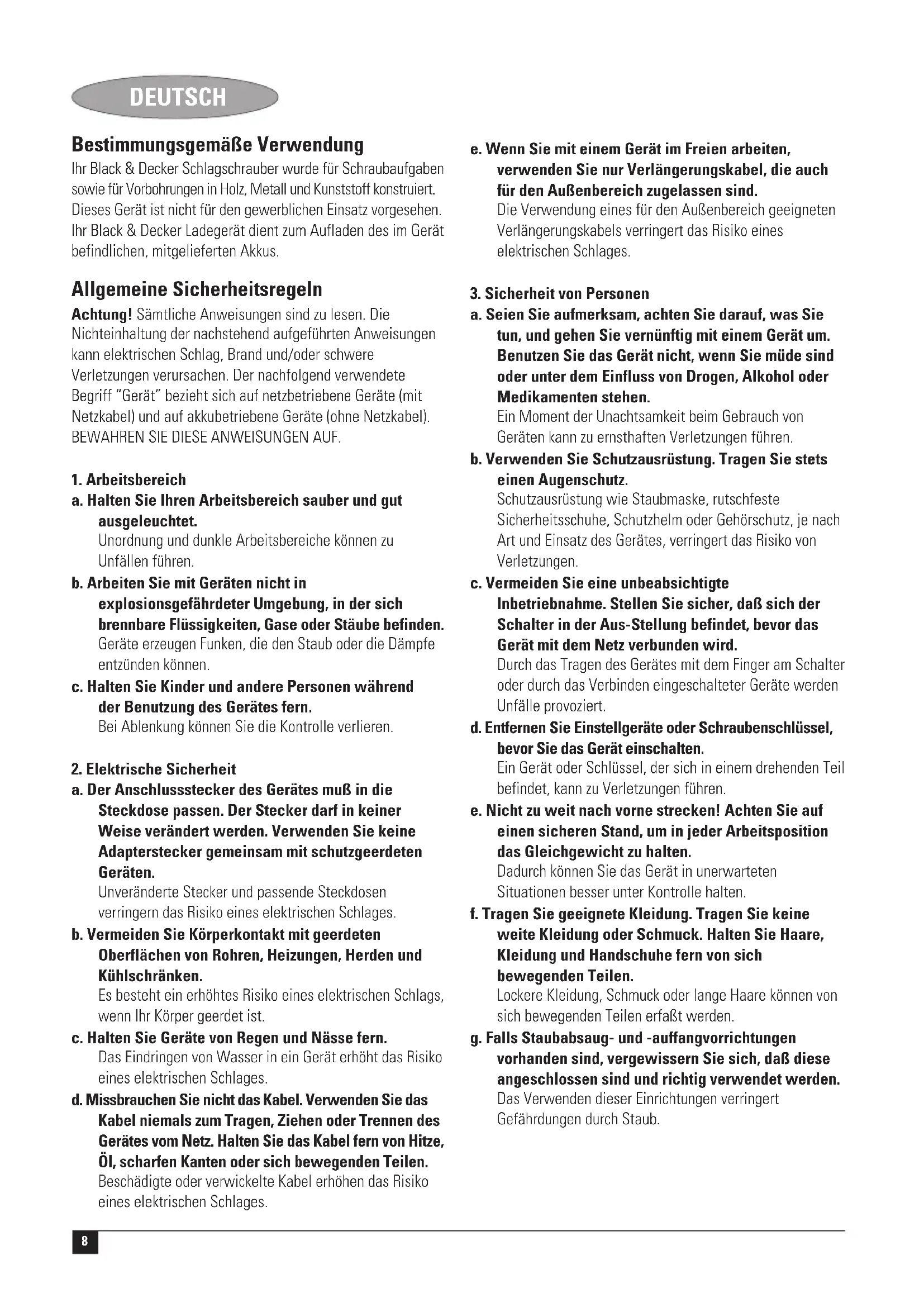 a. Lassen Sie Ihr Gerät nur von qualifiziertem Fachpersonal und nur mit Original-Ersatzteilen reparieren. Damit wird gewährleistet, daß die Sicherheit des Gerätes erhalten bleibt. Zusätzliche Sicherheitsanweisungen für Schlagbohrer ◆ Tragen Sie bei Schlagbohrmaschinen einen Gehörschutz. Lärm kann Gehörschäden verursachen. ◆ Verwenden Sie die im Lieferumfang des Werkzeugs enthaltenen Zusatzhandgriffe. Ein Kontrollverlust kann Personenverletzungen verursachen. Zusätzliche Sicherheitshinweise für Bohrschrauber ◆ Halten Sie das Gerät an den isolierten Griffflächen, wenn Arbeiten durchgeführt werden, bei denen das Schneidewerkzeug versteckte Leitungen oder die eigene Anschlußleitung berühren könnte. Ein Kontakt mit einer spannungsführenden Leitung setzt die freiliegenden Metallteile des Geräts unter Spannung und der Benutzer erleidet einen Stromschlag. ◆ Verwenden Sie Zwingen oder ähnliche Mittel, um das Werkstück auf einer stabilen Plattform zu halten und zu sichern. Falls das Werkstück mit der Hand oder gegen den Körper gehalten wird, bleibt es instabil und Sie können die Kontrolle verlieren. ◆ Informieren Sie sich vor dem Bohren in Wände, Böden und Decken über den genauen Verlauf von Leitungen und Rohren. ◆ Vermeiden Sie eine Berührung der Spitze eines Bohrers kurz nach dem Bohren, da sie heiß sein kann.10 DEUTSCH Zusätzliche Sicherheitsanweisungen für Akkus und Ladegeräte Akkus ◆ Versuchen Sie auf keinen Fall, einen Akku zu öffnen. ◆ Setzen Sie den Akku keiner Feuchtigkeit aus. ◆ Nicht an einem Ort aufbewahren, wo die Temperatur 40 °C überschreiten kann. ◆ Nur bei Umgebungstemperaturen zwischen 10 °C und 40 °C aufladen. ◆ Laden Sie den Akku nur mit dem im Lieferumfang enthaltenen Ladegerät. ◆ Befolgen Sie bei der Entsorgung von Akkus die Anweisungen im Abschnitt “Umweltschutz”. Ladegeräte ◆ Verwenden Sie Ihr Black & Decker Ladegerät nur zum Laden von Akkus des im Lieferumfang enthaltenen Typs. Andere Akkus könnten platzen und Sach- und Personenschäden verursachen. ◆ Versuchen Sie nie, nicht aufladbare Batterien zu laden. ◆ Lassen Sie beschädigte Leitungen sofort austauschen. ◆ Setzen Sie das Ladegerät niemals Feuchtigkeit aus. ◆ Öffnen Sie das Ladegerät nicht. ◆ Fassen Sie nicht mit den Fingern oder irgendwelchen Gegenständen in das Ladegerät. Das Ladegerät ist ausschließlich für den Gebrauch in geschlossenen Räumen vorgesehen. Lesen Sie vor dem Gebrauch sorgfältig die Bedienungsanleitung. Ausfallsicherer Trenntransformator. Die Netzspannungsversorgung ist vom Transformatorausgang elektrisch getrennt. Das Ladegerät schaltet automatisch ab, wenn die Umgebungstemperatur zu hoch wird. Danach ist das Ladegerät außer Funktion. Das Gerät muß vom Netz getrennt und zur Reparatur zu einem autorisierten Servicecenter gebracht werden. Elektrische Sicherheit Ihr Ladegerät ist doppelt isoliert; eine Erdleitung ist somit nicht erforderlich. Überprüfen Sie, ob die Netzspannung der auf dem Typenschild des Ladegerätes angegebenen Spannung entspricht. Tauschen Sie das Ladegerät auf keinen Fall gegen einen Netzstecker aus. ◆ Dieses Gerät darf ohne Aufsicht nicht von jungen oder schwachen Personen verwendet werden. Kinder müssen beaufsichtigt werden, um sicherzustellen, daß sie nicht mit dem Gerät spielen. ◆ Falls das Netzkabel beschädigt ist, so ist es vom Hersteller oder einem autorisierten Black & Decker Service Center auszutauschen, um Gefahren vorzubeugen. Übersicht