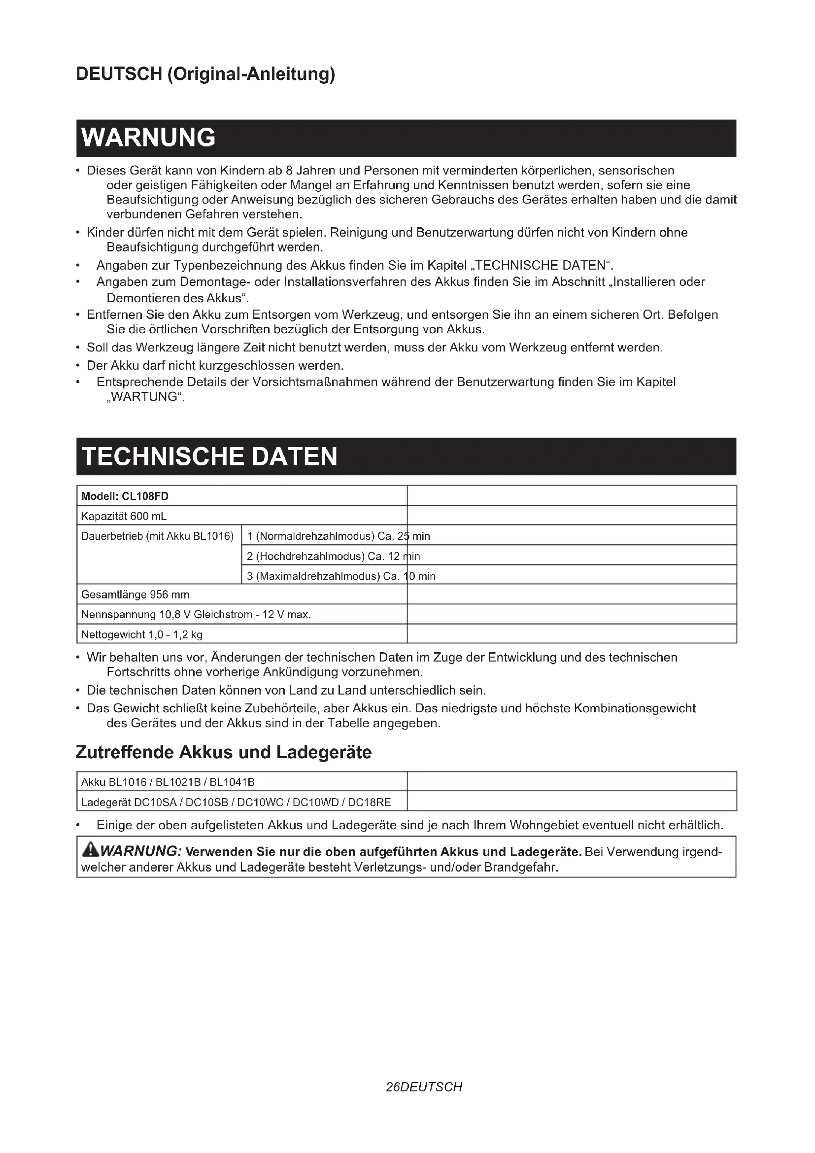 - EntsprechendeDetailsderVorsichtsmaßnahmenwährendderBenutzerwartungndenSieimKapitel „WARTUNG“. TECHNISCHE DATEN Modell: CL108FD Kapazität 600 mL Dauerbetrieb (mit Akku BL1016) 1 (Normaldrehzahlmodus) Ca. 25 min 2 (Hochdrehzahlmodus) Ca. 12 min 3 (Maximaldrehzahlmodus) Ca. 10 min Gesamtlänge 956 mm Nennspannung 10,8 V Gleichstrom - 12 V max. Nettogewicht 1,0 - 1,2 kg