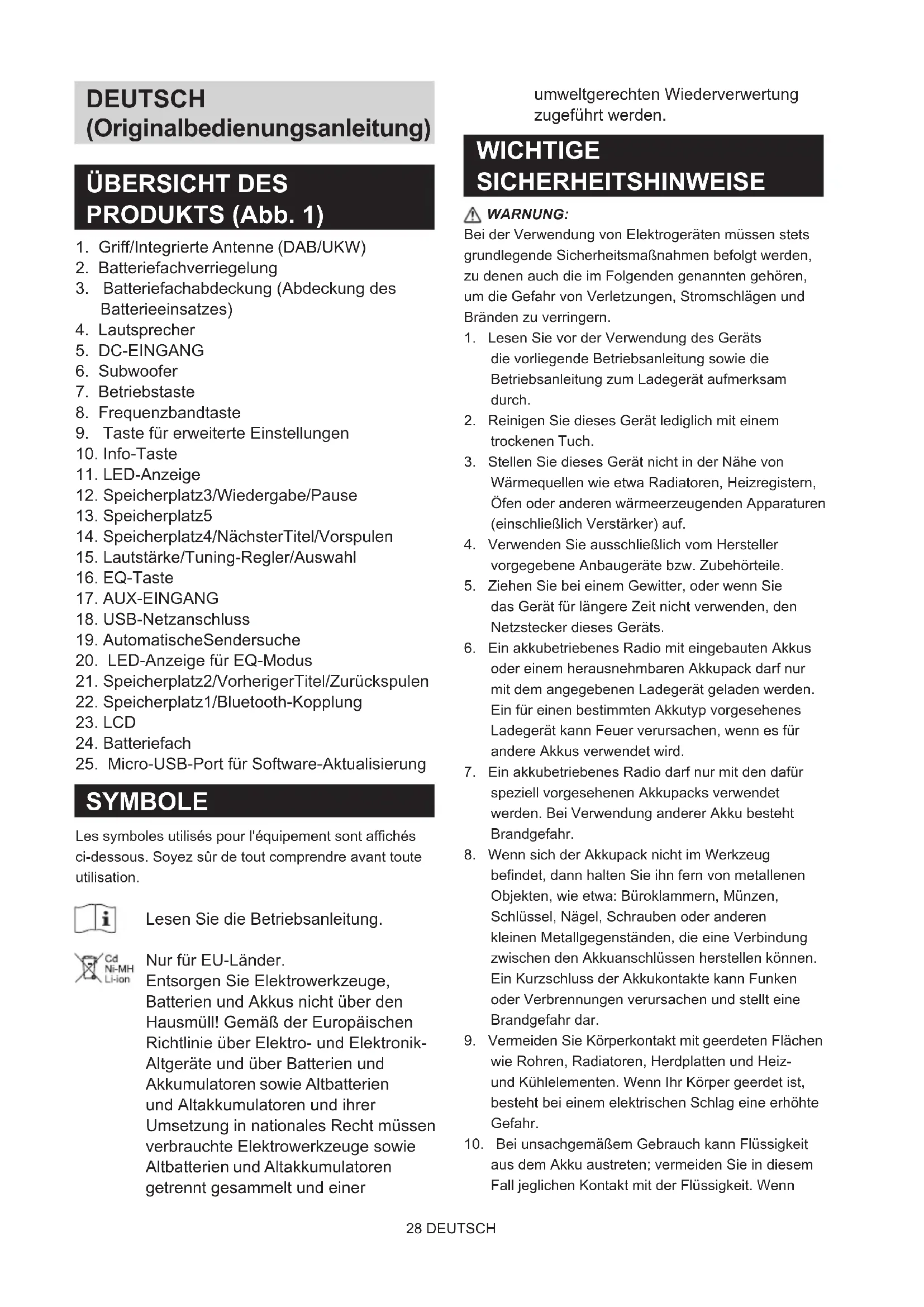 -Logos sind eingetragene Marken von Bluetooth SIG, Inc.) Bluetooth-Version 5.0 Zertiziert Bluetooth-Prole A2DP/SCMS-T/AVRCP Übertragungsleistung Leistungsklasse 2 Übertragungsbereich Optimum: Max.10 Meter (33 Fuß)) Möglich: Max. 30 Meter (100 Fuß) (abhängig von den Gebrauchsbedingungen) Bluetooth-Codecs SBC, AAC Max. Radiofrquenzleistung BT EDR: 1.91dBm BT LE: 0.21dBm Betriebsfrequenz 2402MHz~2480MHz Schaltkreis Lautsprecher 2,5 Zoll 8 Ohm x 2 4 Zoll 6 Ohm x 1 Ausgangsleistung 10,8V-12V max: 2W x 2 + 10W 14,4V: 3W x 2 + 15W 18V: 5W x 2 + 25W Eingang 3,5 mm Durchmesser (AUX IN) Antennensystem DAB/FM: Integrierte Antenne Abmessungen (L x B x H) 268 x 164 x 295 mm Gewicht 4,8 KG (ohne Batterie)41 ITALIANO ITALIANO (Istruzioni Originali) LEGENDA DELLA PANORAMICA (Fig. 1)