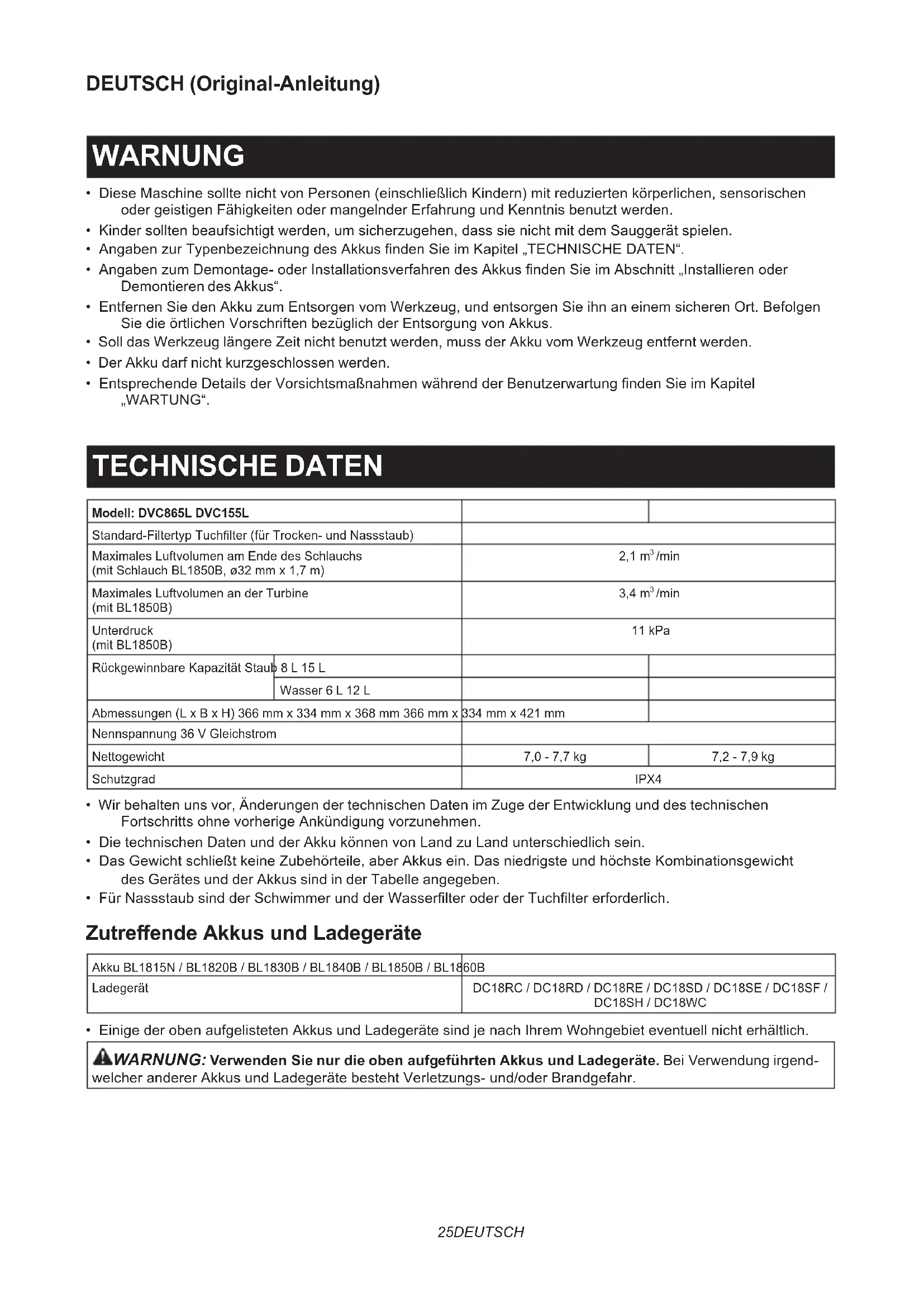 - Einige der oben aufgelisteten Akkus und Ladegeräte sind je nach Ihrem Wohngebiet eventuell nicht erhältlich. WARNUNG: Verwenden Sie nur die oben aufgeführten Akkus und Ladegeräte. Bei Verwendung irgend- welcher anderer Akkus und Ladegeräte besteht Verletzungs- und/oder Brandgefahr.26 DEUTSCH Symbole Nachfolgend werden Symbole beschrieben, die für das Gerät verwendet werden können. Machen Sie sich unbedingt vor der Benutzung mit ihrer Bedeutung vertraut. Betriebsanleitung lesen. Besondere Umsicht und Aufmerksamkeit erforderlich. Warnung! Der Staubsauger kann gefährli- chen Staub enthalten. Stellen Sie sich niemals auf den Staubsauger. Staubklasse L (leicht). Die Staubsauger sind in der Lage, Staub der Staubklasse L aufzusaugen. Befolgen Sie die Vorschriften Ihres Landes in Bezug auf Stäube sowie Sicherheit und Gesundheitsschutz am Arbeitsplatz. Ni-MH Li-ion Nur für EU-Länder Aufgrund des Vorhandenseins gefähr- licher Komponenten in der Ausrüstung können Elektro- und Elektronik-Altgeräte, Akkumulatoren und Batterien sich nega- tiv auf die Umwelt und die menschliche Gesundheit auswirken. Entsorgen Sie Elektro- und Elektronikgeräte oder Batterien nicht mit dem Hausmüll! In Übereinstimmung mit der Europäischen Richtlinie über Elektro- und Elektronik- Altgeräte, Akkumulatoren und Batterien, verbrauchte Akkumulatoren und Batterien sowie ihrer Anpassung an nati- onales Recht sollten Elektro-Altgeräte, Batterien und Akkumulatoren gemäß den Umweltschutzbestimmungen getrennt gelagert und zu einer getrennten Sammelstelle für Siedlungsabfälle geliefert werden. Dies wird durch das am Gerät angebrachte Symbol der durchgestrichenen Abfalltonne auf Rädern angezeigt. Vorgesehene Verwendung Das Werkzeug ist für das Absaugen von Nass- und Trockenstaub vorgesehen. Das Werkzeug eignet sich für kommerziellen Einsatz z. B. in Hotels, Schulen, Krankenhäusern, Fabriken, Läden, Büros und Mietunternehmen. Geräusch Typischer A-bewerteter Geräuschpegel ermittelt gemäß IEC60335-2-69: Modell DVC865L Schalldruckpegel (L