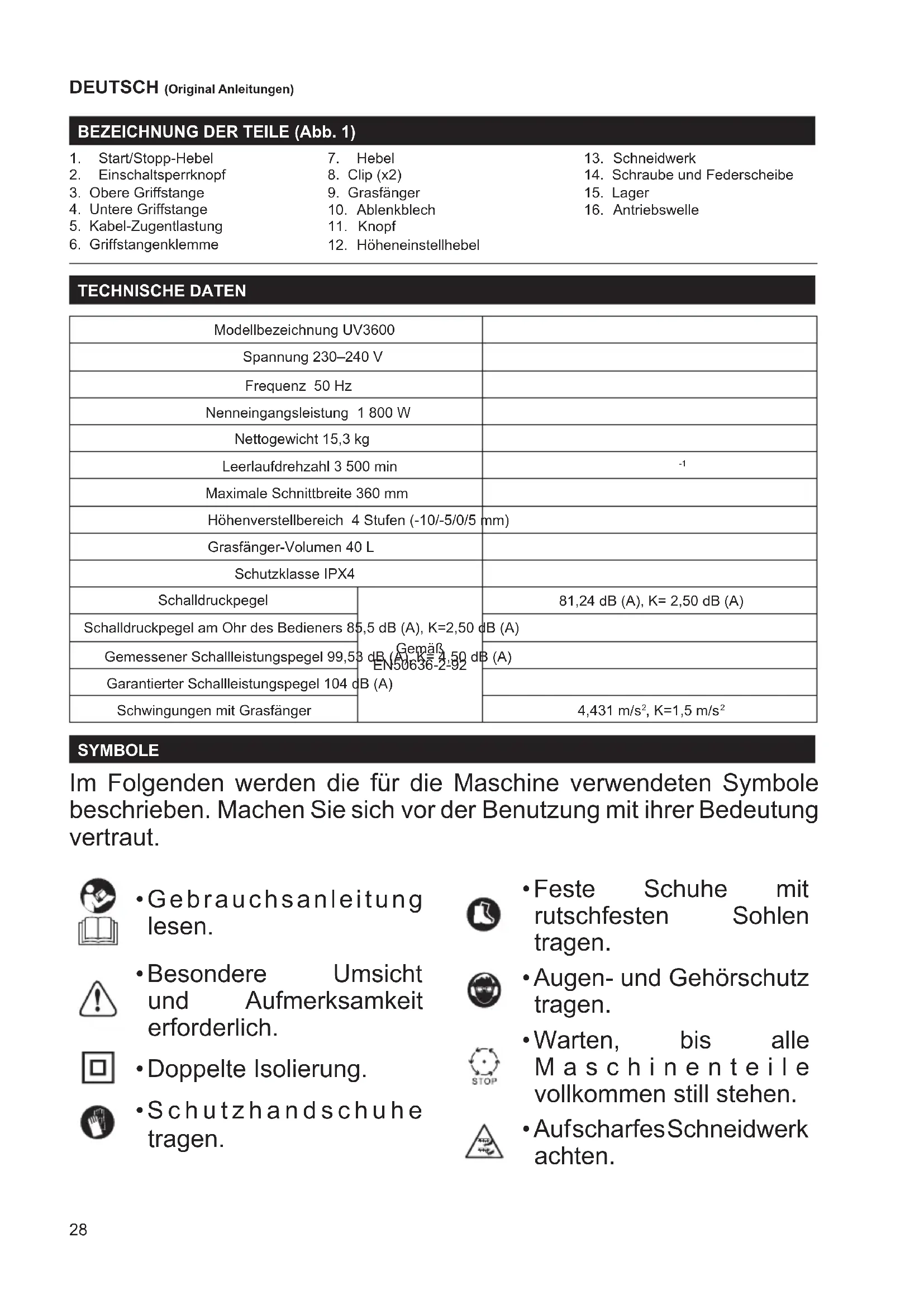 Maximale Schnittbreite 360 mm Höhenverstellbereich 4 Stufen (-10/-5/0/5 mm) Grasfänger-Volumen 40 L Schutzklasse IPX4 Schalldruckpegel Gemäß EN50636-2-92 81,24 dB (A), K= 2,50 dB (A) Schalldruckpegel am Ohr des Bedieners 85,5 dB (A), K=2,50 dB (A) Gemessener Schallleistungspegel 99,53 dB (A), K= 4,50 dB (A) Garantierter Schallleistungspegel 104 dB (A) Schwingungen mit Grasfänger 4,431 m/s
