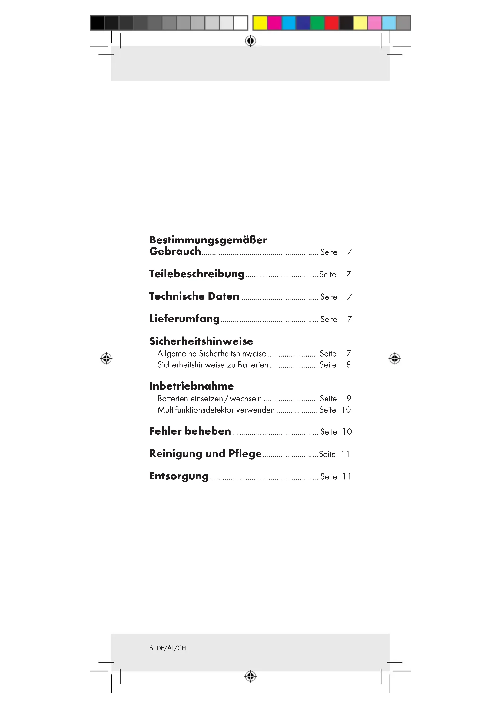 56 DE/AT/CH Bestimmungsgemäßer Gebrauch ........................................................ Seite 7 Teilebeschreibung ................................... Seite 7 Technische Daten ..................................... Seite 7 Lieferumfang ............................................... Seite 7 Sicherheitshinweise Allgemeine Sicherheitshinweise ........................ Seite 7 Sicherheitshinweise zu Batterien ....................... Seite 8 Inbetriebnahme Batterien einsetzen / wechseln .......................... Seite 9 Multifunktionsdetektor verwenden .................... Seite 10 Fehler beheben ......................................... Seite 10 Reinigung und Pflege ........................... Seite 11 Entsorgung .................................................... Seite 117 DE/AT/CH Multifunktionsdetektor Bestimmungsgemäßer Gebrauch Diese Gerät ist zum Aufspüren von Metall und spannungs- führenden Leitungen bestimmt. Das Gerät ist nicht für den gewerblichen Einsatz bestimmt. Teilebeschreibung