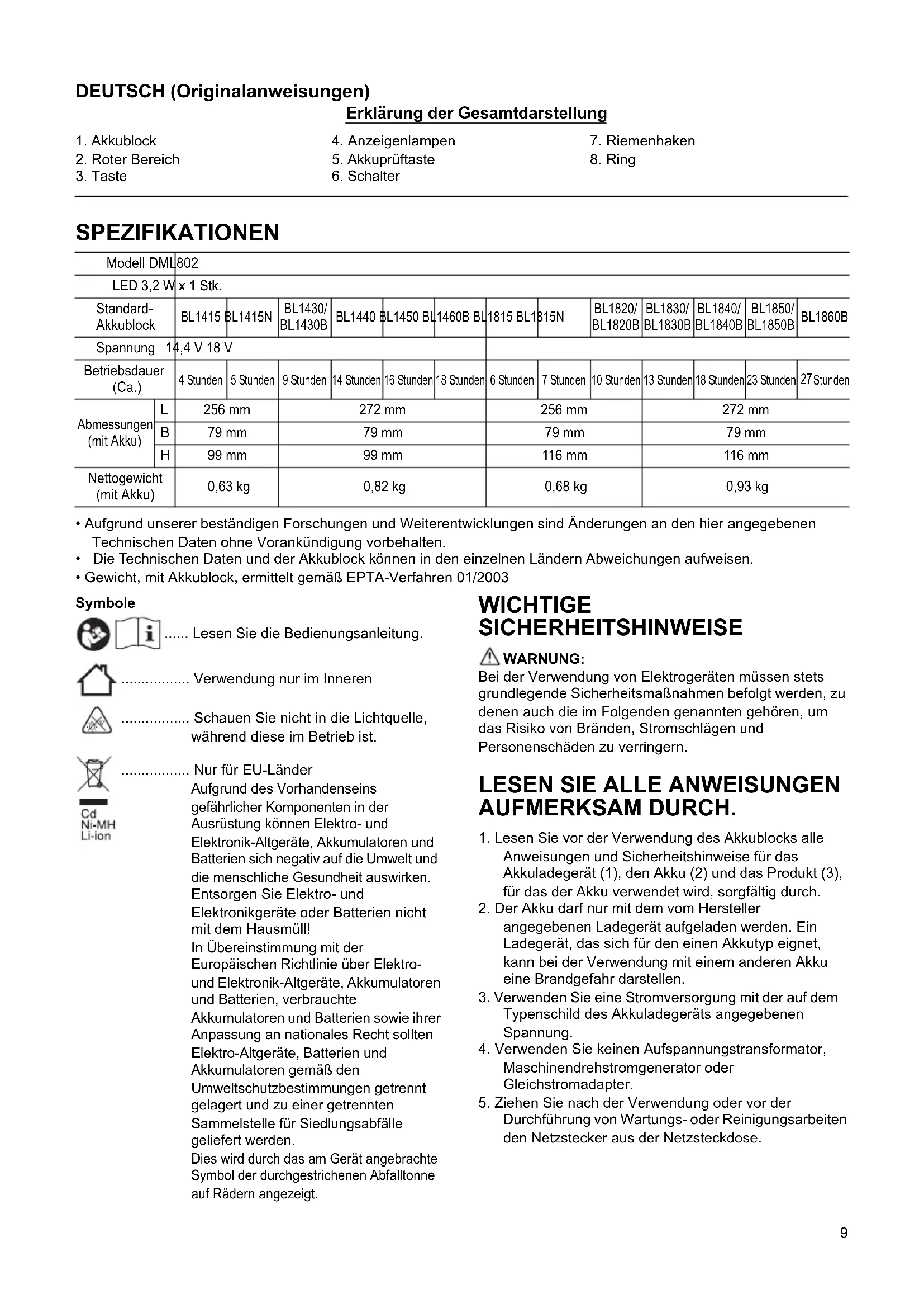 Modell DML802 LED 3,2 W x 1 Stk. Standard- Akkublock BL1415 BL1415N BL1430/ BL1430B BL1440 BL1450 BL1460B BL1815 BL1815N BL1820/ BL1820B BL1830/ BL1830B BL1840/ BL1840B BL1850/ BL1850B BL1860B Spannung 14,4 V 18 V Betriebsdauer (Ca.) 4 Stunden 5 Stunden 9 Stunden 14 Stunden 16 Stunden 18 Stunden 6 Stunden 7 Stunden 10 Stunden 13 Stunden 18 Stunden 23 Stunden