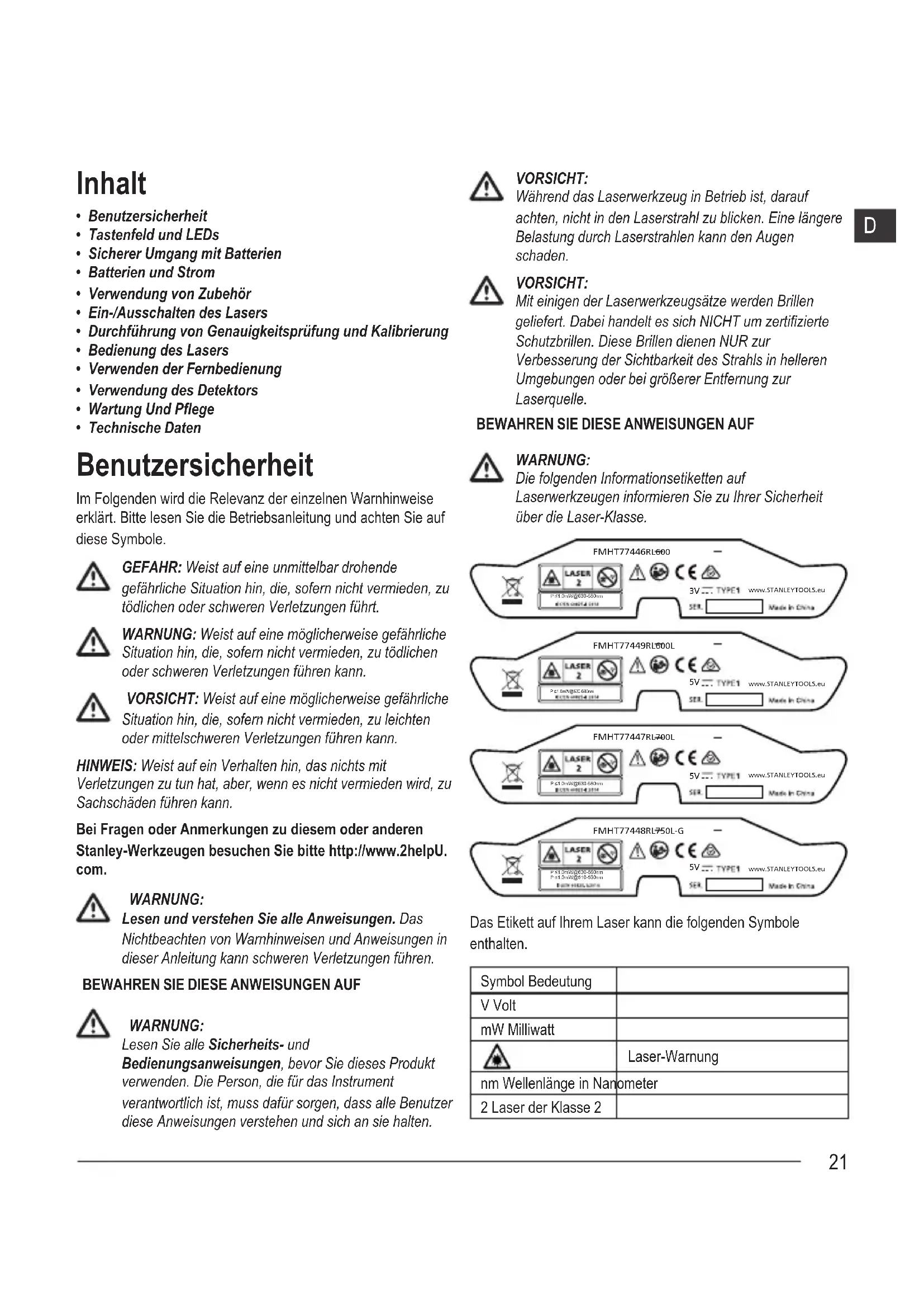 www.STANLEYTOOLS.euP ≤1.0mW@630-680nmP ≤1.0mW@510-530nm Das Etikett auf Ihrem Laser kann die folgenden Symbole enthalten. Symbol Bedeutung V Volt mW Milliwatt Laser-Warnung nm Wellenlänge in Nanometer 2 Laser der Klasse 222