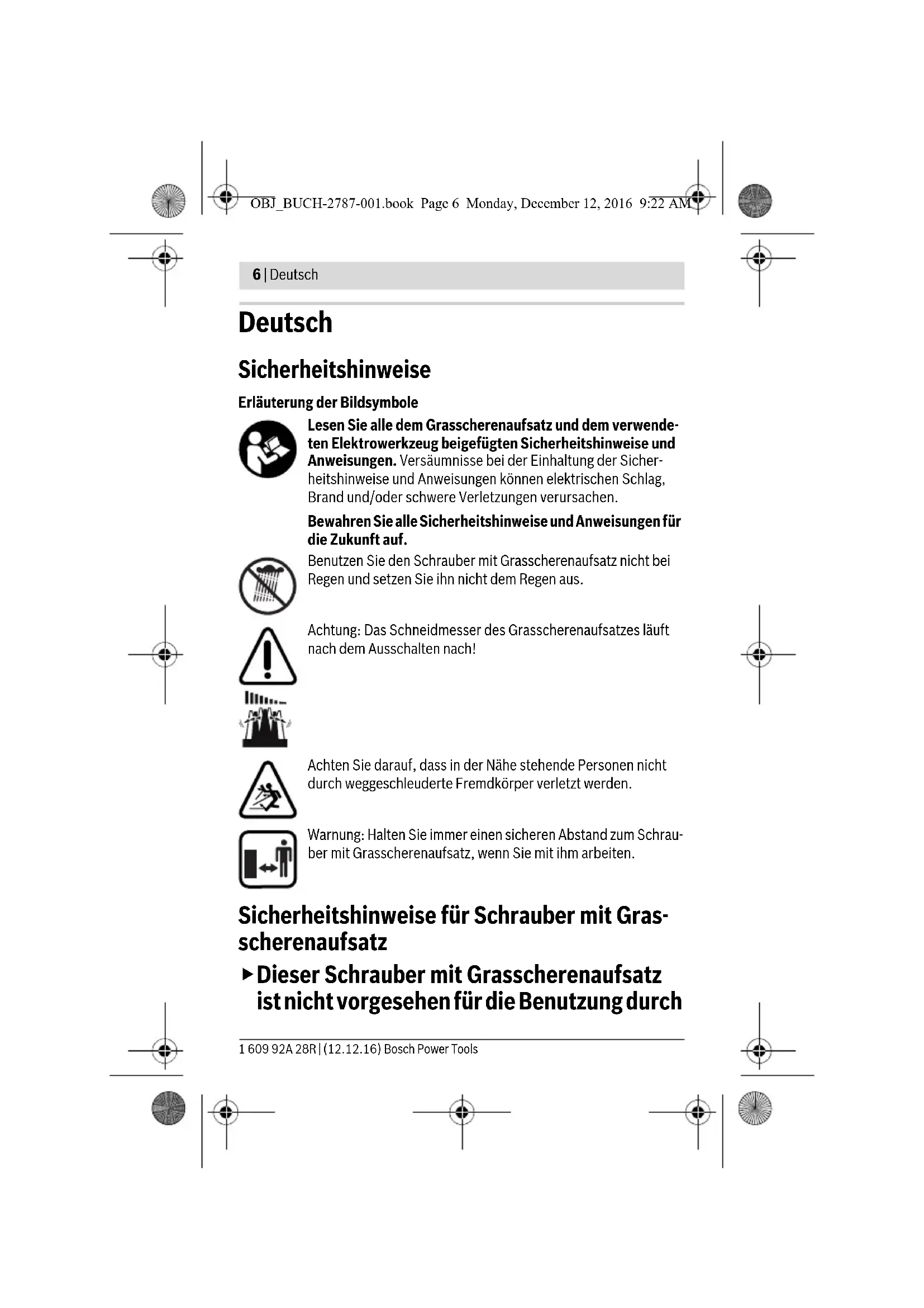 OBJ_BUCH-2787-001.book Page 5 Monday, December 12, 2016 9:22 AM1 609 92A 28R | (12.12.16) Bosch Power Tools 6 | Deutsch Deutsch Sicherheitshinweise Erläuterung der Bildsymbole Lesen Sie alle dem Grasscherenaufsatz und dem verwende- ten Elektrowerkzeug beigefügten Sicherheitshinweise und Anweisungen. Versäumnisse bei der Einhaltung der Sicher- heitshinweise und Anweisungen können elektrischen Schlag, Brand und/oder schwere Verletzungen verursachen. Bewahren Sie alle Sicherheitshinweise und Anweisungen für die Zukunft auf. Benutzen Sie den Schrauber mit Grasscherenaufsatz nicht bei Regen und setzen Sie ihn nicht dem Regen aus. Achtung: Das Schneidmesser des Grasscherenaufsatzes läuft nach dem Ausschalten nach! Achten Sie darauf, dass in der Nähe stehende Personen nicht durch weggeschleuderte Fremdkörper verletzt werden. Warnung: Halten Sie immer einen sicheren Abstand zum Schrau- ber mit Grasscherenaufsatz, wenn Sie mit ihm arbeiten. Sicherheitshinweise für Schrauber mit Gras- scherenaufsatz