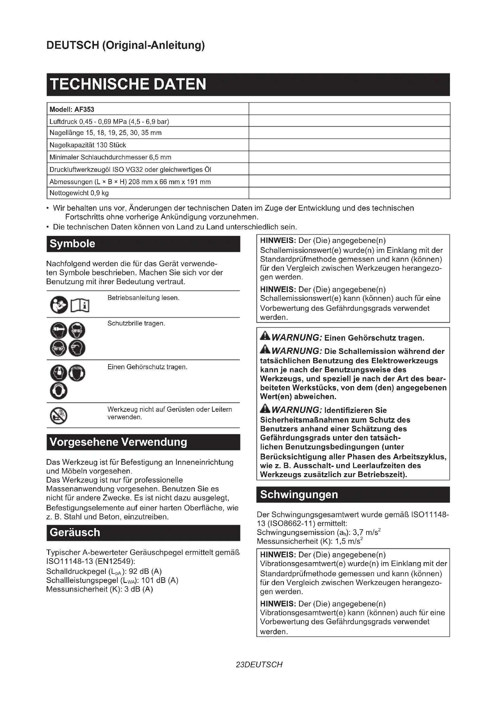 - Die technischen Daten können von Land zu Land unterschiedlich sein. Symbole Nachfolgend werden die für das Gerät verwende- ten Symbole beschrieben. Machen Sie sich vor der Benutzung mit ihrer Bedeutung vertraut. Betriebsanleitung lesen. Schutzbrille tragen. Einen Gehörschutz tragen. Werkzeug nicht auf Gerüsten oder Leitern verwenden. Vorgesehene Verwendung Das Werkzeug ist für Befestigung an Inneneinrichtung und Möbeln vorgesehen. Das Werkzeug ist nur für professionelle Massenanwendung vorgesehen. Benutzen Sie es nicht für andere Zwecke. Es ist nicht dazu ausgelegt, Befestigungselemente auf einer harten Oberäche, wie z. B. Stahl und Beton, einzutreiben. Geräusch Typischer A-bewerteter Geräuschpegel ermittelt gemäß ISO11148-13 (EN12549): Schalldruckpegel (L