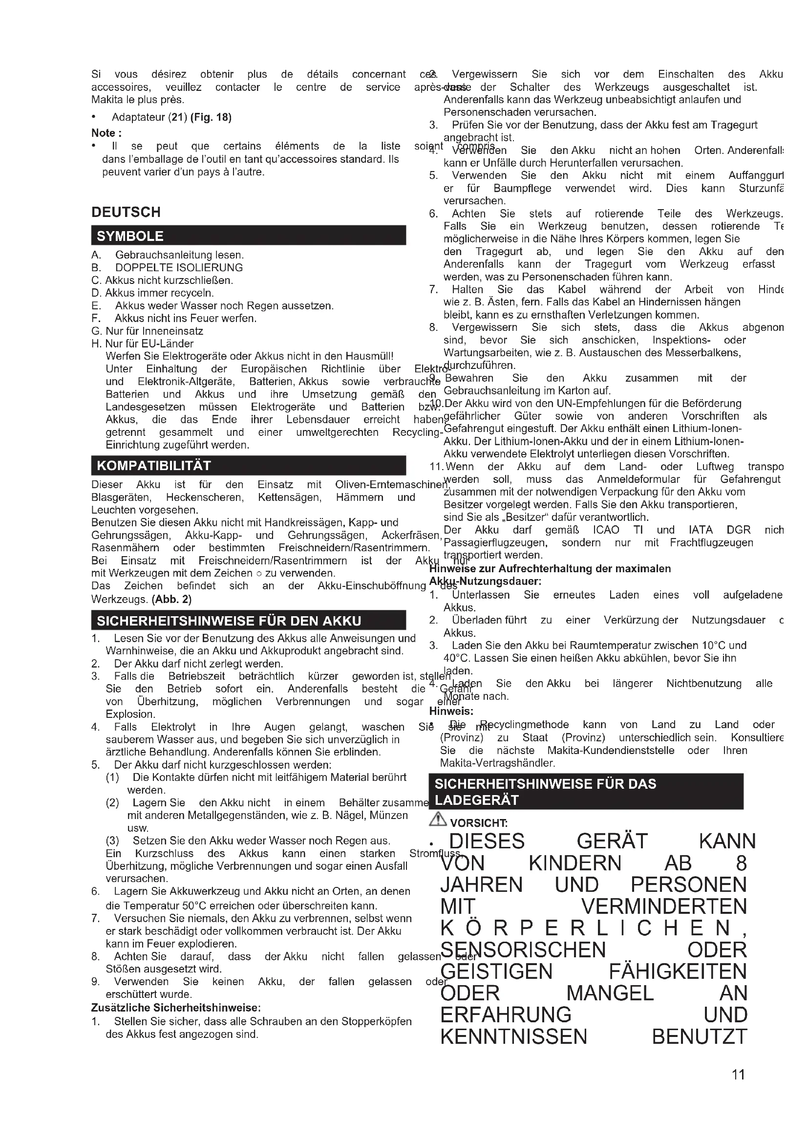 - NiedrigeAkkuspannung: Die Akku-Restkapazität ist zu niedrig, und das Werkzeugfunktioniertnicht.EntfernenSieindieserSituationdenAdaptervomWerkzeug,undladenSiedenAkkuauf.DerLadevorgang beginnt nicht, wenndasAkku-Schutzsystemaktiviert ist, weil der Akku zu heiß oder zu kalt ist. DerLadevorgang wird fortgesetzt, wenn sich die Temperatur desAkkusnormalisiert. Überprüfen der Akku-Restkapazität (Abb. 4) Drücken Sie die Prüftaste (10), um die Akku-Restkapazitätanzuzeigen.Daraufhin leuchtet dieAnzeigelampe (11) etwa dreiSekundenlang. Lampenanzeigen AnzeigelampenRestladung:Ein :Aus :Blinkt Leer Voll 70%bis100%45%bis70%20%bis45%0%bis20%DenAkkuauaden.DasAkku-Schutzsystemarbeitet.*Sieheunten.* Diese Anzeige meldet einen vorübergehenden Fehler odereine Funktionsstörung des Akkus. Gehen Sie in diesem Fallwie folgt vor: 1. Schalten Sie den Akku aus und wieder ein,undprüfenSiedann,obdasWerkzeugfunktioniert.2.FallsdieLampen noch immer abwechselnd aueuchten, schalten SiedenAkkuaus,undvertauschenSiedieAdapterposition(nurbeiVerwendungeinesDoppeladapters).3.FallsdieLampennochimmer abwechselnd aueuchten, kontaktieren Sie die örtliche Makita-Kundendienststelle, um eine Inspektion und/oder Reparaturanzufordern.Hinweis: