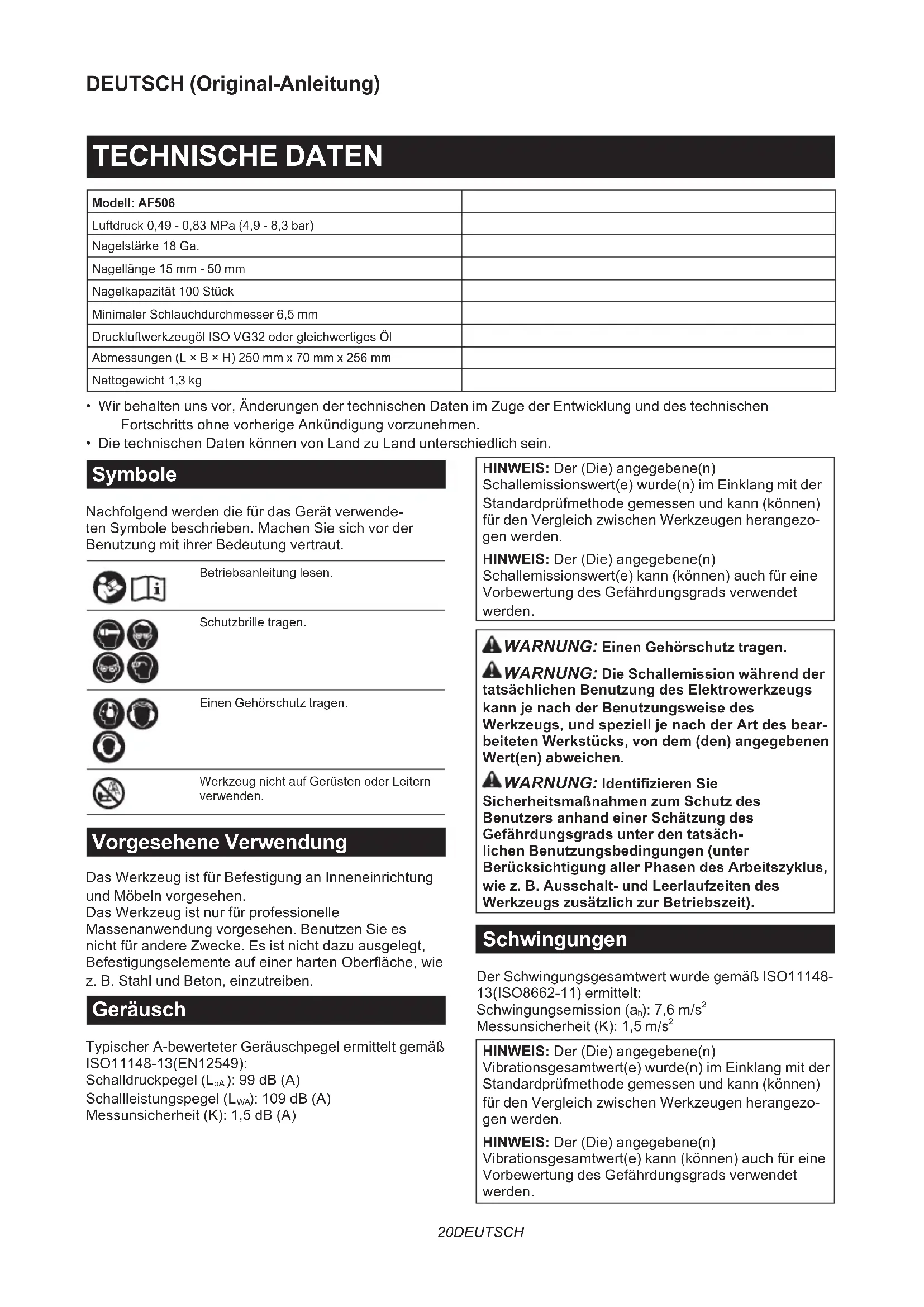 HINWEIS: Der (Die) angegebene(n) Vibrationsgesamtwert(e) wurde(n) im Einklang mit der Standardprüfmethode gemessen und kann (können) für den Vergleich zwischen Werkzeugen herangezo- gen werden. HINWEIS: Der (Die) angegebene(n) Vibrationsgesamtwert(e) kann (können) auch für eine Vorbewertung des Gefährdungsgrads verwendet werden.21 DEUTSCH WARNUNG: Die Vibrationsemission während der tatsächlichen Benutzung des Elektrowerkzeugs kann je nach der Benutzungsweise des Werkzeugs, und speziell je nach der Art des bearbeiteten Werkstücks, von dem (den) angegebenen Emissionswert(en) abweichen. WARNUNG: Identizieren Sie Sicherheitsmaßnahmen zum Schutz des Benutzers anhand einer Schätzung des Gefährdungsgrads unter den tatsäch- lichen Benutzungsbedingungen (unter Berücksichtigung aller Phasen des Arbeitszyklus, wie z. B. Ausschalt- und Leerlaufzeiten des Werkzeugs zusätzlich zur Betriebszeit). EG-Konformitätserklärung Nur für europäische Länder Die EG-Konformitätserklärung ist als Anhang A in dieser Bedienungsanleitung enthalten. SICHERHEITSWARNUNGEN Sicherheitswarnungen für Druckluftnagler/-tacker WARNUNG: Lesen Sie alle Sicherheitshinweise und Anweisungen durch. Die Nichtbeachtung der Warnungen und Anweisungen kann zu schweren Verletzungen, Stromschlag und/oder Feuer führen. Bewahren Sie alle Warnungen und Anweisungen für spätere Bezugnahme auf. Lesen Sie vor dem Gebrauch des Werkzeugs diese Bedienungsanleitung, um die Personensicherheit und die rich- tige Bedienung und Wartung des Werkzeugs sicherzustellen. Allgemeine Sicherheitshinweise