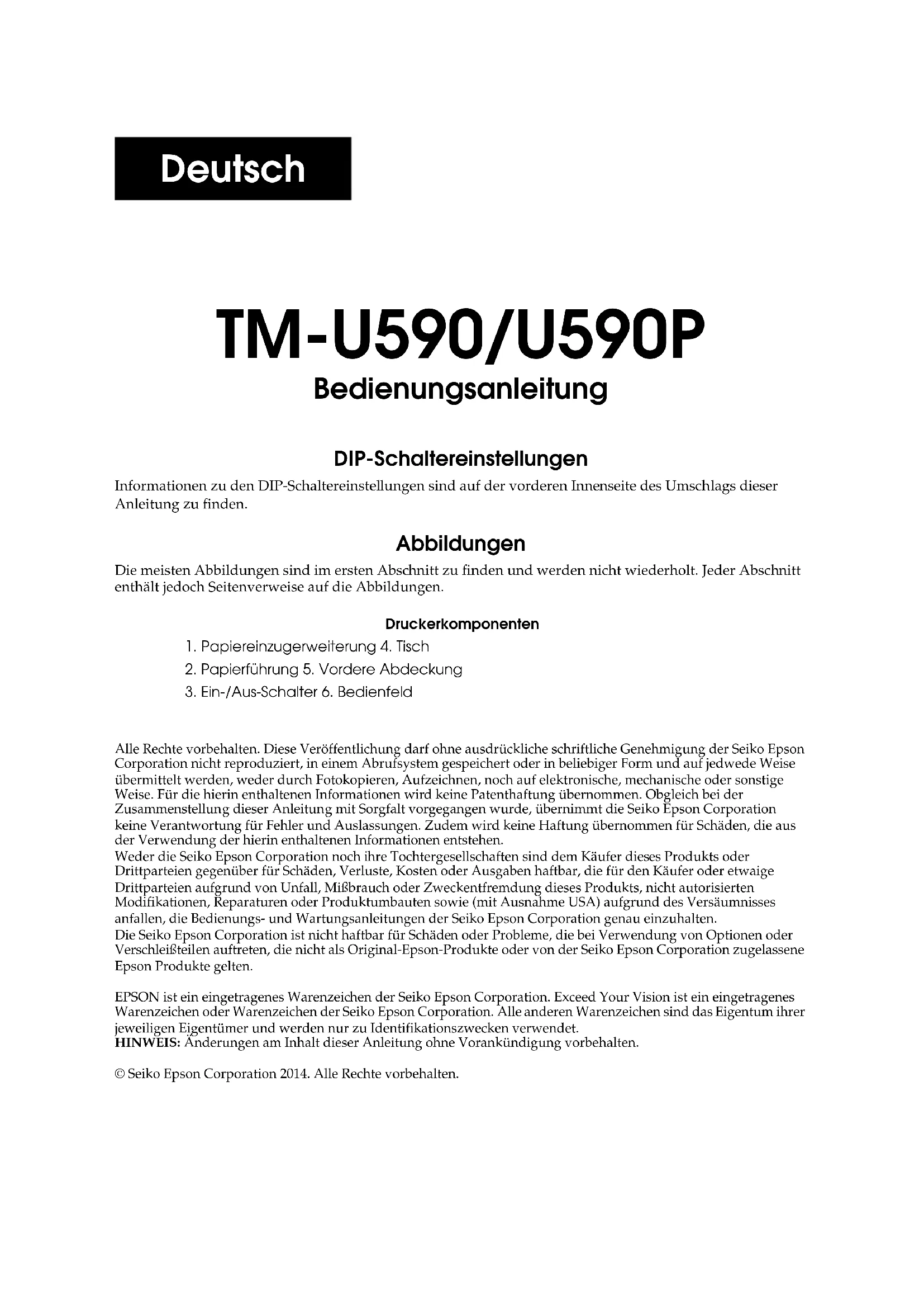 + 24 Vc.c. ± 10 % Consommation électrique (à 24 V) En fonctionnement : Moyenne : approx. 1,9 APointe : approx. 8 A En veille : Moyenne : approx. 0,3 A MTBF 180.000 heures MCBF 29 millions de lignes Température De service : 5 à 45 °C De stockage : -10 à 50 °C, sauf papier Humidité De service :10 à 90 % HR De stockage :10 à 90 % HR, sauf papier Dimensions globales H/L/P :185 × 252 × 266 mm (y compris tablette à documents) Poids (masse) 5 kg environ18 TM-U590/U590P Deutsch TM-U590/U590P Bedienungsanleitung DIP-Schaltereinstellungen Informationen zu den DIP-Schaltereinstellungen sind auf der vorderen Innenseite des Umschlags dieser Anleitung zu finden. Abbildungen Die meisten Abbildungen sind im ersten Abschnitt zu finden und werden nicht wiederholt. Jeder Abschnitt enthält jedoch Seitenverweise auf die Abbildungen. Alle Rechte vorbehalten. Diese Veröffentlichung darf ohne ausdrückliche schriftliche Genehmigung der Seiko Epson Corporation nicht reproduziert, in einem Abrufsystem gespeichert oder in beliebiger Form und auf jedwede Weise übermittelt werden, weder durch Fotokopieren, Aufzeichnen, noch auf elektronische, mechanische oder sonstige Weise. Für die hierin enthaltenen Informationen wird keine Patenthaftung übernommen. Obgleich bei der Zusammenstellung dieser Anleitung mit Sorgfalt vorgegangen wurde, übernimmt die Seiko Epson Corporation keine Verantwortung für Fehler und Auslassungen. Zudem wird keine Haftung übernommen für Schäden, die aus der Verwendung der hierin enthaltenen Informationen entstehen. Weder die Seiko Epson Corporation noch ihre Tochtergesellschaften sind dem Käufer dieses Produkts oder Drittparteien gegenüber für Schäden, Verluste, Kosten oder Ausgaben haftbar, die für den Käufer oder etwaige Drittparteien aufgrund von Unfall, Mißbrauch oder Zweckentfremdung dieses Produkts, nicht autorisierten Modifikationen, Reparaturen oder Produktumbauten sowie (mit Ausnahme USA) aufgrund des Versäumnisses anfallen, die Bedienungs- und Wartungsanleitungen der Seiko Epson Corporation genau einzuhalten. Die Seiko Epson Corporation ist nicht haftbar für Schäden oder Probleme, die bei Verwendung von Optionen oder Verschleißteilen auftreten, die nicht als Original-Epson-Produkte oder von der Seiko Epson Corporation zugelassene Epson Produkte gelten. EPSON ist ein eingetragenes Warenzeichen der Seiko Epson Corporation. Exceed Your Vision ist ein eingetragenes Warenzeichen oder Warenzeichen der Seiko Epson Corporation. Alle anderen Warenzeichen sind das Eigentum ihrer jeweiligen Eigentümer und werden nur zu Identifikationszwecken verwendet. HINWEIS: Änderungen am Inhalt dieser Anleitung ohne Vorankündigung vorbehalten. © Seiko Epson Corporation 2014. Alle Rechte vorbehalten.Druckerkomponenten1. Papiereinzugerweiterung 4. Tisch2. Papierführung 5. Vordere Abdeckung3. Ein-/Aus-Schalter 6. Bedienfeld DeutschTM-U590/U590P Bedienungsanleitung 19 Deutsch Sicherheitshinweise Dieser Abschnitt enthält wichtige Informationen für die sichere und effektive Verwendung dieses Produkts. Lesen Sie diesen Abschnitt sorgfältig durch und bewahren Sie ihn gut zugänglich auf. WARNUNG: Schalten Sie das Gerät sofort aus, wenn Sie Rauch bzw. ungewöhnliche Gerüche oder Geräusche bemerken. Wenn das Gerät weiter verwendet wird, kann dies zu einem Brand führen. Ziehen Sie den Netzstecker des Gerätes sofort aus der Netzsteckdose und benachrichtigen Sie Ihren Händler oder ein Seiko Epson Service Center. Versuchen Sie niemals, dieses Produkt eigenständig zu reparieren. Unsachgemäße Reparaturarbeiten können gefährlich sein. Zerlegen oder modifizieren Sie dieses Produkt nicht. Unsachgemäße Arbeiten an diesem Produkt können zu Verletzungen oder einem Brand führen. Stellen Sie sicher, dass Sie die für dieses Produkt geeignete Stromquelle verwenden. Anschluss an andere Stromquellen können zu einem Brand führen. Vermeiden Sie das Eindringen von Fremdobjekten in dieses Produkt. Das Eindringen von Fremdobjekten kann zu einem Brand führen. Wenn Wasser oder andere Flüssigkeiten in dieses Produkt eindringen, ziehen Sie sofort den Netzstecker heraus und benachrichtigen Sie einen Fachhändler oder Ihr Seiko Epson Service Center. Wenn das Gerät weiter verwendet wird, kann dies einen Brand verursachen. Verwenden Sie keine brennbaren Sprühmittel in und in der Nähe des Gerätes. Brandgefahr! VORSICHT: Schließen Sie Kabel nur auf die in diesem Handbuch beschriebene Weise an. Andere Kabelverbindungen können das Gerät beschädigen und einen Brand verursachen. Stellen Sie dieses Gerät unbedingt auf einer festen, stabilen, horizontalen Fläche auf. Das Produkt kann beim Fallen beschädigt werden oder Verletzungen verursachen. Verwenden Sie das Gerät nicht an Orten mit hohem Feuchtigkeits- oder Staubgehalt. Eine übermäßige Feuchtigkeits- oder Staubentwicklung kann das Gerät beschädigen oder einen Brand verursachen. Stellen Sie keine schweren Gegenstände auf dieses Produkt. Stellen Sie sich nie auf das Produkt und lehnen Sie sich nicht dagegen. Das Gerät kann fallen oder beschädigt werden und dabei Gegenstände beschädigen oder Personen verletzen. Aus Sicherheitsgründen ziehen Sie bitte den Netzstecker aus der Netzsteckdose wenn Sie beabsichtigen, das Gerät über einen längeren Zeitraum nicht zu verwenden.20 TM-U590/U590P Bedienungsanleitung Deutsch Warnschilder Die Warnschilder auf dem Produkt weisen auf die folgenden Sicherheitshinweise hin: WARNUNG: Keine Telefonleitung mit dem Anschluss der Kassenschublade oder dem Anschluss der Kundenanzeige verbinden, da sonst der Drucker und die Telefonleitung beschädigt werden könnten. VORSICHT: Während des Druckvorgangs und nach dem Drucken kann der Druckkopf sehr heiß sein. Verwendungshinweise Wenn dieses Produkt für Anwendungen verwendet wird, bei denen es auf hohe Zuverlässigkeit/Sicherheit ankommt, wie z.B. Transportvorrichtungen beim Flug-, Zug-, Schiffs- und Kfz-Verkehr usw.; Vorrichtungen zur Katastr