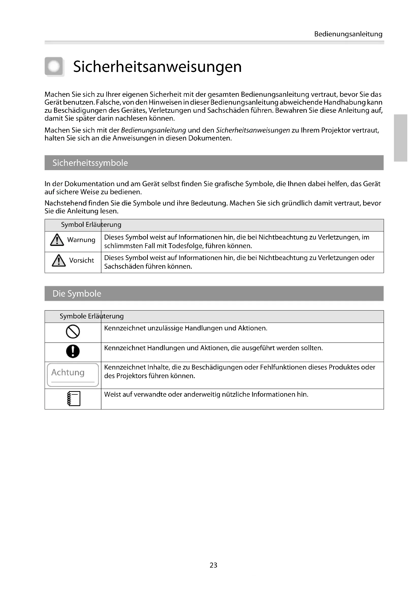 Sicherheitsanweisungen Machen Sie sich zu Ihrer eigenen Sicherheit mit der gesamten Bedienungsanleitung vertraut, bevor Sie das Gerät benutzen. Falsche, von den Hinweisen in dieser Bedienungsanleitung abweichende Handhabung kann zu Beschädigungen des Gerätes, Verletzungen und Sachschäden führen. Bewahren Sie diese Anleitung auf, damit Sie später darin nachlesen können. Machen Sie sich mit der Bedienungsanleitung und den Sicherheitsanweisungen zu Ihrem Projektor vertraut, halten Sie sich an die Anweisungen in diesen Dokumenten. Sicherheitssymbole In der Dokumentation und am Gerät selbst finden Sie grafische Symbole, die Ihnen dabei helfen, das Gerät auf sichere Weise zu bedienen. Nachstehend finden Sie die Symbole und ihre Bedeutung. Machen Sie sich gründlich damit vertraut, bevor Sie die Anleitung lesen. Symbol Erläuterung Warnung Dieses Symbol weist auf Informationen hin, die bei Nichtbeachtung zu Verletzungen, im schlimmsten Fall mit Todesfolge, führen können. Vorsicht Dieses Symbol weist auf Informationen hin, die bei Nichtbeachtung zu Verletzungen oder Sachschäden führen können. Die Symbole Symbole Erläuterung Kennzeichnet unzulässige Handlungen und Aktionen. Kennzeichnet Handlungen und Aktionen, die ausgeführt werden sollten. Achtung Kennzeichnet Inhalte, die zu Beschädigungen oder Fehlfunktionen dieses Produktes oder des Projektors führen können.