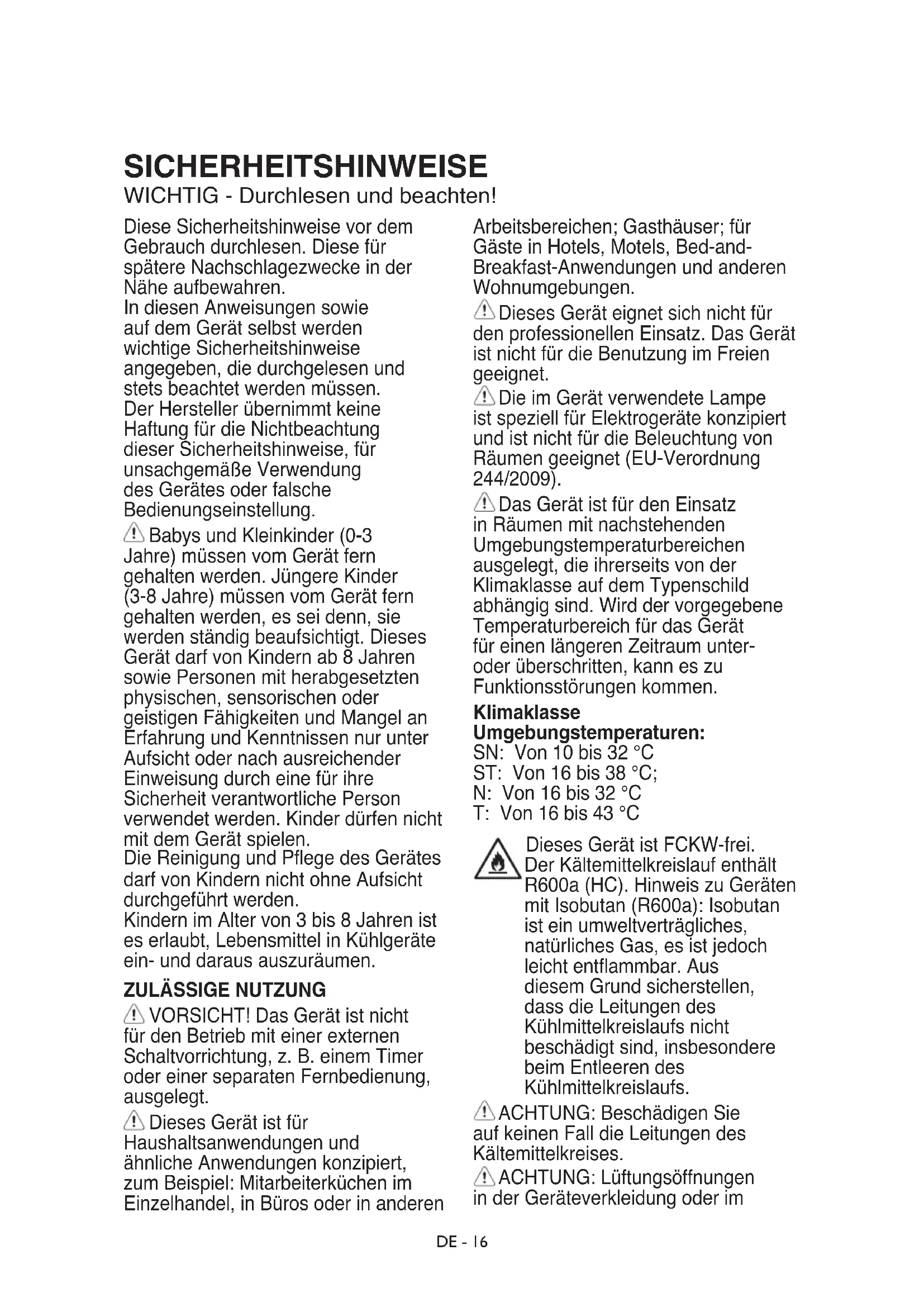 VORSICHT! Das Gerät ist nicht für den Betrieb mit einer externen Schaltvorrichtung, z. B. einem Timer oder einer separaten Fernbedienung, ausgelegt. Dieses Gerät ist für Haushaltsanwendungen und ähnliche Anwendungen konzipiert, zum Beispiel: Mitarbeiterküchen im Einzelhandel, in Büros oder in anderen Arbeitsbereichen; Gasthäuser; für Gäste in Hotels, Motels, Bed-and- Breakfast-Anwendungen und anderen Wohnumgebungen. Dieses Gerät eignet sich nicht für den professionellen Einsatz. Das Gerät ist nicht für die Benutzung im Freien geeignet. Die im Gerät verwendete Lampe ist speziell für Elektrogeräte konzipiert und ist nicht für die Beleuchtung von Räumen geeignet (EU-Verordnung 244/2009). Das Gerät ist für den Einsatz in Räumen mit nachstehenden Umgebungstemperaturbereichen ausgelegt, die ihrerseits von der Klimaklasse auf dem Typenschild abhängig sind. Wird der vorgegebene Temperaturbereich für das Gerät für einen längeren Zeitraum unter- oder überschritten, kann es zu Funktionsstörungen kommen. Klimaklasse Umgebungstemperaturen: SN: Von 10 bis 32 °C ST: Von 16 bis 38 °C; N: Von 16 bis 32 °C T: Von 16 bis 43 °C Dieses Gerät ist FCKW-frei. Der Kältemittelkreislauf enthält R600a (HC). Hinweis zu Geräten mit Isobutan (R600a): Isobutan ist ein umweltverträgliches, natürliches Gas, es ist jedoch leicht entammbar. Aus diesem Grund sicherstellen, dass die Leitungen des Kühlmittelkreislaufs nicht beschädigt sind, insbesondere beim Entleeren des Kühlmittelkreislaufs. ACHTUNG: Beschädigen Sie auf keinen Fall die Leitungen des Kältemittelkreises. ACHTUNG: Lüftungsöffnungen in der Geräteverkleidung oder imDE - 17 Einbaumöbel sind von Behinderungen frei zu halten. ACHTUNG: Zum Beschleunigen des Abtauvorganges niemals zu anderen mechanischen, elektrischen oder chemischen Hilfsmitteln greifen als zu den vom Hersteller empfohlenen. ACHTUNG: Verwenden Sie keine elektrischen Geräte in den Fächern des Gerätes, wenn deren Einsatz nicht explizit vom Hersteller zugelassen worden ist. ACHTUNG: Eisbereiter und/oder Wasserspender, die nicht direkt mit der Wasserleitung verbunden sind, dürfen nur mit Trinkwasser befüllt werden. ACHTUNG: Automatische Eisbereiter und/oder Wasserspender müssen an eine Wasserleitung angeschlossen werden, die nur Trinkwasser mit einem Wasserleitungsdruck zwischen 0,17 und 0,81 MPa (1,7 und 8,1 bar) liefert. Bewahren Sie keine explosionsgefährdeten Stoffe wie Spraydosen im oder in der Nähe des Gerätes auf. Das gleiche gilt für Benzin und sonstige entammbare Stoffe und deren Verwendung. Die in den Kühlakkus (bei manchen Modellen vorhanden) enthaltene (ungiftige) Flüssigkeit darf nicht verschluckt werden. Verzehren Sie Eiswürfel oder Wassereis nicht unmittelbar nach der Entnahme aus dem Gefrierfach, da sie Kälteverbrennungen hervorrufen können. Bei Produkten, die für den Gebrauch eines Luftlters hinter einer zugänglichen Lüfterabdeckung ausgelegt sind, muss der Filter bei laufendem Kühlschrank stets eingesetzt sein. Bewahren Sie keine Glasbehälter mit Flüssigkeiten im Gefrierfach, sie könnten zerbrechen. Blockieren Sie das Gebläse (falls inbegriffen) nicht mit Lebensmitteln. Prüfen Sie nach dem Ablegen von Lebensmitteln, ob die Tür der Fächer korrekt schließt, besonders die Tür des Gefrierfachs. Beschädigte Dichtungen müssen so schnell wie möglich ausgetauscht werden. Verwenden Sie das Kühlfach nur zur Aufbewahrung von frischen Lebensmitteln und das Gefrierfach nur zur Aufbewahrung von gefrorenen Lebensmitteln, zum Einfrieren von frischen Lebensmitteln und zur Herstellung von Eiswürfeln. Unverpackte Lebensmittel so lagern, dass sie nicht mit den Innenwänden des Kühl- bzw. Gefrierfachs in Berührung kommen. Möglicherweise verfügt das Gerät über Sonderfächer (Frischefach, Null-Grad- Box, ...). Falls nicht anderweitig in der Anleitung des Gerätes anders angegeben, können diese für eine gleichmäßige Funktion im gesamten Gerät herausgenommen werden. Das brennbare Gas C-Pentan wird als Treibmittel im Isolierschaum eingesetzt. Die für die Lagerung von bestimmten Arten von Lebensmitteln am besten geeigneten Fächer des Geräts werden unter Berücksichtigung der unterschiedlichen Temperaturverteilung in den verschiedenen Fächern des Geräts wie folgt eingeteilt: - Kühlschrankfach: