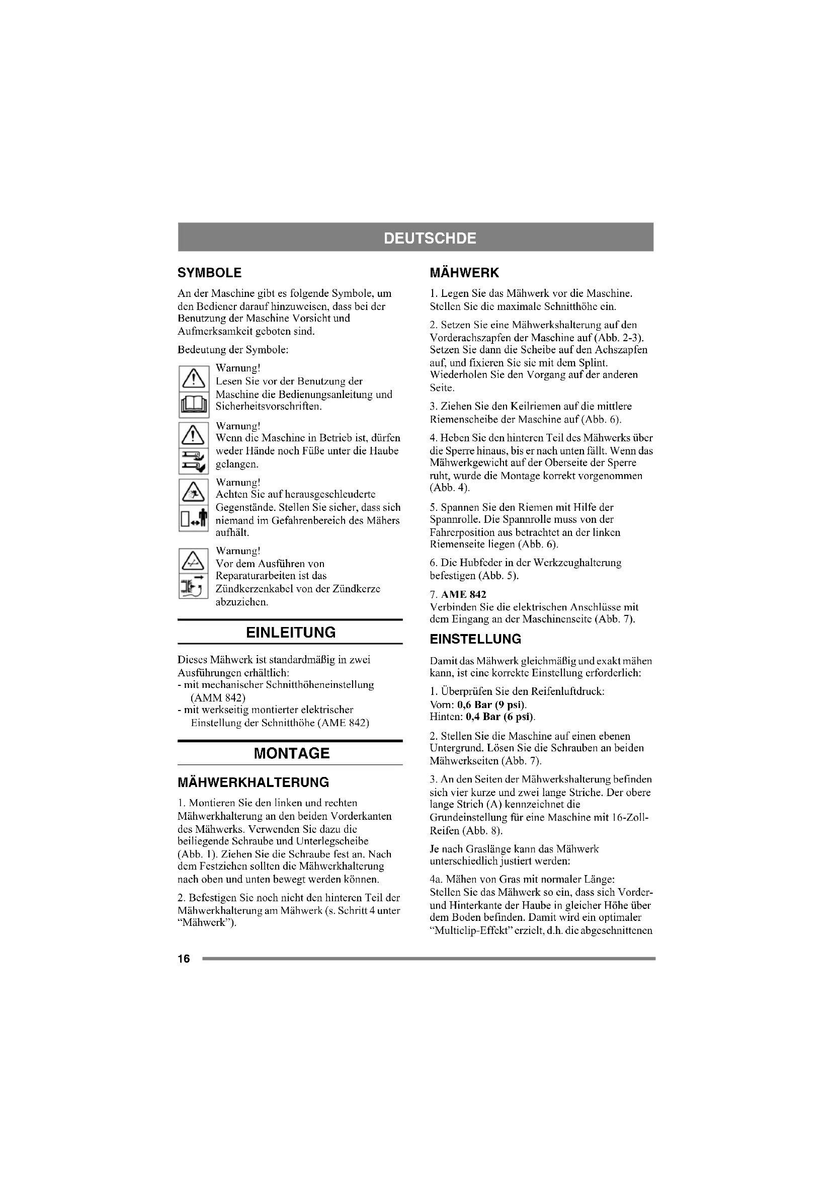 DEUTSCHDE SYMBOLE An der Maschine gibt es folgende Symbole, um den Bediener darauf hinzuweisen, dass bei der Benutzung der Maschine Vorsicht und Aufmerksamkeit geboten sind. Bedeutung der Symbole: Warnung! Lesen Sie vor der Benutzung der Maschine die Bedienungsanleitung und Sicherheitsvorschriften. Warnung! Wenn die Maschine in Betrieb ist, dürfen weder Hände noch Füße unter die Haube gelangen. Warnung! Achten Sie auf herausgeschleuderte Gegenstände. Stellen Sie sicher, dass sich niemand im Gefahrenbereich des Mähers aufhält. Warnung! Vor dem Ausführen von Reparaturarbeiten ist das Zündkerzenkabel von der Zündkerze abzuziehen. EINLEITUNG Dieses Mähwerk ist standardmäßig in zwei Ausführungen erhältlich: - mit mechanischer Schnitthöheneinstellung (AMM 842) - mit werkseitig montierter elektrischer Einstellung der Schnitthöhe (AME 842) MONTAGE MÄHWERKHALTERUNG