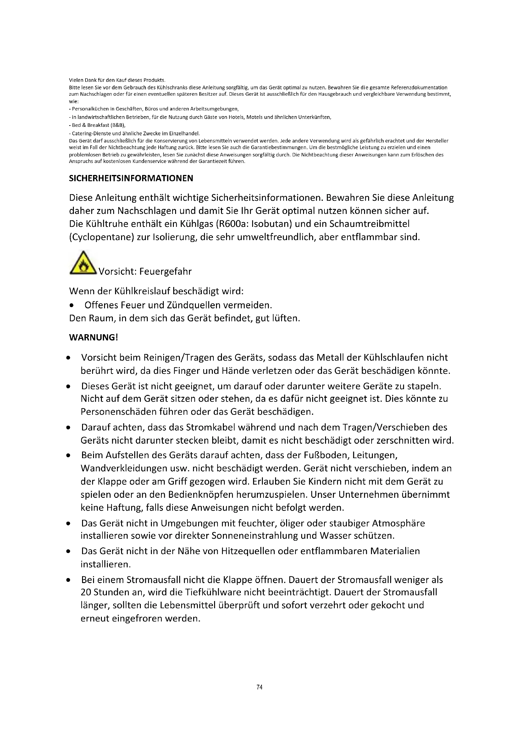 Este electrodoméstico cumple la directiva europea 2012/19/EU en materia de Residuos de Aparatos Eléctricos y Electrónicos (RAEE). Los RAEE contienen tanto sustancias contaminantes (que pueden conllevar consecuencias negativas para el medio ambiente) como componentes básicos (que se pueden reutilizar). Es importante que los RAEE se sometan a tratamientos específicos para eliminar y desechar adecuadamente los contaminantes y recuperar y reciclar todos los materiales. Las personas desempeñan un papel clave a la hora de garantizar que los RAEE no se conviertan en un problema medioambiental. Para ello, es esencial seguir ciertas normas básicas: Los RAEE no deben recibir el mismo tratamiento que los residuos domésticos. Los RAEE deben depositarse en los puntos limpios pertinentes, gestionados por las autoridades locales o por empresas autorizadas. En muchos países, existe un servicio de recogida a domicilio de RAEE de gran tamaño. En muchos países, al comprar un electrodoméstico nuevo, el distribuidor podría encargarse de la recogida del antiguo de forma totalmente gratuita, siempre y cuando el equipo tenga características similares y sea del mismo tipo que el equipo suministrado. Conformidad Mediante la colocación de la marca en este producto confirmamos el cumplimiento de todos los requisitos legislativos europeos relevantes en materia de seguridad, salud y medio ambiente establecidos para este producto. 73Vielen Dank für den Kauf dieses Produkts. Bitte lesen Sie vor dem Gebrauch des Kühlschranks diese Anleitung sorgfältig, um das Gerät optimal zu nutzen. Bewahren Sie die gesamte Referenzdokumentation zum Nachschlagen oder für einen eventuellen späteren Besitzer auf. Dieses Gerät ist ausschließlich für den Hausgebrauch und vergleichbare Verwendung bestimmt, wie: - Personalküchen in Geschäften, Büros und anderen Arbeitsumgebungen, - in landwirtschaftlichen Betrieben, für die Nutzung durch Gäste von Hotels, Motels und ähnlichen Unterkünften, - Bed & Breakfast (B&B), - Catering-Dienste und ähnliche Zwecke im Einzelhandel. Das Gerät darf ausschließlich für die Konservierung von Lebensmitteln verwendet werden. Jede andere Verwendung wird als gefährlich erachtet und der Hersteller weist im Fall der Nichtbeachtung jede Haftung zurück. Bitte lesen Sie auch die Garantiebestimmungen. Um die bestmögliche Leistung zu erzielen und einen problemlosen Betrieb zu gewährleisten, lesen Sie zunächst diese Anweisungen sorgfältig durch. Die Nichtbeachtung dieser Anweisungen kann zum Erlöschen des Anspruchs auf kostenlosen Kundenservice während der Garantiezeit führen. SICHERHEITSINFORMATIONEN Diese Anleitung enthält wichtige Sicherheitsinformationen. Bewahren Sie diese Anleitung daher zum Nachschlagen und damit Sie Ihr Gerät optimal nutzen können sicher auf. Die Kühltruhe enthält ein Kühlgas (R600a: Isobutan) und ein Schaumtreibmittel (Cyclopentane) zur Isolierung, die sehr umweltfreundlich, aber entflammbar sind. Vorsicht: Feuergefahr Wenn der Kühlkreislauf beschädigt wird: