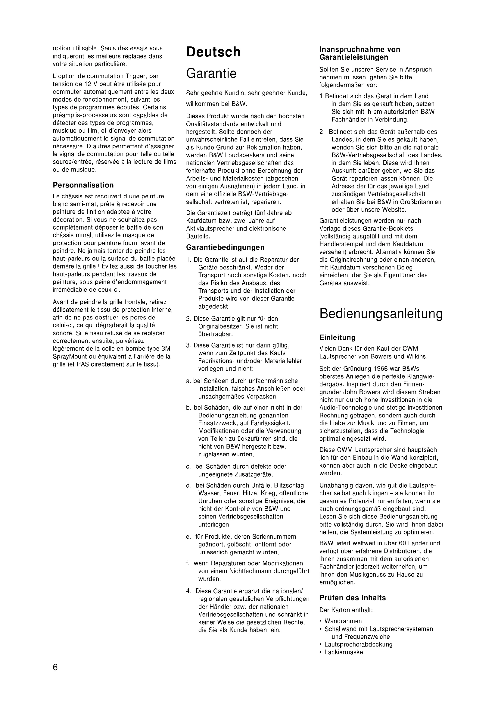 Landes, in dem Sie es gekauft haben, wenden Sie sich bitte an die nationale B&W-Vertriebsgesellschaft des Landes, in dem Sie leben. Diese wird Ihnen Auskunft darüber geben, wo Sie das Gerät reparieren lassen können. Die Adresse der für das jeweilige Land zuständigen Vertriebsgesellschaft erhalten Sie bei B&W in Großbritannien oder über unsere Website. Garantieleistungen werden nur nach Vorlage dieses Garantie-Booklets (vollständig ausgefüllt und mit dem Händlerstempel und dem Kaufdatum versehen) erbracht. Alternativ können Sie die Originalrechnung oder einen anderen, mit Kaufdatum versehenen Beleg einreichen, der Sie als Eigentümer des Gerätes ausweist. Bedienungsanleitung Einleitung Vielen Dank für den Kauf der CWM- Lautsprecher von Bowers und Wilkins. Seit der Gründung 1966 war B&Ws oberstes Anliegen die perfekte Klangwie- dergabe. Inspiriert durch den Firmen- gründer John Bowers wird diesem Streben nicht nur durch hohe Investitionen in die Audio-Technologie und stetige Investitionen Rechnung getragen, sondern auch durch die Liebe zur Musik und zu Filmen, um sicherzustellen, dass die Technologie optimal eingesetzt wird. Diese CWM-Lautsprecher sind hauptsäch- lich für den Einbau in die Wand konzipiert, können aber auch in die Decke eingebaut werden. Unabhängig davon, wie gut die Lautspre- cher selbst auch klingen – sie können ihr gesamtes Potenzial nur entfalten, wenn sie auch ordnungsgemäß eingebaut sind. Lesen Sie sich diese Bedienungsanleitung bitte vollständig durch. Sie wird Ihnen dabei helfen, die Systemleistung zu optimieren. B&W liefert weltweit in über 60 Länder und verfügt über erfahrene Distributoren, die Ihnen zusammen mit dem autorisierten Fachhändler jederzeit weiterhelfen, um Ihnen den Musikgenuss zu Hause zu ermöglichen. Prüfen des Inhalts Der Karton enthält: