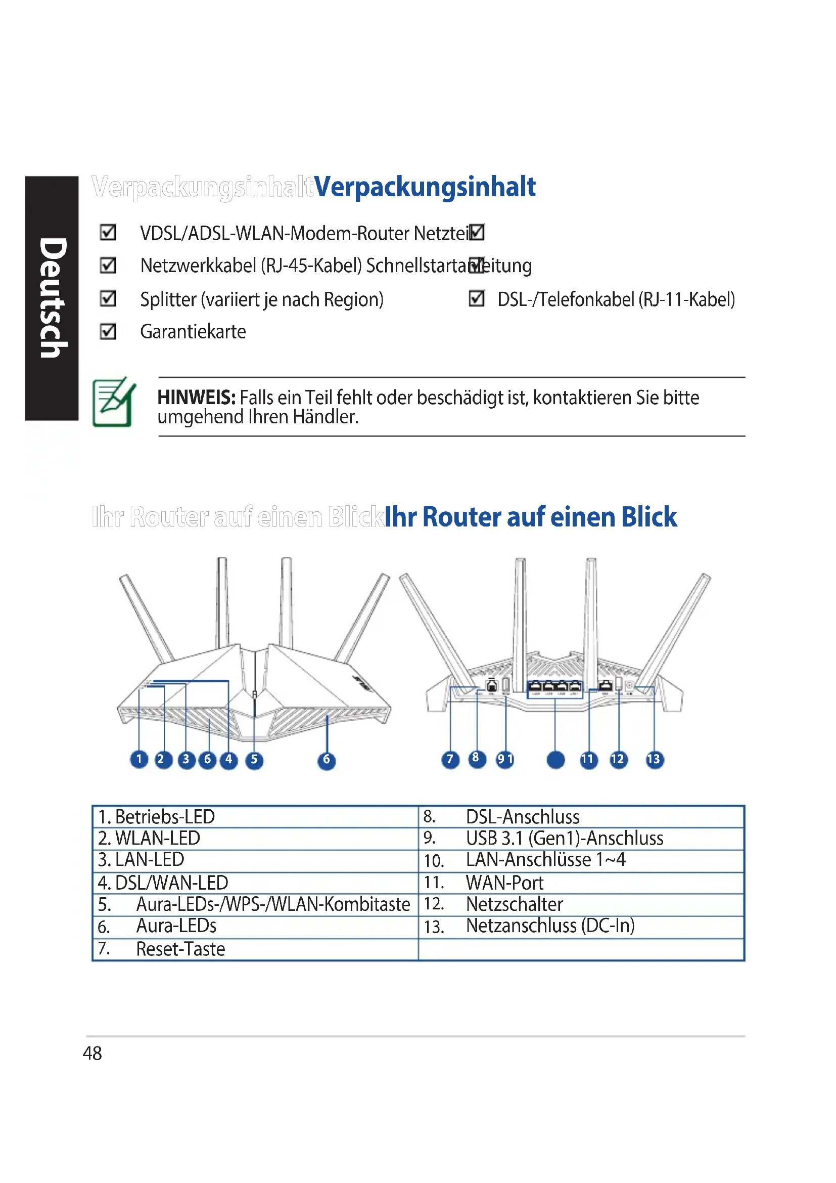 - Voit hakea online-käyttöoppaan osoitteesta https://www.asus.com/support48 Deutsch Ihr Router auf einen BlickIhr Router auf einen Blick HINWEIS: Falls ein Teil fehlt oder beschädigt ist, kontaktieren Sie bitte umgehend Ihren Händler. VerpackungsinhaltVerpackungsinhalt VDSL/ADSL-WLAN-Modem-Router Netzteil Netzwerkkabel (RJ-45-Kabel) Schnellstartanleitung Splitter (variiert je nach Region) DSL-/Telefonkabel (RJ-11-Kabel) Garantiekarte
