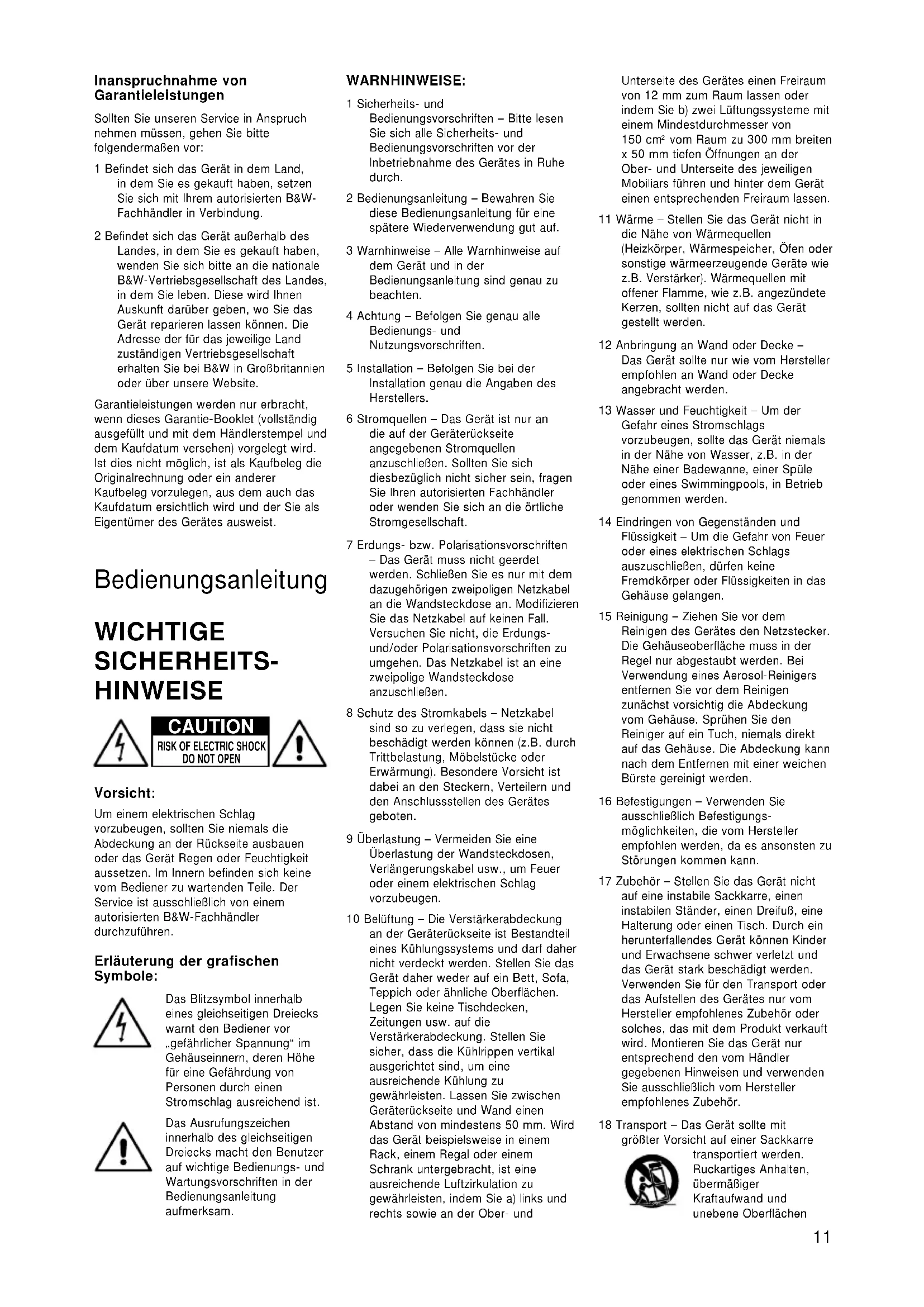 DO NOT OPENkönnen zu einem Umfallen von Sackkarre samt Gerät führen. Stellen Sie sicher, dass sich unter dem Teppich keine Kabel befinden, die durch die Spikes beschädigt werden könnten. Bewegen Sie das Gerät nicht auf den Spikes, da diese sich hierbei vom Gehäuse lösen können. Dies kann zu Beschädigungen führen. Achten Sie darauf, dass Sie sich beim Heben des Gerätes nicht an den Spikes verletzen. 19 Phasen der Nichtbenutzung – Ziehen Sie den Netzstecker bei Gewitter oder wenn Sie das Gerät für eine längere Zeit nicht in Betrieb nehmen aus der Steckdose. 20 Service – Außer den in der Bedienungsanleitung beschriebenen Handgriffen sollten vom Bediener keine Arbeiten am Gerät vorgenommen werden. Das Gerät ist ausschließlich von einem qualifizierten Fachmann zu öffnen und zu reparieren. 21 Durch geschultes Fachpersonal zu reparierende Schäden – Schalten Sie das Gerät sofort aus und ziehen Sie geschultes Personal zu Rate, wenn: a Das Netzkabel oder der Stecker beschädigt sind. b Gegenstände bzw. Flüssigkeit in das Gerät gelangt sind. c Das Gerät Regen ausgesetzt war. d Das Gerät trotz Beachten der Bedienhinweise nicht ordnungsgemäß funktioniert. Stellen Sie nur die Bedienelemente ein, die in der Anleitung entsprechend ausgewiesen sind. Ein nicht ordnungsgemäßes Einstellen anderer Bedienelemente kann zu Schäden führen, die anschließend von einem qualifizierten Techniker behoben werden müssen, um das Gerät in seinen normalen Betriebszustand zurückzusetzen. e Das Gerät hingefallen ist bzw. beschädigt wurde. f Das Gerät nicht ordnungsgemäß funktioniert bzw. eine deutliche Leistungsminderung aufweist. 22 Ersatzteile – Werden Ersatzteile benötigt, vergewissern Sie sich, dass der Servicetechniker die vom Hersteller empfohlenen Teile verwendet, oder solche, die dieselben Technischen Daten aufweisen wie das Originalteil. Nicht zugelassene Ersatzteile können zu Feuer, einem elektrischen Schlag oder sonstigen Gefahren führen. 23 Netzsicherungen – Um eine Brandgefahr auszuschließen, sind nur Sicherungen des vom Hersteller angegebenen Typs mit den vom Hersteller angegebenen Nenndaten zu verwenden. Der Verstärker ist für einen Betrieb bei Wechselspannungen von 100 bis 230 Volt ausgelegt, jedoch sind abhängig von der Netzspannung unterschiedliche Sicherungstypen einzusetzen. Die Technischen Daten für die in den einzelnen Spannungsbereichen zu verwendenden Sicherungen sind auf dem Gerät angegeben. 24 Sicherheitsprüfung – Nach Beendigung der Service- bzw. Reparaturarbeiten bitten Sie den Servicetechniker, eine Sicherheitsprüfung durchzuführen. Dadurch wird sichergestellt, dass das Gerät ordnungsgemäß funktioniert. 25 Magnetische Streufelder – Das Gerät erzeugt ein magnetisches Streufeld. Daher empfehlen wir, einen Mindestabstand von 0,5 m zwischen magnetisch empfindlichen Artikeln (Fernseh- und Computerbildschirmen, mechanischen Armbanduhren, Audio- und Videobändern usw.) und Lautsprecher zu bewahren. Einleitung Vielen Dank, daß Sie sich für diesen aktiven B&W-Subwoofer ASW entschieden haben. Seit der Gründung 1966 war B&Ws oberstes Anliegen die perfekte Klangwiedergabe. Inspiriert durch den Firmengründer John Bowers wird diesem Streben nicht nur durch hohe Investitionen in die Audio-Technologie und stetige Innovationen Rechnung getragen, sondern auch durch die Liebe zur Musik, um sicherzustellen, daß die Technologie auch in neuen Anwendungsbereichen wie HiFi- Cinema optimal eingesetzt wird. Dieser Subwoofer ist für HiFi-Cinema- Anwendungen geeignet. In 2-Kanal-Audio- Anwendungen besteht seine Aufgabe darin, die Tieftonleistung von „Full Range“- Lautsprechern, d.h. Lautsprechern, die das komplette Klangspektrum abdecken, zu steigern. Die Verwendung dieses Subwoofers erweitert nicht nur den Baß im Tieftonbereich, sondern verbessert auch die Transparenz im Mitteltonbereich durch Entlastung der anderen Lautsprecher im Tieftonbereich. Bitte lesen Sie sich diese Bedienungsanleitung vor Inbetriebnahme des Subwoofers aufmerksam durch. Das Aufstellen von Beschallungsanlagen verlangt einige Planung und Experimentierfreudigkeit, wenn Sie das bestmögliche Ergebnis erzielen möchten. Diese Bedienungsanleitung wird Ihnen dabei helfen. Bevor Sie den Subwoofer an das Netz anschließen, sollten Sie sich mit den Sicherheitshinweisen vertraut machen. Beachten Sie alle Warnhinweise. Bewahren Sie diese Bedienungsanleitung sorgfältig auf. B&W liefert in über 60 Länder und verfügt weltweit über ein Netz erfahrener Distributoren, die Ihnen zusammen mit den autorisierten B&W-Fachhändlern weiterhelfen, um Ihnen den Musikgenuß zu Hause zu ermöglichen. Auspacken (Abbildung 1) Gehen Sie beim Auspacken des Subwoofers folgendermaßen vor: