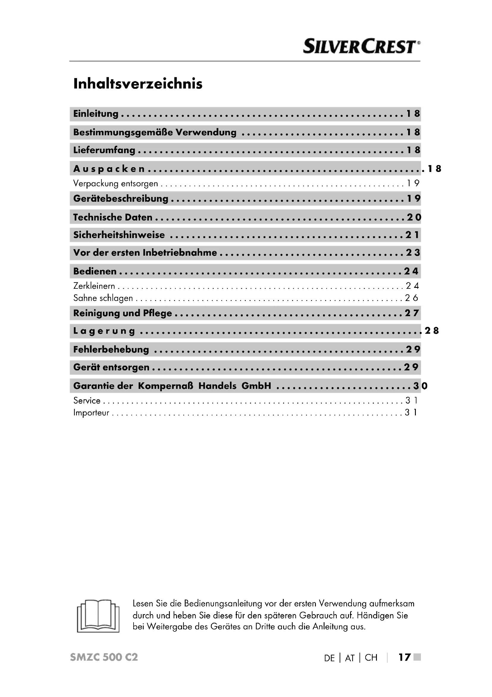 - Importeur Lesen Sie die Bedienungsanleitung vor der ersten Verwendung aufmerksam durch und heben Sie diese für den späteren Gebrauch auf. Händigen Sie bei Weitergabe des Gerätes an Dritte auch die Anleitung aus.SMZC 500 C2 ■ 18 p. 31