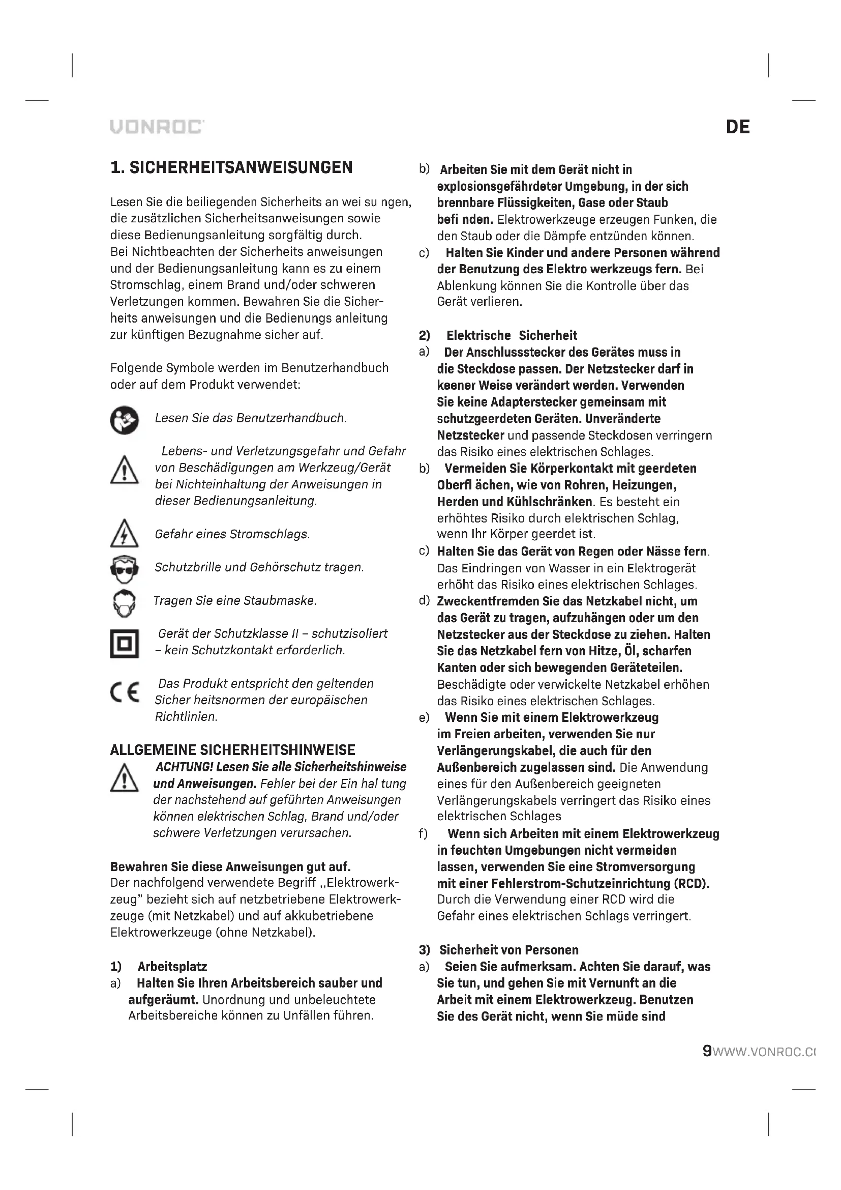 Lesen Sie die beiliegenden Sicherheits an wei su ngen, die zusätzlichen Sicherheitsanweisungen sowie diese Bedienungsanleitung sorgfältig durch. Bei Nichtbeachten der Sicherheits anweisungen und der Bedienungsanleitung kann es zu einem Stromschlag, einem Brand und/oder schweren Verletzungen kommen. Bewahren Sie die Sicher- heits anweisungen und die Bedienungs anleitung zur künftigen Bezugnahme sicher auf. Folgende Symbole werden im Benutzerhandbuch oder auf dem Produkt verwendet: Lesen Sie das Benutzerhandbuch. Lebens- und Verletzungsgefahr und Gefahr von Beschädigungen am Werkzeug/Gerät bei Nichteinhaltung der Anweisungen in dieser Bedienungsanleitung. Gefahr eines Stromschlags. Schutzbrille und Gehörschutz tragen. Tragen Sie eine Staubmaske. Gerät der Schutzklasse II – schutzisoliert – kein Schutzkontakt erforderlich. Das Produkt entspricht den geltenden Sicher heitsnormen der europäischen Richtlinien. ALLGEMEINE SICHERHEITSHINWEISE ACHTUNG! Lesen Sie alle Sicherheitshinweise und Anweisungen. Fehler bei der Ein hal tung der nachstehend auf geführten Anweisungen können elektrischen Schlag, Brand und/oder schwere Verletzungen verursachen. Bewahren Sie diese Anweisungen gut auf. Der nachfolgend verwendete Begriff ,,Elektrowerk- zeug” bezieht sich auf netzbetriebene Elektrowerk- zeuge (mit Netzkabel) und auf akkubetriebene Elektrowerkzeuge (ohne Netzkabel).