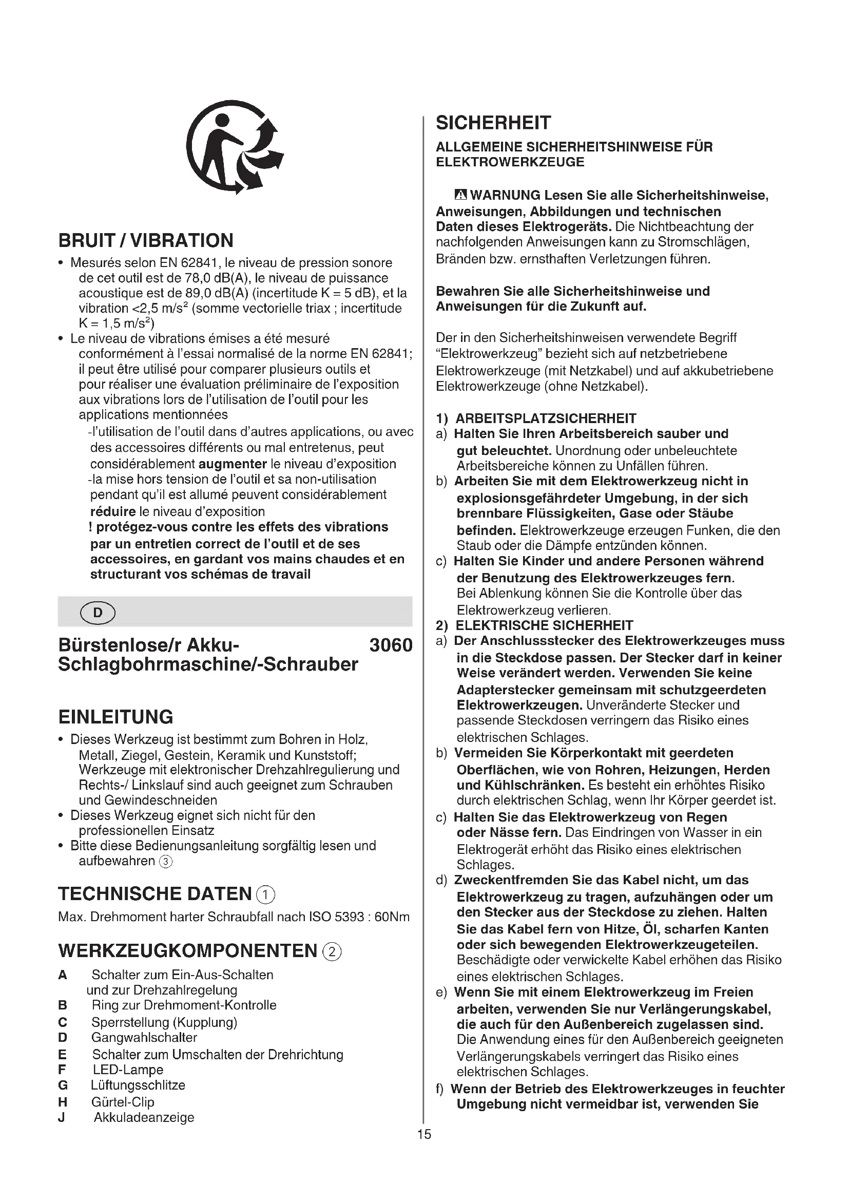 A Schalter zum Ein-Aus-Schalten und zur Drehzahlregelung B Ring zur Drehmoment-Kontrolle C Sperrstellung (Kupplung) D Gangwahlschalter E Schalter zum Umschalten der Drehrichtung F LED-Lampe G Lüftungsschlitze H Gürtel-Clip J Akkuladeanzeige16 repariert werden. c) Ziehen Sie den Stecker aus der Steckdose und/ oder entfernen Sie einen abnehmbaren Akku, bevor Sie Geräteeinstellungen vornehmen, Zubehörteile wechseln oder das Elektrowerkzeug weglegen. Diese Vorsichtsmaßnahme verhindert den unbeabsichtigten Start des Elektrowerkzeuges. d) Bewahren Sie unbenutzte Elektrowerkzeuge außerhalb der Reichweite von Kindern auf. Lassen Sie Personen das Elektrowerkzeug nicht benutzen, die mit diesem nicht vertraut sind oder diese Anweisungen nicht gelesen haben. Elektrowerkzeuge sind gefährlich, wenn Sie von unerfahrenen Personen benutzt werden. e) Pegen Sie Elektrowerkzeuge und Zubehör mit Sorgfalt. Kontrollieren Sie, ob bewegliche Elektrowerkzeugeteile einwandfrei funktionieren und nicht klemmen, ob Teile gebrochen oder so beschädigt sind, dass die Funktion des Elektrowerkzeuges beeinträchtigt ist. Lassen Sie beschädigte Teile vor dem Einsatz des Elektrowerkzeuges reparieren. Viele Unfälle haben ihre Ursache in schlecht gewarteten Elektrowerkzeugen. f) Halten Sie Schneidwerkzeuge scharf und sauber. Sorgfältig gepegte Schneidwerkzeuge mit scharfen Schneidkanten verklemmen sich weniger und sind leichter zu führen. g) Verwenden Sie Elektrowerkzeug, Zubehör, Einsatzwerkzeuge usw. entsprechend diesen Anweisungen. Berücksichtigen Sie dabei die Arbeitsbedingungen und die auszuführende Tätigkeit. Der Gebrauch von Elektrowerkzeugen für andere als die vorgesehenen Anwendungen kann zu gefährlichen Situationen führen. h) Halten Sie Grie und Griächen trocken, sauber und frei von Öl und Fett. Rutschige Grie und Griächen erlauben keine sichere Bedienung und Kontrolle des Elektrowerkzeuges in unvorhergesehenen Situationen.