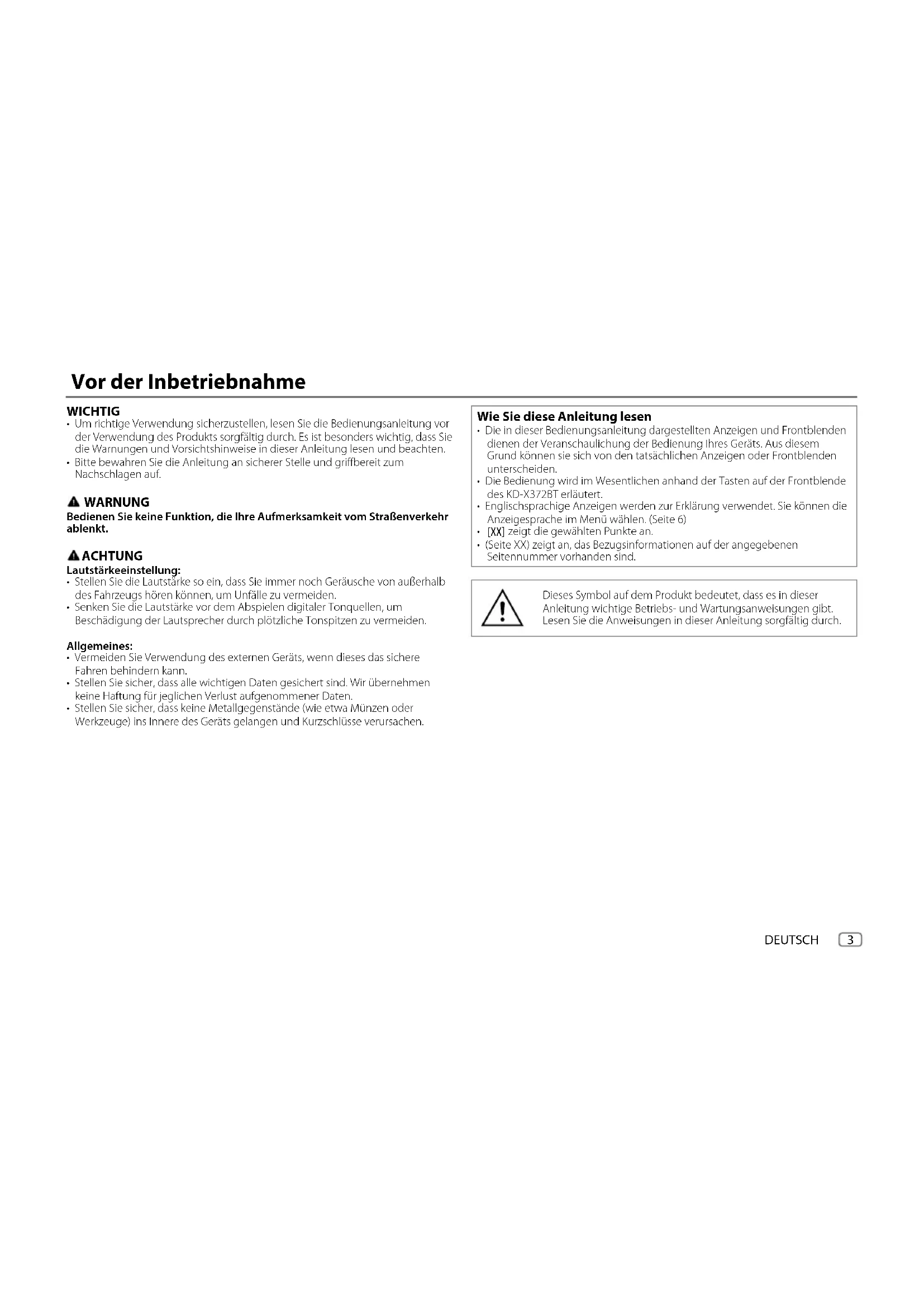 - Bitte bewahren Sie die Anleitung an sicherer Stelle und griffbereit zum Nachschlagen auf. WARNUNG Bedienen Sie keine Funktion, die Ihre Aufmerksamkeit vom Straßenverkehr ablenkt. ACHTUNG Lautstärkeeinstellung: