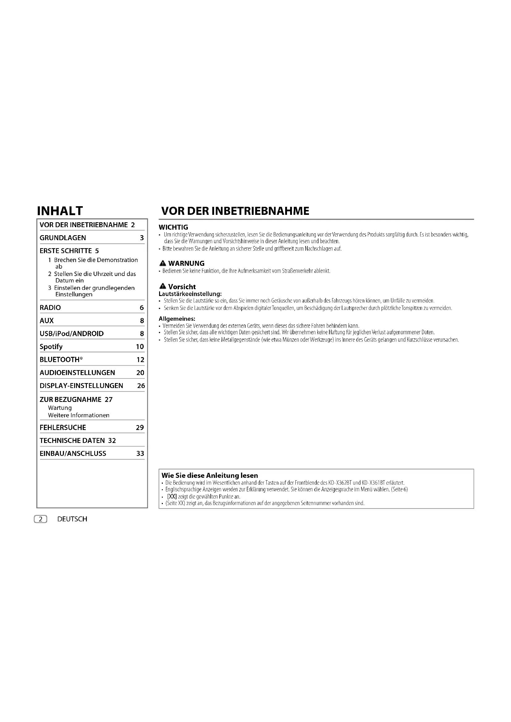 2 Stellen Sie die Uhrzeit und das Datum ein 3 Einstellen der grundlegenden Einstellungen RADIO 6 AUX 8 USB/iPod/ANDROID 8 Spotify 10 BLUETOOTH® 12 AUDIOEINSTELLUNGEN 20 DISPLAY-EINSTELLUNGEN 26 ZUR BEZUGNAHME 27 Wartung Weitere Informationen FEHLERSUCHE 29 TECHNISCHE DATEN 32 EINBAU/ANSCHLUSS 33 Wie Sie diese Anleitung lesen