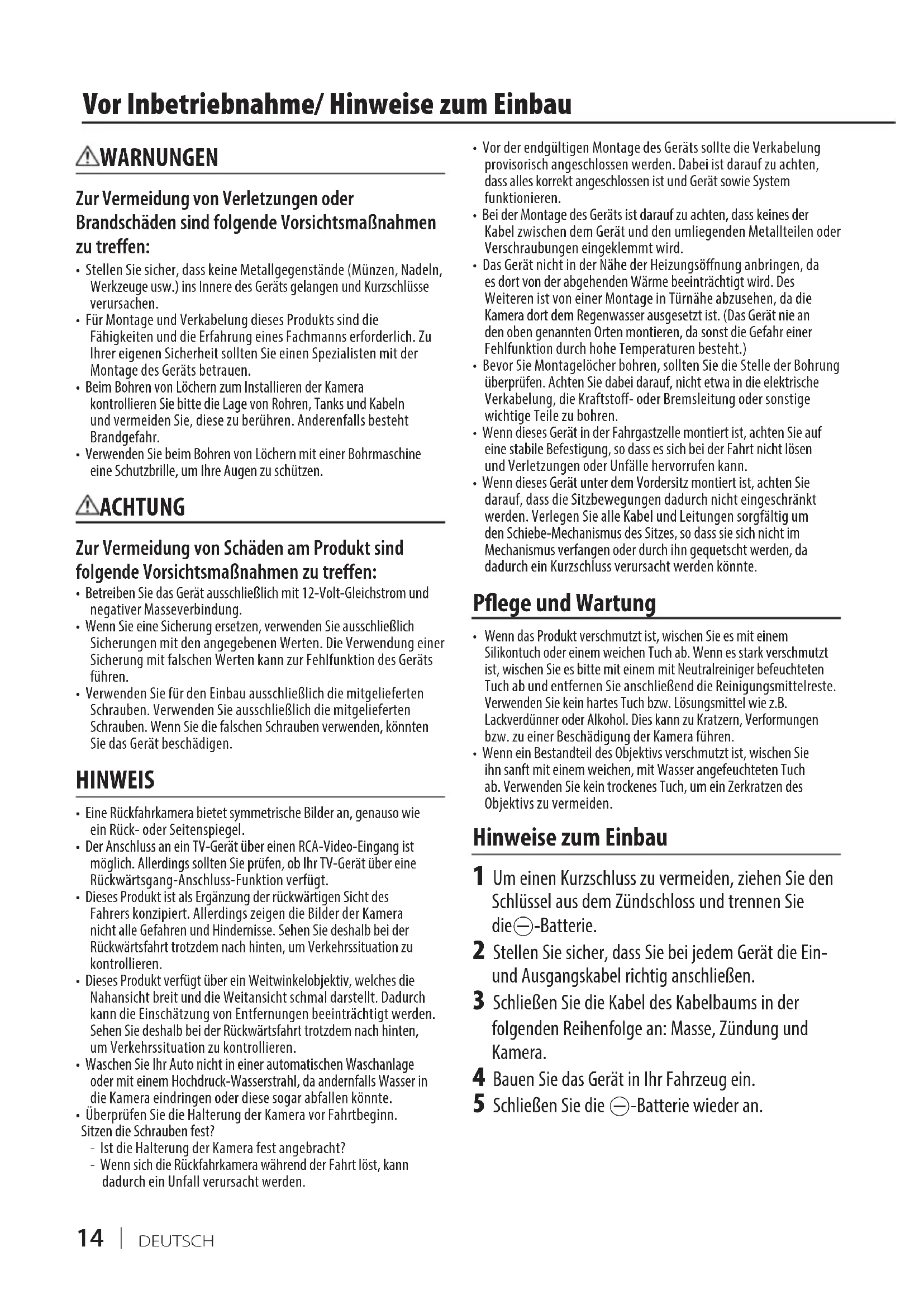 Wenn das Produkt verschmutzt ist, wischen Sie es mit einem Silikontuch oder einem weichen Tuch ab. Wenn es stark verschmutzt ist, wischen Sie es bitte mit einem mit Neutralreiniger befeuchteten Tuch ab und entfernen Sie anschließend die Reinigungsmittelreste. Verwenden Sie kein hartes Tuch bzw. Lösungsmittel wie z.B. Lackverdünner oder Alkohol. Dies kann zu Kratzern, Verformungen bzw. zu einer Beschädigung der Kamera führen.• Wenn ein Bestandteil des Objektivs verschmutzt ist, wischen Sie ihn sanft mit einem weichen, mit Wasser angefeuchteten Tuch ab. Verwenden Sie kein trockenes Tuch, um ein Zerkratzen des Objektivs zu vermeiden. Hinweise zum Einbau 1 Um einen Kurzschluss zu vermeiden, ziehen Sie den Schlüssel aus dem Zündschloss und trennen Sie die--Batterie. 2 Stellen Sie sicher, dass Sie bei jedem Gerät die Ein- und Ausgangskabel richtig anschließen. 3 Schließen Sie die Kabel des Kabelbaums in der folgenden Reihenfolge an: Masse, Zündung und Kamera. 4 Bauen Sie das Gerät in Ihr Fahrzeug ein. 5 Schließen Sie die --Batterie wieder an. WARNUNGEN Zur Vermeidung von Verletzungen oder Brandschäden sind folgende Vorsichtsmaßnahmen zu treffen: