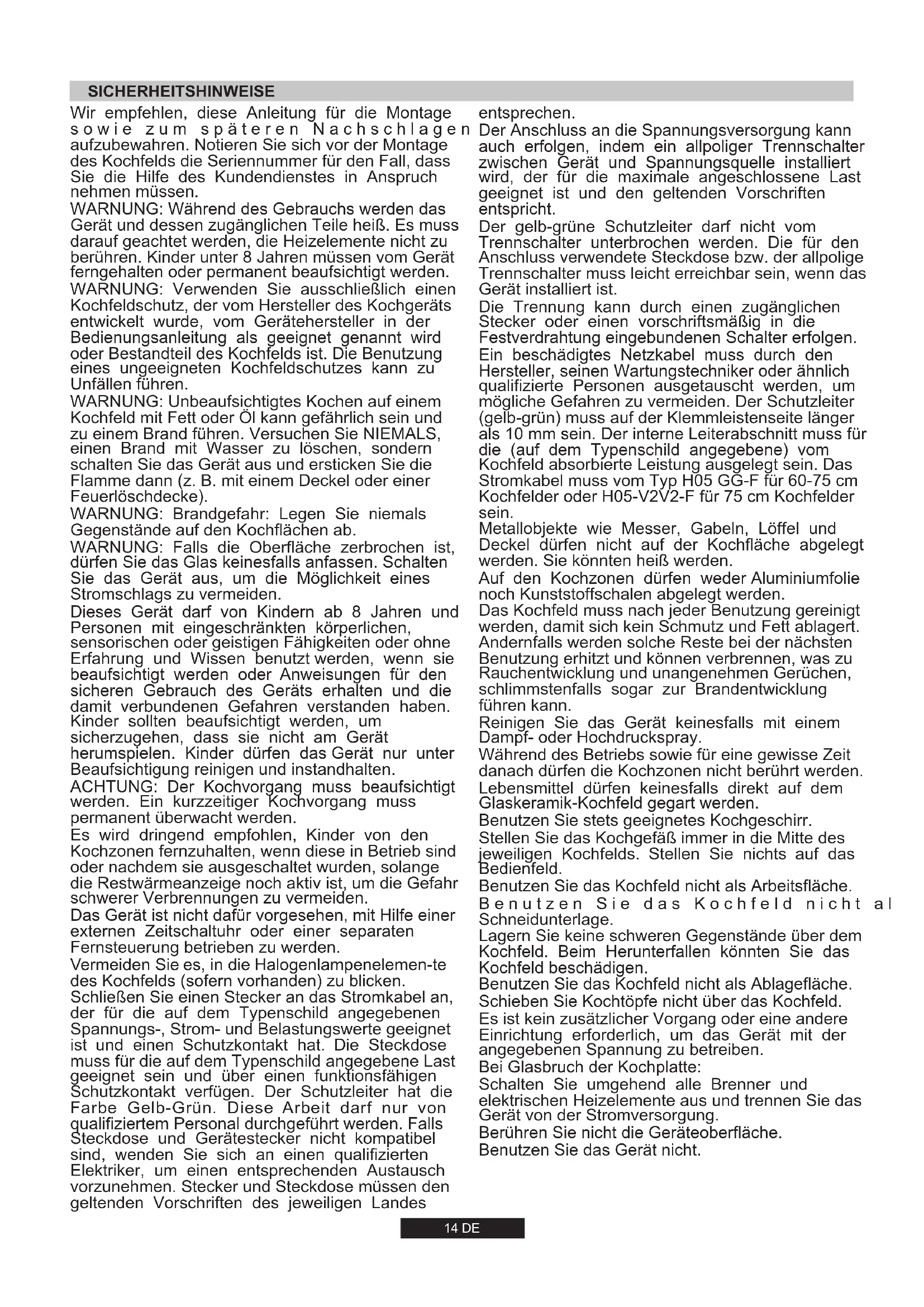 Die Installation eines Haushaltsgeräts kann unter Umständen eine komplexe Arbeit sein; wenn diese nicht korrekt ausgeführt wird, könnte es zu schweren Beeinträchtigungen der Sicherheit des Benutzers kommen. Das ist der Grund, warum sie von einem qualifizierten Fachmann unter Einhaltung der geltenden technischen Regeln durchgeführt werden soll. Falls diese Empfehlung nicht beachtet und die Installation des Gerätes durch eine nicht qualifizierte Person durchgeführt werden sollte, lehnt der Hersteller jede Verantwortung für eventuelle technische Fehler des Produktes ab, gleichviel, ob es zu Schäden an Personen oder Sachen führt. 2.1. ELEKTRISCHER ANSCHLUSS Überprüfen Sie die auf dem Matrikelschild angegebenen Daten. Das Matrikelschild befindet sich auf der unteren Seite des Gerätegehäuses. Notieren Sie alle Daten wie Matrikel- und Seriennummer am besten direkt auf dem Deckblatt der Bedienungsanleitung, da diese Angaben in einem eventuellen Servicefall vom Kundendienst benötigt werden. Überprüfen Sie, dass die Netzspannung und die Leistung für den Betrieb des Gerätes geeignet sind. Vor dem elektrischen Anschluss ist die einwandfreie Erdung der elektrischen Hausinstallation zu prüfen. Die Erdung des Gerätes ist gesetzlich vorgeschrieben. Der Hersteller weist jede Verantwortung für Sach- oder Personenschäden zurück, die auf fehlende bzw. mangelhafte Erdung zurückzuführen sind. Bei den Modellen, die ohne Stecker geliefert werden, ist ein genormter Stecker an das Kabel zu montieren, welcher für die auf das Matrikelschild angegebene Belastung geeignet ist. Der Erdleiter ist durch das gelb-grüne Kabel gekennzeichnet. Der Stecker muss in jedem Fall zugänglich sein. Soll das Gerät an einer festen Anschlussdose angeschlossen werden, ist zwischen dem Gerät und dem Versorgungsnetz eine der Last entsprechende, genormte Abschaltvorrichtung einzubauen. Sollte das Netzkabel beschädigt sein, muss dieser durch einen qualifizierten Fachmann ausgewechselt werden. Der gelb-grüne Erdleiter muss mindestens 10 mm länger sein als die Phasenleiter. Der Querschnitt der Kabel muss der Leistung der Kochmulde entsprechen (s. Matrikelschild). Benutzen Sie ausschließlich ein Netzkabel des Typs 3x0.75 mm² H05 GG-F für 60- 75 cm Kochfelder oder H05-V2V2-F für 75 cm Kochfelder. PHASE ERDE NULL
