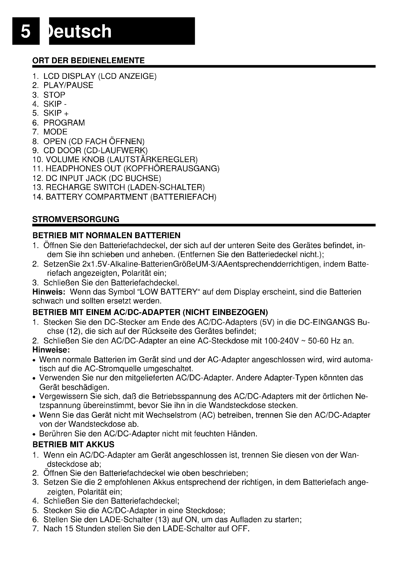 Deutsch Vorsichtsmaßnahmen: Mischen Sie NICHT aufladbare (Nickel-Kadm) und normale (Karbon-Zink) Batt. miteinander. Laden Sie die Akkus NICHT 24 Stunden oder länger auf, ansonsten wird ihre Leistungsfähi- gkeit beeinträchtigt. Versuchen Sie niemals normale Batterien (nicht auf ladbare) aufzuladen. Sie können explo- dieren! Hinweise: Wenn die Akkus zum ersten Mal aufgeladen werden, benötigt man ca. 15 Stunden, bis sie vollständig aufgeladen sind. Vergewissern Sie sich, den LADE-Schalter auf OFF zu stellen und den AC/DC-Adapter aus der Wandsteckdose zu ziehen. Wenn die Betriebsdauer stark nachläßt, auch wenn die Akkus richtig aufgeladen worden sind, kaufen Sie bitte einen neuen Akku-Satz. AUTOMATISCHES AUSSCHALTEN Wenn das Gerät ca. 30 Sekunden lang stoppt, wird die Automatische Ausschalt-Funktion akti- aktiviert und das Gerät wird automatisch ausgeschaltet.
