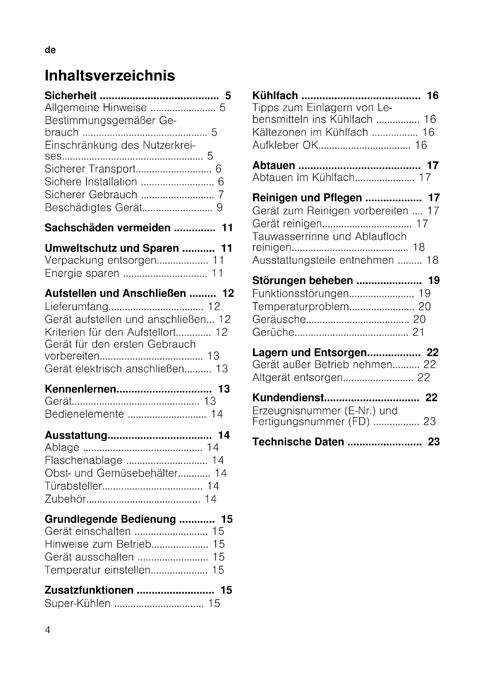 Sicherheit Beachten Sie die Informationen zum Thema Sicherheit, um Ihr Ge- rät sicher gebrauchen zu können. Dieses Gerät entspricht den einschlägigen Sicherheitsbestimmun- gen für Elektrogeräte und ist funkentstört. Allgemeine Hinweise Hier finden Sie allgemeine Informationen zu dieser Anleitung. ¡ Lesen Sie diese Anleitung sorgfältig. Nur dann können Sie das Gerät sicher und effizient verwenden. ¡ Diese Anleitung richtet sich an den Benutzer des Geräts. ¡ Beachten Sie die Sicherheitshinweise und die Warnhinweise. ¡ Bewahren Sie die Anleitung sowie die Produktinformationen für einen späteren Gebrauch oder Nachbesitzer auf. ¡ Prüfen Sie das Gerät nach dem Auspacken. Schließen Sie das Gerät bei einem Transportschaden nicht an. Bestimmungsgemäßer Gebrauch Um das Gerät sicher und richtig zu verwenden, beachten Sie die Hinweise zum bestimmungsgemäßen Gebrauch. Dieses Gerät ist nur für den Einbau bestimmt. Installationsanlei- tung beachten. Verwenden Sie das Gerät nur: ¡ gemäß dieser Gebrauchsanleitung. ¡ um Lebensmitteln zu kühlen. ¡ im privaten Haushalt und in geschlossenen Räumen des häusli- chen Umfelds. ¡ bis zu einer Höhe von maximal 2000m über dem Meeresspie- gel. Einschränkung des Nutzerkreises Vermeiden Sie Risiken für Kinder und gefährdete Personen. Dieses Gerät kann von Kindern ab 8 Jahren und darüber und von Personen mit reduzierten physischen, sensorischen oder menta- len Fähigkeiten oder Mangel an Erfahrung und/oder Wissen be-de Sicherheit