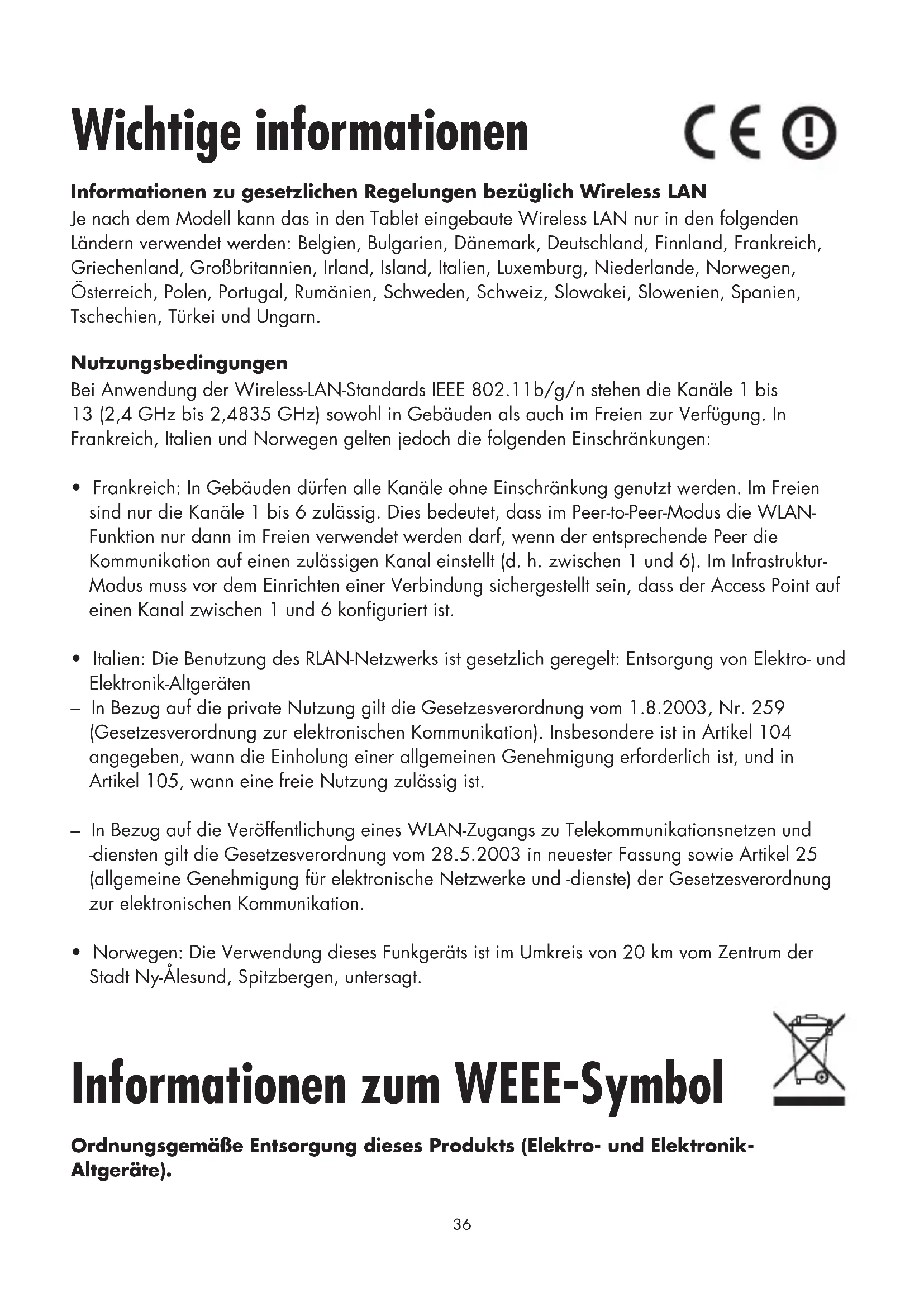 Wichtige informationen Informationen zu gesetzlichen Regelungen bezüglich Wireless LAN Je nach dem Modell kann das in den Tablet eingebaute Wireless LAN nur in den folgenden Ländern verwendet werden: Belgien, Bulgarien, Dänemark, Deutschland, Finnland, Frankreich, Griechenland, Großbritannien, Irland, Island, Italien, Luxemburg, Niederlande, Norwegen, Österreich, Polen, Portugal, Rumänien, Schweden, Schweiz, Slowakei, Slowenien, Spanien, Tschechien, Türkei und Ungarn. Nutzungsbedingungen Bei Anwendung der Wireless-LAN-Standards IEEE 802.11b/g/n stehen die Kanäle 1 bis 13 (2,4 GHz bis 2,4835 GHz) sowohl in Gebäuden als auch im Freien zur Verfügung. In Frankreich, Italien und Norwegen gelten jedoch die folgenden Einschränkungen: