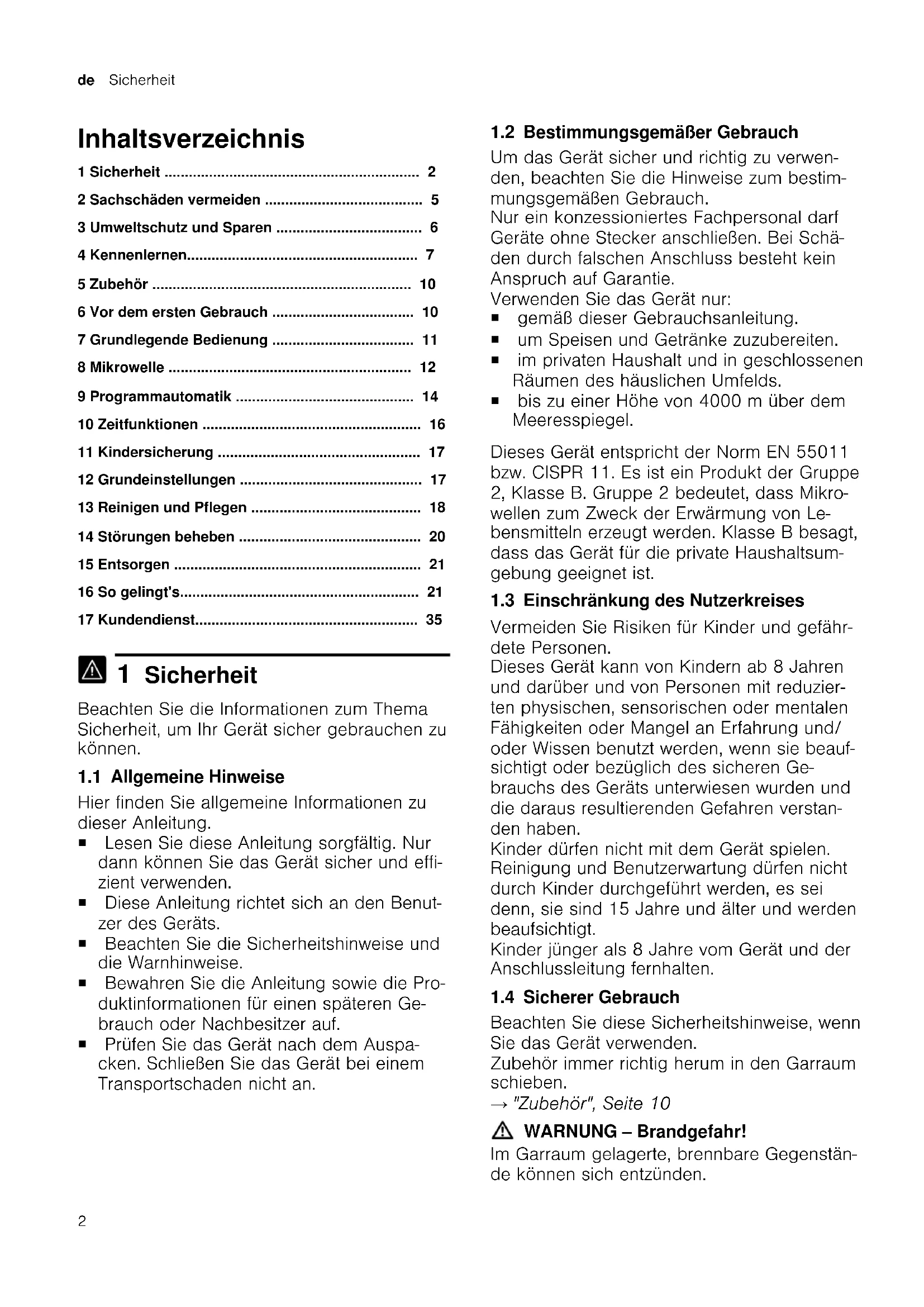 - 17 Kundendienst 1 Sicherheit Beachten Sie die Informationen zum Thema Sicherheit, um Ihr Gerät sicher gebrauchen zu können. 1.1 Allgemeine Hinweise Hier finden Sie allgemeine Informationen zu dieser Anleitung. ¡ Lesen Sie diese Anleitung sorgfältig. Nur dann können Sie das Gerät sicher und effi- zient verwenden. ¡ Diese Anleitung richtet sich an den Benut- zer des Geräts. ¡ Beachten Sie die Sicherheitshinweise und die Warnhinweise. ¡ Bewahren Sie die Anleitung sowie die Pro- duktinformationen für einen späteren Ge- brauch oder Nachbesitzer auf. ¡ Prüfen Sie das Gerät nach dem Auspa- cken. Schließen Sie das Gerät bei einem Transportschaden nicht an. 1.2 Bestimmungsgemäßer Gebrauch Um das Gerät sicher und richtig zu verwen- den, beachten Sie die Hinweise zum bestim- mungsgemäßen Gebrauch. Nur ein konzessioniertes Fachpersonal darf Geräte ohne Stecker anschließen. Bei Schä- den durch falschen Anschluss besteht kein Anspruch auf Garantie. Verwenden Sie das Gerät nur: ¡ gemäß dieser Gebrauchsanleitung. ¡ um Speisen und Getränke zuzubereiten. ¡ im privaten Haushalt und in geschlossenen Räumen des häuslichen Umfelds. ¡ bis zu einer Höhe von 4000m über dem Meeresspiegel. Dieses Gerät entspricht der Norm EN 55011 bzw. CISPR 11. Es ist ein Produkt der Gruppe 2, Klasse B. Gruppe 2 bedeutet, dass Mikro- wellen zum Zweck der Erwärmung von Le- bensmitteln erzeugt werden. Klasse B besagt, dass das Gerät für die private Haushaltsum- gebung geeignet ist. 1.3 Einschränkung des Nutzerkreises Vermeiden Sie Risiken für Kinder und gefähr- dete Personen. Dieses Gerät kann von Kindern ab 8 Jahren und darüber und von Personen mit reduzier- ten physischen, sensorischen oder mentalen Fähigkeiten oder Mangel an Erfahrung und/ oder Wissen benutzt werden, wenn sie beauf- sichtigt oder bezüglich des sicheren Ge- brauchs des Geräts unterwiesen wurden und die daraus resultierenden Gefahren verstan- den haben. Kinder dürfen nicht mit dem Gerät spielen. Reinigung und Benutzerwartung dürfen nicht durch Kinder durchgeführt werden, es sei denn, sie sind 15 Jahre und älter und werden beaufsichtigt. Kinder jünger als 8 Jahre vom Gerät und der Anschlussleitung fernhalten. 1.4 Sicherer Gebrauch Beachten Sie diese Sicherheitshinweise, wenn Sie das Gerät verwenden. Zubehör immer richtig herum in den Garraum schieben. p. 35