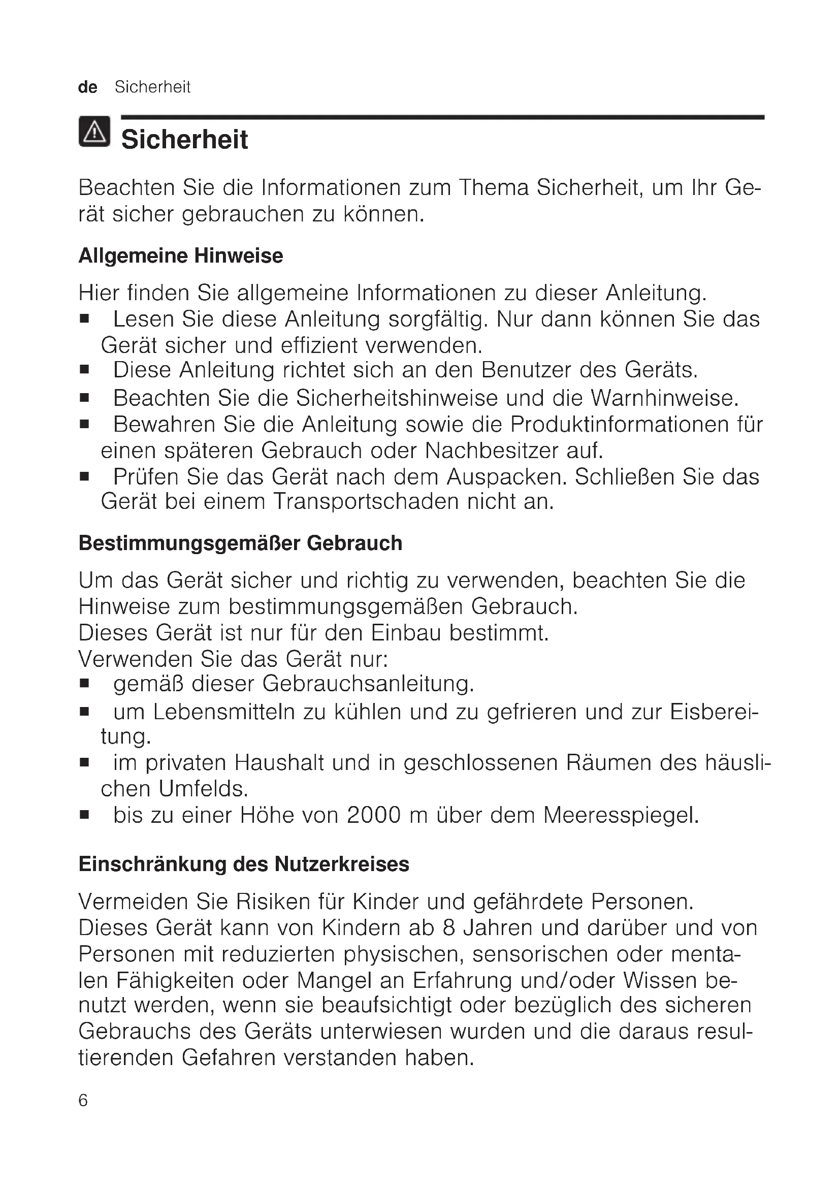 Sicherheit Beachten Sie die Informationen zum Thema Sicherheit, um Ihr Ge- rät sicher gebrauchen zu können. Allgemeine Hinweise Hier finden Sie allgemeine Informationen zu dieser Anleitung. ¡ Lesen Sie diese Anleitung sorgfältig. Nur dann können Sie das Gerät sicher und effizient verwenden. ¡ Diese Anleitung richtet sich an den Benutzer des Geräts. ¡ Beachten Sie die Sicherheitshinweise und die Warnhinweise. ¡ Bewahren Sie die Anleitung sowie die Produktinformationen für einen späteren Gebrauch oder Nachbesitzer auf. ¡ Prüfen Sie das Gerät nach dem Auspacken. Schließen Sie das Gerät bei einem Transportschaden nicht an. Bestimmungsgemäßer Gebrauch Um das Gerät sicher und richtig zu verwenden, beachten Sie die Hinweise zum bestimmungsgemäßen Gebrauch. Dieses Gerät ist nur für den Einbau bestimmt. Verwenden Sie das Gerät nur: ¡ gemäß dieser Gebrauchsanleitung. ¡ um Lebensmitteln zu kühlen und zu gefrieren und zur Eisberei- tung. ¡ im privaten Haushalt und in geschlossenen Räumen des häusli- chen Umfelds. ¡ bis zu einer Höhe von 2000m über dem Meeresspiegel. Einschränkung des Nutzerkreises Vermeiden Sie Risiken für Kinder und gefährdete Personen. Dieses Gerät kann von Kindern ab 8 Jahren und darüber und von Personen mit reduzierten physischen, sensorischen oder menta- len Fähigkeiten oder Mangel an Erfahrung und/oder Wissen be- nutzt werden, wenn sie beaufsichtigt oder bezüglich des sicheren Gebrauchs des Geräts unterwiesen wurden und die daraus resul- tierenden Gefahren verstanden haben.Sicherheit de