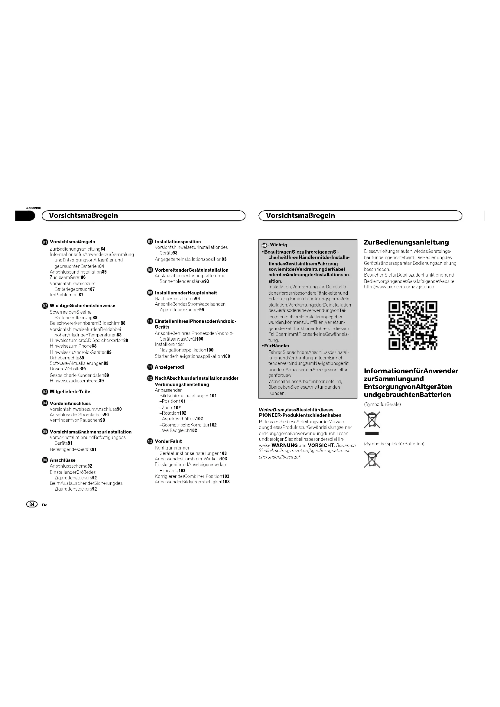 <CRD4765-A>83Black plate (84,1) Vorsichtsmaßregeln Zur Bedienungsanleitung 84 Informationen für Anwender zur Sammlung und Entsorgung von Altgeräten und gebrauchten Batterien 84 Anschluss und Installation 85 Zu diesem Gerät 86 Vorsichtshinweise zum Batteriegebrauch 87 Im Problemfall 87 Wichtige Sicherheitshinweise So vermeiden Sie eine Batterieentleerung 88 Bei schwer erkennbarem Bildschirm 88 Vorsichtshinweise für den Betrieb bei hohen/niedrigen Temperaturen 88 Hinweise zu microSD-Speicherkarten 88 Hinweise zum iPhone 88 Hinweise zu Android-Geräten 89 Urheberrechte 89 Software-Aktualisierungen 89 Unsere Website 89 Gespeicherte Kundendaten 89 Hinweise zu diesem Gerät 89 Mitgelieferte Teile Vor dem Anschluss Vorsichtshinweise zum Anschluss 90 Anschluss des Stromkabels 90 Verhindern von Rauschen 90 Vorsichtsmaßnahmen zur Installation Vor der Installation und Befestigung des Geräts 91 Befestigen des Geräts 91 Anschlüsse Anschlussschema 92 Einstellen der Größe des Zigarettensteckers 92 Beim Austauschen der Sicherung des Zigarettensteckers 92 Installationsposition Vorsichtshinweise zur Installation des Geräts 93 Angegebene Installationsposition 93 Vorbereiten der Geräteinstallation Austauschen der Justierplatte für die Sonnenblendenstärke 93 Installieren der Haupteinheit Nach der Installation 99 Anschließen des Stromkabels an den Zigarettenanzünder 99 Einstellen Ihres iPhones oder Android- Geräts Anschließen Ihres iPhones oder Android- Geräts an das Gerät 100 Installieren der Navigationsapplikation 100 Starten der Navigationsapplikation 100 Anzeigemodi Nach Abschluss der Installation und der Verbindungsherstellung Anpassen der Bildschirmeinstellungen 101 – Position 101 – Zoom 102 – Rotation 102 – Aspektverhältnis 102 – Geometrische Korrektur 102 – Weißabgleich 102 Vor der Fahrt Konfigurieren der Gerätefunktionseinstellungen 103 Anpassen des Combiner-Winkels 103 Einsteigen in und Aussteigen aus dem Fahrzeug 103 Korrigieren der Combiner-Position 103 Anpassen der Bildschirmhelligkeit 103 Wichtig ! Beauftragen Sie zu Ihrer eigenen Si- cherheit Ihren Händler mit der Installa- tion des Geräts in Ihrem Fahrzeug sowie mit der Verdrahtung der Kabel oder der Änderung der Installationspo- sition. Installation, Verdrahtung und Deinstalla- tion erfordern besondere Fähigkeiten und Erfahrung. Eine nicht ordnungsgemäße In- stallation, Verdrahtung oder Deinstallation des Geräts oder eine Verwendung von Tei- len, die nicht vom Hersteller angegeben wurden, könnten zu Unfällen, Verletzun- gen oder Fehlfunktionen führen. In diesem Fall übernimmt Pioneer keine Gewährleis- tung. ! Für Händler Fahren Sie nach dem Abschluss der Instal- lation und Verdrahtung mit dem Einrich- ten der Verbindung zum Navigationsgerät und dem Anpassen der Anzeigeeinstellun- gen fort usw. Wenn alle diese Arbeiten beendet sind, übergeben Sie diese Anleitung an den Kunden. Vielen Dank, dass Sie sich für dieses PIONEER-Produkt entschieden haben Bitte lesen Sie diese Anleitung vor der Verwen- dung dieses Produkts zur Gewährleistung seiner ordnungsgemäßen Verwendung durch. Lesen und befolgen Sie dabei insbesondere die Hin- weise WARNUNG und VORSICHT. Bewahren Sie die Anleitung zur zukünftigen Bezugnahme si- cher und griffbereit auf. Zur Bedienungsanleitung Diese Anleitung erläutert, wie das Gerät einge- baut und eingerichtet wird. Die Bedienung des Geräts ist in der separaten Bedienungsanleitung beschrieben. Besuchen Sie für Details zu den Funktionen und Bedienvorgängen des Geräts folgende Website: http://www.pioneer.eu/navgatehud Informationen für Anwender zur Sammlung und Entsorgung von Altgeräten und gebrauchten Batterien (Symbol für Geräte) (Symbolbeispiele für Batterien) Vorsichtsmaßregeln