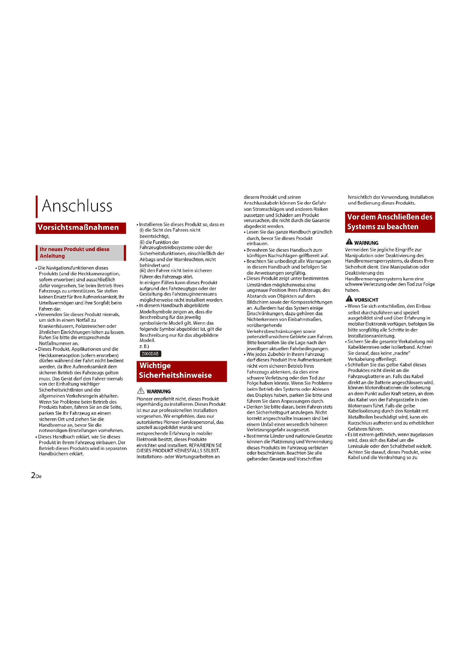 - Die Navigationsfunktionen dieses Produkts (und die Heckkameraoption, sofern erworben) sind ausschließlich dafür vorgesehen, Sie beim Betrieb Ihres Fahrzeugs zu unterstützen. Sie stellen keinen Ersatz für Ihre Aufmerksamkeit, Ihr Urteilsvermögen und Ihre Sorgfalt beim Fahren dar.• Verwenden Sie dieses Produkt niemals, um sich in einem Notfall zu Krankenhäusern, Polizeiwachen oder ähnlichen Einrichtungen leiten zu lassen. Rufen Sie bitte die entsprechende Notfallnummer an.• Dieses Produkt, Applikationen und die Heckkameraoption (sofern erworben) dürfen während der Fahrt nicht bedient werden, da Ihre Aufmerksamkeit dem sicheren Betrieb des Fahrzeugs gelten muss. Das Gerät darf den Fahrer niemals von der Einhaltung wichtiger Sicherheitsrichtlinien und der allgemeinen Verkehrsregeln abhalten. Wenn Sie Probleme beim Betrieb des Produkts haben, fahren Sie an die Seite, parken Sie Ihr Fahrzeug an einem sicheren Ort und ziehen Sie die Handbremse an, bevor Sie die notwendigen Einstellungen vornehmen.• Dieses Handbuch erklärt, wie Sie dieses Produkt in Ihrem Fahrzeug einbauen. Der Betrieb dieses Produkts wird in separaten Handbüchern erklärt.• Installieren Sie dieses Produkt so, dass es(i) die Sicht des Fahrers nicht beeinträchtigt,(ii) die Funktion der Fahrzeugbetriebssysteme oder der Sicherheitsfunktionen, einschließlich der Airbags und der Warnleuchten, nicht behindert und(iii) den Fahrer nicht beim sicheren Führen des Fahrzeugs stört.In einigen Fällen kann dieses Produkt aufgrund des Fahrzeugtyps oder der Gestaltung des Fahrzeuginnenraums möglicherweise nicht installiert werden.• In diesem Handbuch abgebildete Modellsymbole zeigen an, dass die Beschreibung für das jeweilig symbolisierte Modell gilt. Wenn das folgende Symbol abgebildet ist, gilt die Beschreibung nur für das abgebildete Modell.z. B.) WARNUNG Pioneer empfiehlt nicht, dieses Produkt eigenhändig zu installieren. Dieses Produkt ist nur zur professionellen Installation vorgesehen. Wir empfehlen, dass nur autorisiertes Pioneer-Servicepersonal, das speziell ausgebildet wurde und entsprechende Erfahrung in mobiler Elektronik besitzt, dieses Produkte einrichtet und installiert. REPARIEREN SIE DIESES PRODUKT KEINESFALLS SELBST. Installations- oder Wartungsarbeiten an Anschluss Vorsichtsmaßnahmen Ihr neues Produkt und diese Anleitung Wichtige Sicherheitshinweise Z000DABdiesem Produkt und seinen Anschlusskabeln können Sie der Gefahr von Stromschlägen und anderen Risiken aussetzen und Schäden am Produkt verursachen, die nicht durch die Garantie abgedeckt werden.• Lesen Sie das ganze Handbuch gründlich durch, bevor Sie dieses Produkt einbauen.• Bewahren Sie dieses Handbuch zum künftigen Nachschlagen griffbereit auf.• Beachten Sie unbedingt alle Warnungen in diesem Handbuch und befolgen Sie die Anweisungen sorgfältig.• Dieses Produkt zeigt unter bestimmten Umständen möglicherweise eine ungenaue Position Ihres Fahrzeugs, des Abstands von Objekten auf dem Bildschirm sowie der Kompassrichtungen an. Außerdem hat das System einige Einschränkungen, dazu gehören das Nichterkennen von Einbahnstraßen, vorübergehende Verkehrsbeschränkungen sowie potenziell unsichere Gebiete zum Fahren. Bitte beurteilen Sie die Lage nach den jeweiligen aktuellen Fahrbedingungen.• Wie jedes Zubehör in Ihrem Fahrzeug darf dieses Produkt Ihre Aufmerksamkeit nicht vom sicheren Betrieb Ihres Fahrzeugs ablenken, da dies eine schwere Verletzung oder den Tod zur Folge haben könnte. Wenn Sie Probleme beim Betrieb des Systems oder Ablesen des Displays haben, parken Sie bitte und führen Sie dann Anpassungen durch.• Denken Sie bitte daran, beim Fahren stets den Sicherheitsgurt anzulegen. Nicht korrekt angeschnallte Insassen sind bei einem Unfall einer wesentlich höheren Verletzungsgefahr ausgesetzt.• Bestimmte Länder und nationale Gesetze können die Platzierung und Verwendung dieses Produkts im Fahrzeug verbieten oder beschränken. Beachten Sie alle geltenden Gesetze und Vorschriften hinsichtlich der Verwendung, Installation und Bedienung dieses Produkts. WARNUNG Vermeiden Sie jegliche Eingriffe zur Manipulation oder Deaktivierung des Handbremsensperrsystems, da dieses Ihrer Sicherheit dient. Eine Manipulation oder Deaktivierung des Handbremsensperrsystems kann eine schwere Verletzung oder den Tod zur Folge haben. VORSICHT