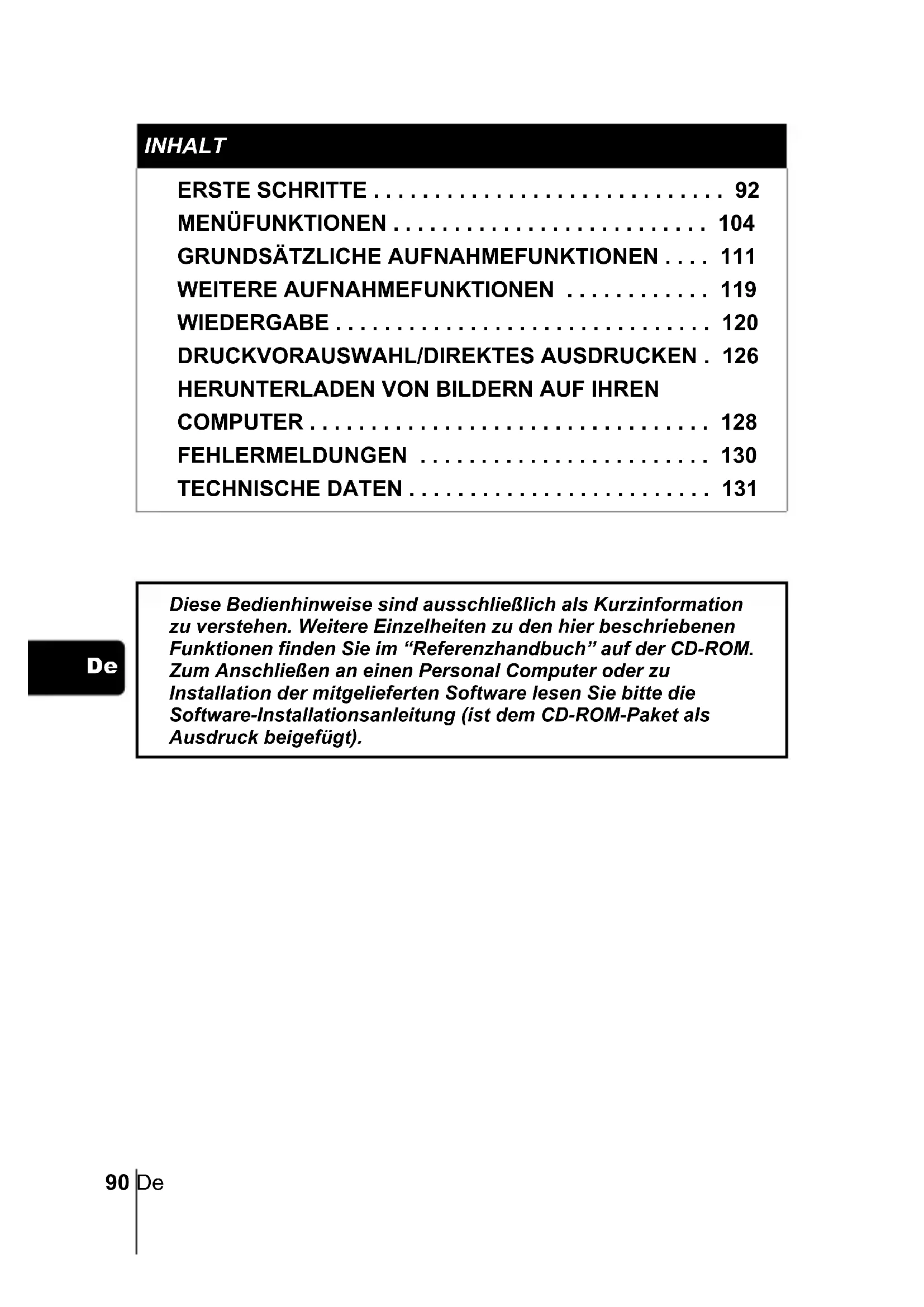 COMPUTER . . . . . . . . . . . . . . . . . . . . . . . . . . . . . . . . . 128 FEHLERMELDUNGEN . . . . . . . . . . . . . . . . . . . . . . . . 130 TECHNISCHE DATEN . . . . . . . . . . . . . . . . . . . . . . . . . 131 Diese Bedienhinweise sind ausschließlich als Kurzinformation zu verstehen. Weitere Einzelheiten zu den hier beschriebenen Funktionen finden Sie im “Referenzhandbuch” auf der CD-ROM. Zum Anschließen an einen Personal Computer oder zu Installation der mitgelieferten Software lesen Sie bitte die Software-Installationsanleitung (ist dem CD-ROM-Paket als Ausdruck beigefügt). x215_Basic.book 90 ページ 2003年11月26日 水曜日 午後2時47分De De 91 J Lesen Sie sich dieses Handbuch sorgfältig durch, bevor Sie die Kamera benutzen, um eine ordnungsgemäße Bedienung zu gewährleisten. J Wir empfehlen, vor wichtigen Aufnahmen Probeaufnahmen vorzunehmen, um sich mit der Bedienung und den Funktionen der Kamera vertraut zu machen. J Diese Bedienhinweise sind lediglich als einfache Anleitung zu verstehen. Weitere Einzelheiten zu den hier beschriebenen Funktionen finden Sie im Referenzhandbuch auf der CD-ROM. Für Kunden in Nord- und Südamerika Für Kunden in den USA Betriebserlaubnis Modellnummer : D-580ZOOM/C-460ZOOM/X-400 Markenname : OLYMPUS Verantwortlicher Hersteller : Olympus America Inc. Adresse : 2 Corporate Center Drive, Melville, New York11747-3157, USA Telefonnummer : 1-631-844-5000 Auf Übereinstimmung mit den FCC-Bestimmungen geprüft. FÜR DEN HEIM- UND BÜROGEBRAUCH Dieses Gerät erfüllt die Auflagen unter Abschnitt 15 der FCC-Bestimmungen. Das Betreiben dieses Geräts ist zulässig, wenn die nachfolgend genannten Auflagen erfüllt werden: (1) Von diesem Gerät dürfen keine schädlichen Störeinstreuungen ausgehen. (2) Dieses Gerät muss die Einwirkung von Störeinstreuungen zulassen. Dies schließt Störeinstreuungen ein, welche Beeinträchtigungen der Funktionsweise oder Betriebsstörungen verursachen können. Für Kunden in Kanada Dieses digitale Gerät der Klasse B erfüllt alle Anforderungen der Vorschriften für Geräte, die Störeinstreuungen verursachen. Für Kunden in Europa Warenzeichen