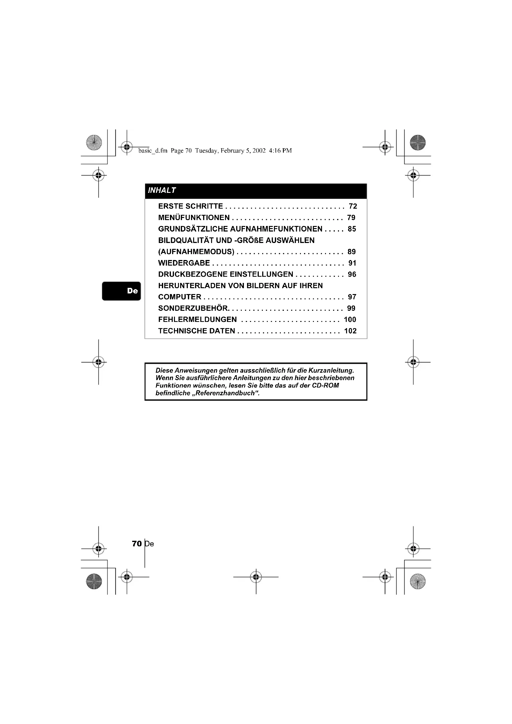 - TECHNISCHE DATEN Diese Anweisungen gelten ausschließlich für die Kurzanleitung. Wenn Sie ausführlichere Anleitungen zu den hier beschriebenen Funktionen wünschen, lesen Sie bitte das auf der CD-ROM befindliche „Referenzhandbuch“. basic_d.fm Page 70 Tuesday, February 5, 2002 4:16 PMDe 71 p. 102