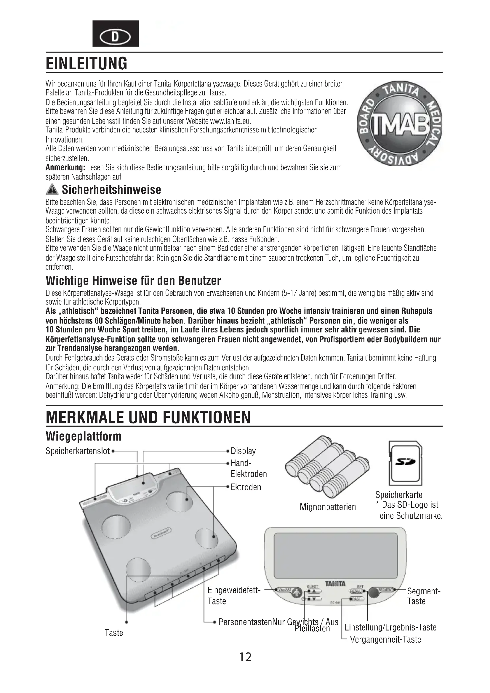 appears while measuring. Reading cannot be obtained if the weight capacity is exceeded. Specifications BC-601 Weight Capacity 150kg (330lb) (23st 8lb) Weight Increments 0.1kg (0.2lb) (0.2lb) Body Fat Increments 0.1% Personal Data 4 memories Power Supply 4 AA batteries (included) Power Consumption 150 mA maximum Measuring Current 50 kHz, 100 μA TROUBLESHOOTING Federal Communications Commission and Canadian ICES Notice This equipment has been tested and found to comply with the limits for a Class B digital device, pursuant to Part 15 of the FCC Rules and Canadian ICES-003. These limits are designed to provide reasonable protection against harmful interference in a residential installation. This equipment generates, uses and can radiate radio frequency energy and, if not installed and used in accordance with the instructions, may cause harmful interference to radio communications. However, there is no guarantee that interference will not occur in a particular installation. If this equipment does cause harmful interference to radio or television reception, which can be determined by turning the equipment off and on, the user is encouraged to try to correct the interference by one or more of the following measures: • Reorient or relocate the receiving antenna.• Increase the separation between the equipment and receiver.• Connect the equipment into an outlet on a circuit different from that to which the receiver is connected.• Consult the dealer or an experienced radio or television technician for help.Modifications The FCC requires the user to be notified that any changes or modifications made to this device that are not expressly approved by Tanita Corporation may void the user’s authority to operate the equipment.12 Wir bedanken uns für Ihren Kauf einer Tanita-Körperfettanalysewaage. Dieses Gerät gehört zu einer breiten Palette an Tanita-Produkten für die Gesundheitspflege zu Hause. Die Bedienungsanleitung begleitet Sie durch die Installationsabläufe und erklärt die wichtigsten Funktionen. Bitte bewahren Sie diese Anleitung für zukünftige Fragen gut erreichbar auf. Zusätzliche Informationen über einen gesunden Lebensstil finden Sie auf unserer Website www.tanita.eu. Tanita-Produkte verbinden die neuesten klinischen Forschungserkenntnisse mit technologischen Innovationen. Alle Daten werden vom medizinischen Beratungsausschuss von Tanita überprüft, um deren Genauigkeit sicherzustellen. Anmerkung: Lesen Sie sich diese Bedienungsanleitung bitte sorgfältig durch und bewahren Sie sie zum späteren Nachschlagen auf. Sicherheitshinweise Bitte beachten Sie, dass Personen mit elektronischen medizinischen Implantaten wie z.B. einem Herzschrittmacher keine Körperfettanalyse- Waage verwenden sollten, da diese ein schwaches elektrisches Signal durch den Körper sendet und somit die Funktion des Implantats beeinträchtigen könnte. Schwangere Frauen sollten nur die Gewichtfunktion verwenden. Alle anderen Funktionen sind nicht für schwangere Frauen vorgesehen. Stellen Sie dieses Gerät auf keine rutschigen Oberflächen wie z.B. nasse Fußböden. Bitte verwenden Sie die Waage nicht unmittelbar nach einem Bad oder einer anstrengenden körperlichen Tätigkeit. Eine feuchte Standfläche der Waage stellt eine Rutschgefahr dar. Reinigen Sie die Standfläche mit einem sauberen trockenen Tuch, um jegliche Feuchtigkeit zu entfernen. Wichtige Hinweise für den Benutzer Diese Körperfettanalyse-Waage ist für den Gebrauch von Erwachsenen und Kindern (5-17 Jahre) bestimmt, die wenig bis mäßig aktiv sind sowie für athletische Körpertypen. Als „athletisch“ bezeichnet Tanita Personen, die etwa 10 Stunden pro Woche intensiv trainieren und einen Ruhepuls von höchstens 60 Schlägen/Minute haben. Darüber hinaus bezieht „athletisch“ Personen ein, die weniger als 10 Stunden pro Woche Sport treiben, im Laufe ihres Lebens jedoch sportlich immer sehr aktiv gewesen sind. Die Körperfettanalyse-Funktion sollte von schwangeren Frauen nicht angewendet, von Profisportlern oder Bodybuildern nur zur Trendanalyse herangezogen werden. Durch Fehlgebrauch des Geräts oder Stromstöße kann es zum Verlust der aufgezeichneten Daten kommen. Tanita übernimmt keine Haftung für Schäden, die durch den Verlust von aufgezeichneten Daten entstehen. Darüber hinaus haftet Tanita weder für Schäden und Verluste, die durch diese Geräte entstehen, noch für Forderungen Dritter. Anmerkung: Die Ermittlung des Körperfetts variiert mit der im Körper vorhandenen Wassermenge und kann durch folgende Faktoren beeinflußt werden: Dehydrierung oder Überhydrierung wegen Alkoholgenuß, Menstruation, intensives körperliches Training usw. EINLEITUNG