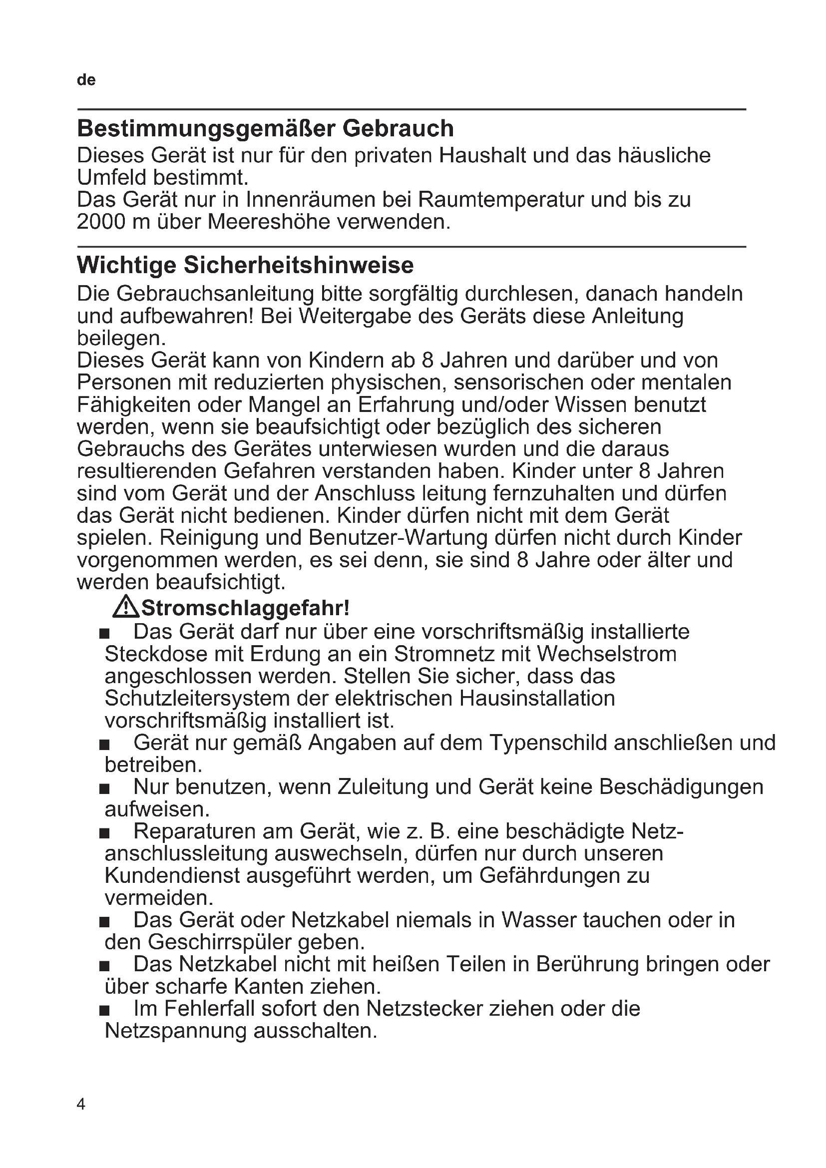 Bestimmungsgemäßer Gebrauch Dieses Gerät ist nur für den privaten Haushalt und das häusliche Umfeld bestimmt. Das Gerät nur in Innenräumen bei Raumtemperatur und bis zu 2000 m über Meereshöhe verwenden. Wichtige Sicherheitshinweise Die Gebrauchsanleitung bitte sorgfältig durchlesen, danach handeln und aufbewahren! Bei Weitergabe des Geräts diese Anleitung beilegen. Dieses Gerät kann von Kindern ab 8 Jahren und darüber und von Personen mit reduzierten physischen, sensorischen oder mentalen Fähigkeiten oder Mangel an Erfahrung und/oder Wissen benutzt werden, wenn sie beaufsichtigt oder bezüglich des sicheren Gebrauchs des Gerätes unterwiesen wurden und die daraus resultierenden Gefahren verstanden haben. Kinder unter 8 Jahren sind vom Gerät und der Anschluss leitung fernzuhalten und dürfen das Gerät nicht bedienen. Kinder dürfen nicht mit dem Gerät spielen. Reinigung und Benutzer-Wartung dürfen nicht durch Kinder vorgenommen werden, es sei denn, sie sind 8 Jahre oder älter und werden beaufsichtigt. W Stromschlaggefahr! ■ Das Gerät darf nur über eine vorschriftsmäßig installierte Steckdose mit Erdung an ein Stromnetz mit Wechselstrom angeschlossen werden. Stellen Sie sicher, dass das Schutzleitersystem der elektrischen Hausinstallation vorschriftsmäßig installiert ist. ■ Gerät nur gemäß Angaben auf dem Typenschild anschließen und betreiben. ■ Nur benutzen, wenn Zuleitung und Gerät keine Beschädigungen aufweisen. ■ Reparaturen am Gerät, wie z. B. eine beschädigte Netz- anschlussleitung auswechseln, dürfen nur durch unseren Kundendienst ausgeführt werden, um Gefährdungen zu vermeiden. ■ Das Gerät oder Netzkabel niemals in Wasser tauchen oder in den Geschirrspüler geben. ■ Das Netzkabel nicht mit heißen Teilen in Berührung bringen oder über scharfe Kanten ziehen. ■ Im Fehlerfall sofort den Netzstecker ziehen oder die Netzspannung ausschalten.5