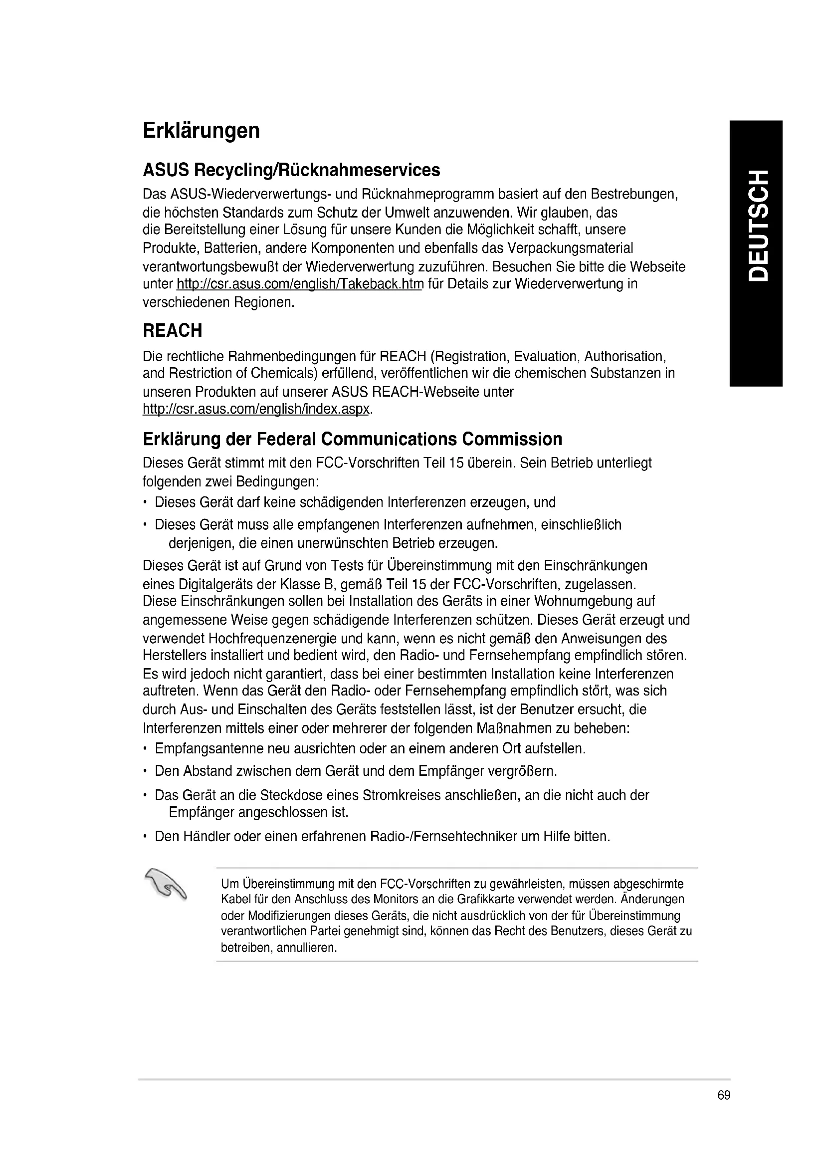 - Kapitel.7. Problembehandlung Problembehandlung 9 DEUTSCH DEUTSCH DEUTSCH DEUTSCH Erklärungen ASUS.Recycling/Rücknahmeservices Das ASUS-Wiederverwertungs- und Rücknahmeprogramm basiert auf den Bestrebungen, die höchsten Standards zum Schutz der Umwelt anzuwenden. Wir glauben, das die Bereitstellung einer Lösung für unsere Kunden die Möglichkeit schafft, unsere Produkte, Batterien, andere Komponenten und ebenfalls das Verpackungsmaterial verantwortungsbewußt der Wiederverwertung zuzuführen. Besuchen Sie bitte die Webseite unter http://csr.asus.com/english/Takeback.htm für Details zur Wiederverwertung in verschiedenen Regionen. REACH Die rechtliche Rahmenbedingungen für REACH (Registration, Evaluation, Authorisation, and Restriction of Chemicals) erfüllend, veröffentlichen wir die chemischen Substanzen in unseren Produkten auf unserer ASUS REACH-Webseite unter http://csr.asus.com/english/index.aspx. Erklärung.der.Federal.Communications.Commission Dieses Gerät stimmt mit den FCC-Vorschriften Teil 15 überein. Sein Betrieb unterliegt folgenden zwei Bedingungen: p. 1216